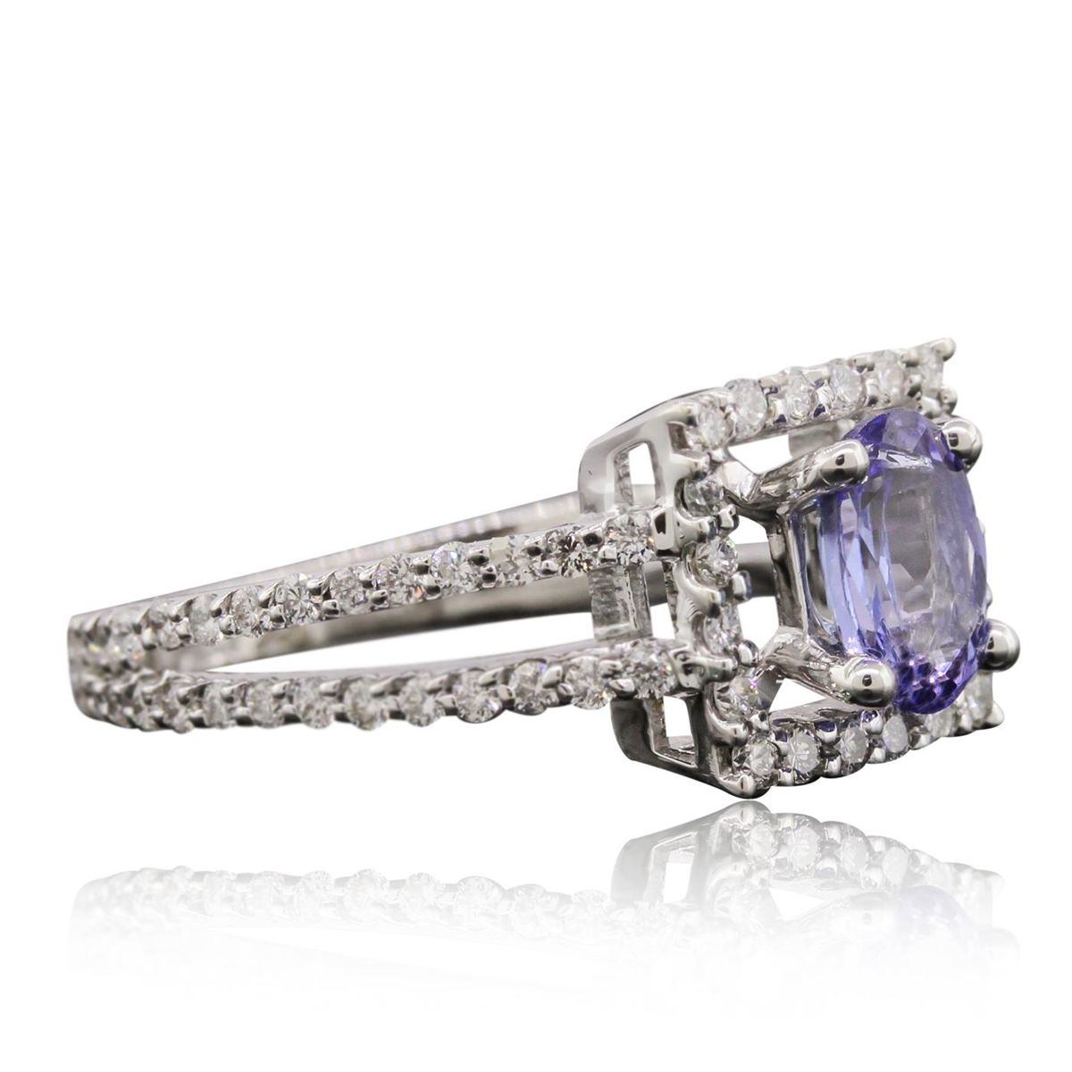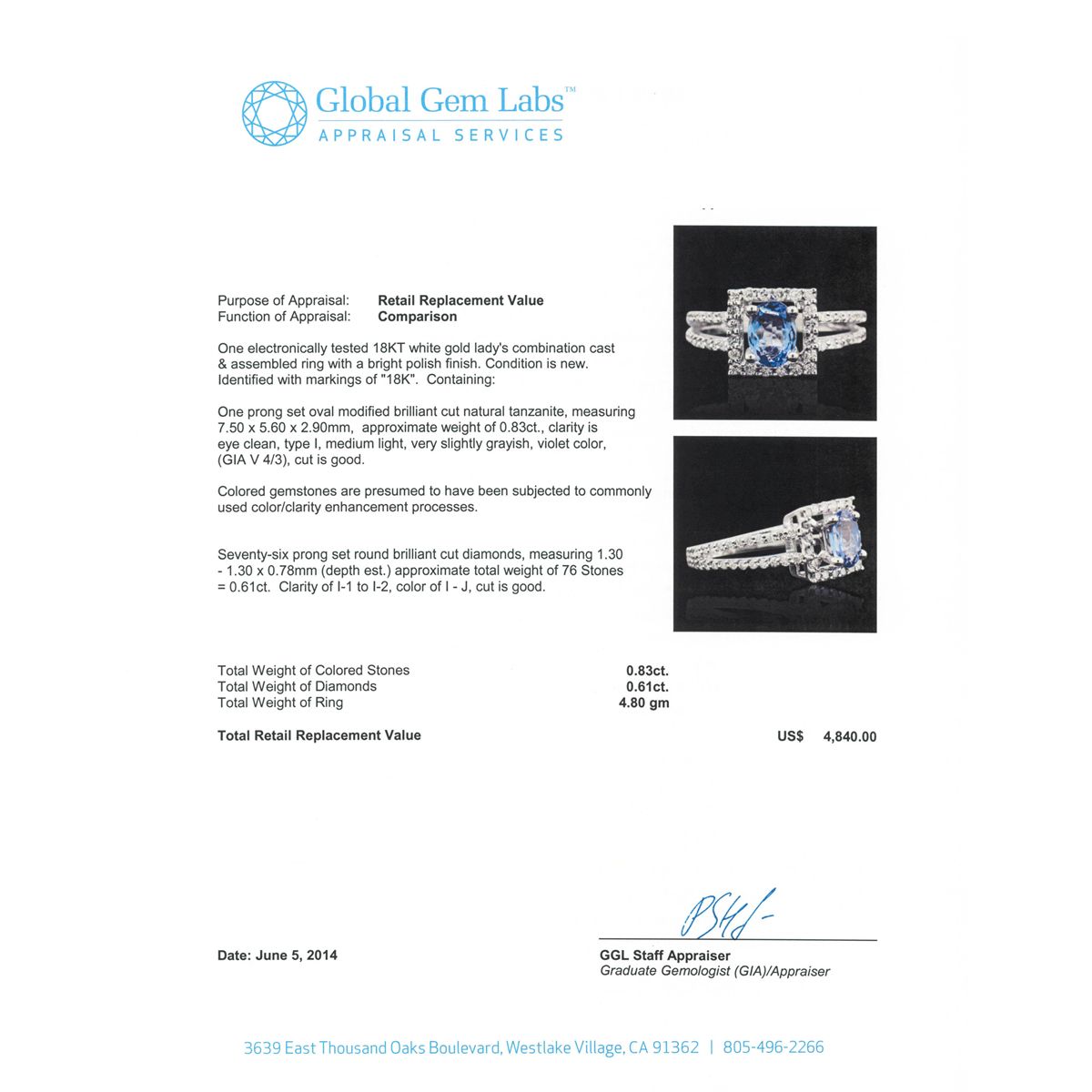One electronically tested 18KT white gold Ladies combination cast & assembled ring with a bright polish finish. Condition is new. Identified with markings of "18K". Containing: One prong set oval modified brilliant cut natural tanzanite, measuring 7.50 x 5.60 x 2.90mm, approximate weight of 0.83ct., clarity is eye clean, type I, medium light, very slightly grayish, violet color, (GIA V 4/3), cut is good. Colored gemstones are presumed to have been subjected to commonly used color/clarity enhancement processes. Seventy-Six prong set round brilliant cut diamonds, measuring 1.30 - 1.30 x 0.78mm (depth est.) approximate. Total Weight of 76 Stones = 0.61ct. Clarity: I-1 to I-2. Color: I - J, Cut is Good. Total Weight of Colored Stones 0.83ct. Total Weight of Diamonds 0.61ct. Total Weight of Ring 4.80 grams. GGL Appraised at $4,840.00.