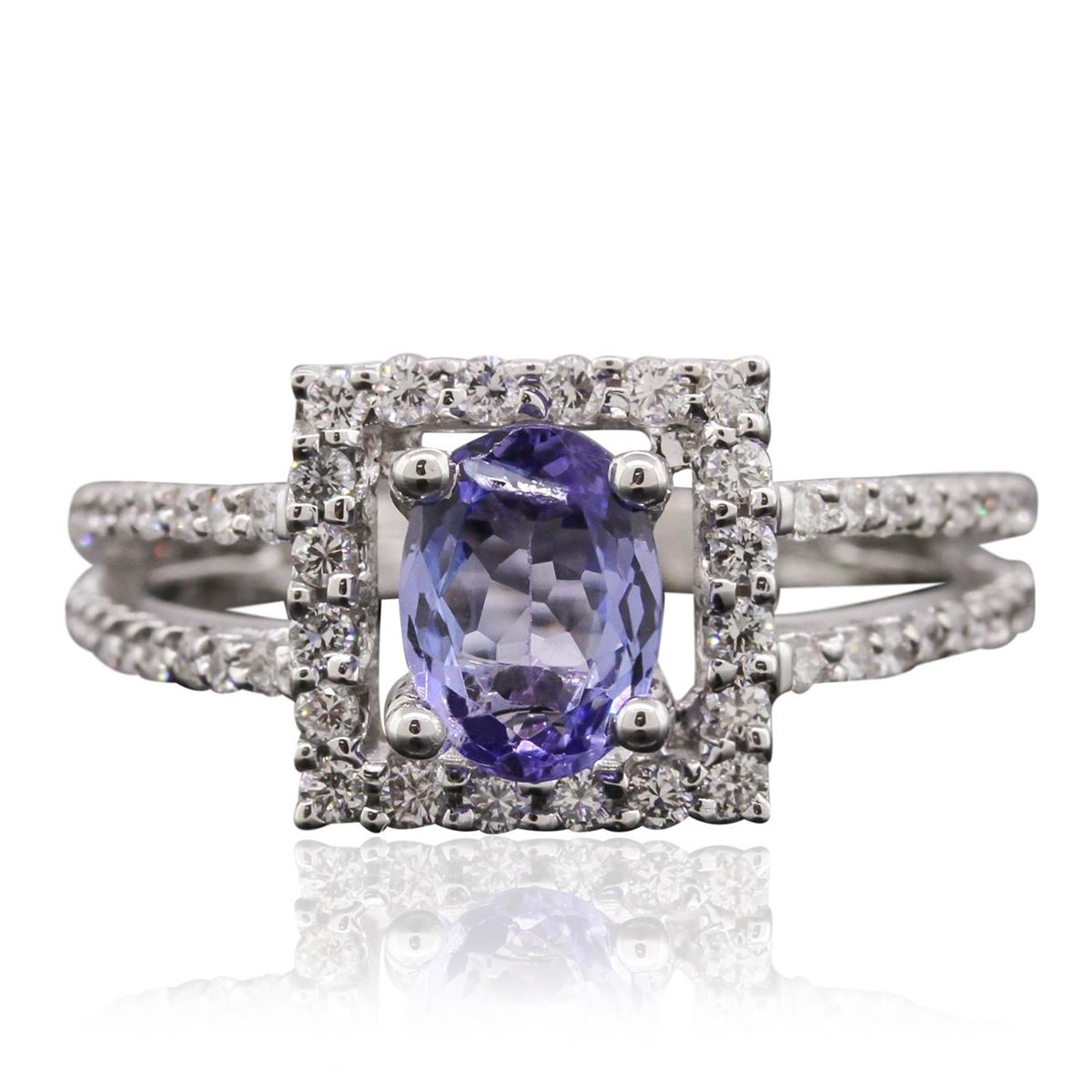 One electronically tested 18KT white gold Ladies combination cast & assembled ring with a bright polish finish. Condition is new. Identified with markings of "18K". Containing: One prong set oval modified brilliant cut natural tanzanite, measuring 7.50 x 5.60 x 2.90mm, approximate weight of 0.83ct., clarity is eye clean, type I, medium light, very slightly grayish, violet color, (GIA V 4/3), cut is good. Colored gemstones are presumed to have been subjected to commonly used color/clarity enhancement processes. Seventy-Six prong set round brilliant cut diamonds, measuring 1.30 - 1.30 x 0.78mm (depth est.) approximate. Total Weight of 76 Stones = 0.61ct. Clarity: I-1 to I-2. Color: I - J, Cut is Good. Total Weight of Colored Stones 0.83ct. Total Weight of Diamonds 0.61ct. Total Weight of Ring 4.80 grams. GGL Appraised at $4,840.00.