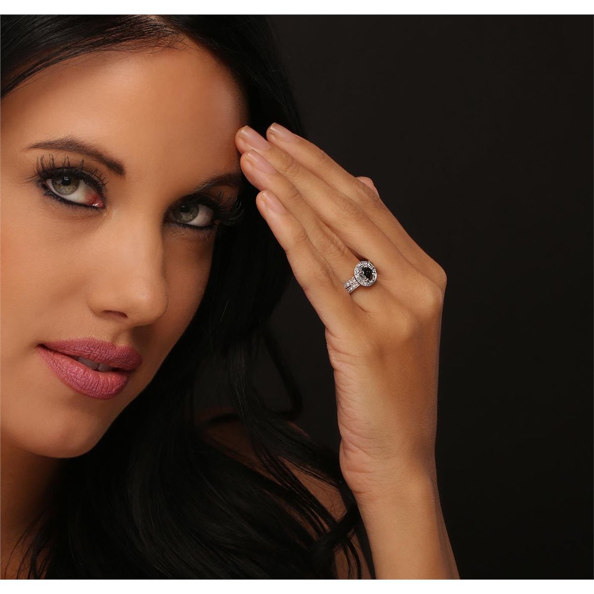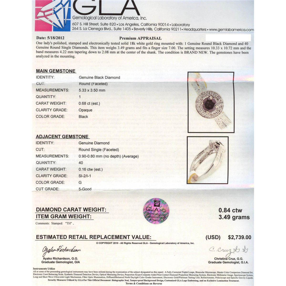 One Ladies polished, stamped, and electronically tested solid 18KT White Gold ring mounted with: 1 Genuine Round Black Diamond and 40 Genuine Round Single Diamonds. This item weighs 3.49 grams and fits a finger size 7.00. The setting measures 10.33 x 10.72mm and the band measures 4.22mm tapering down to 2.08mm at the center of the shank. The condition is brand new. The gemstones have been analyzed in the mounting. Main Gemstone Identity Genuine Black Diamond. Cut Round (Faceted). Measurements 5.33 x 3.50mm. Quantity 1. Carat Weight 0.68ct (est.) Clarity Grade Opaque. Color Grade Black. Adjacent Gemstone Identity Genuine Diamond. Cut Round Single (Faceted). Measurements 0.90-0.80mm (no depth) (Average). Quantity 40. Carat Weight 0.16ctw (est.) Clarity Grade SI-2/I-1. Color Grade G. Cut Grade 5 - Good. Diamond Carat Weight 0.84ctw. Item Gram Weight 3.49 grams. GLA Appraised at $2,739.00.