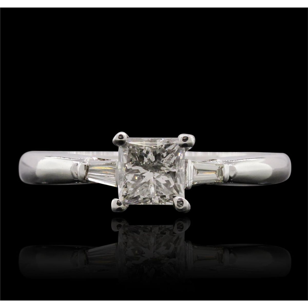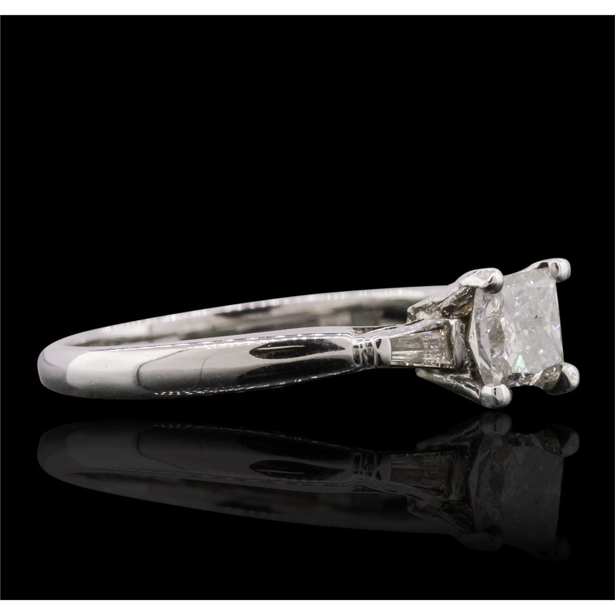 One electronically tested 18KT white gold ladies cast diamond unity ring with a bright polish finish. Condition is new, good workmanship. The featured diamond is supported by a single baguette on either side, completed by a two millimeter wide band. Identified with markings of "18K". Containing: One prong set princess cut diamond, measuring 4.60 x 4.55 x 3.60mm (depth est.), 10.00.%. GTCF approximate weight of 0.77ct. Graded in the setting. Clarity: I-1. Color: 79.1%. Table 76.9%. Two channel set baguette cut (tapered) diamonds, measuring 3.00 x 1.40 x 0.98mm (depth est.) approximate. Total Weight of 2 Stones = 0.07ct. Graded in the setting. Clarity: SI-1 to SI-2. Color: L - M. Total Weight of Diamonds 0.84ct. Total Weight of Ring 2.86 grams. AIG Appraised at $5,355.00.