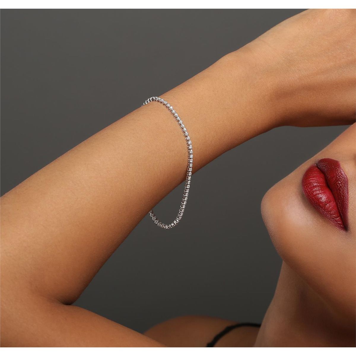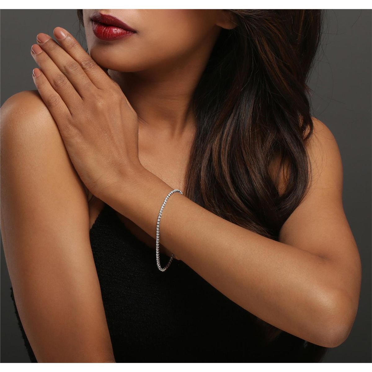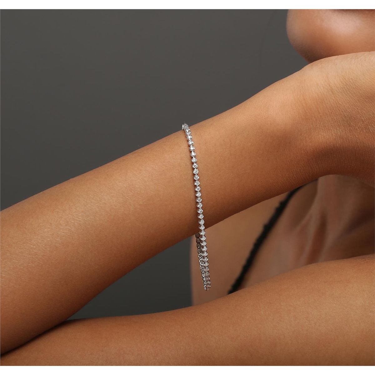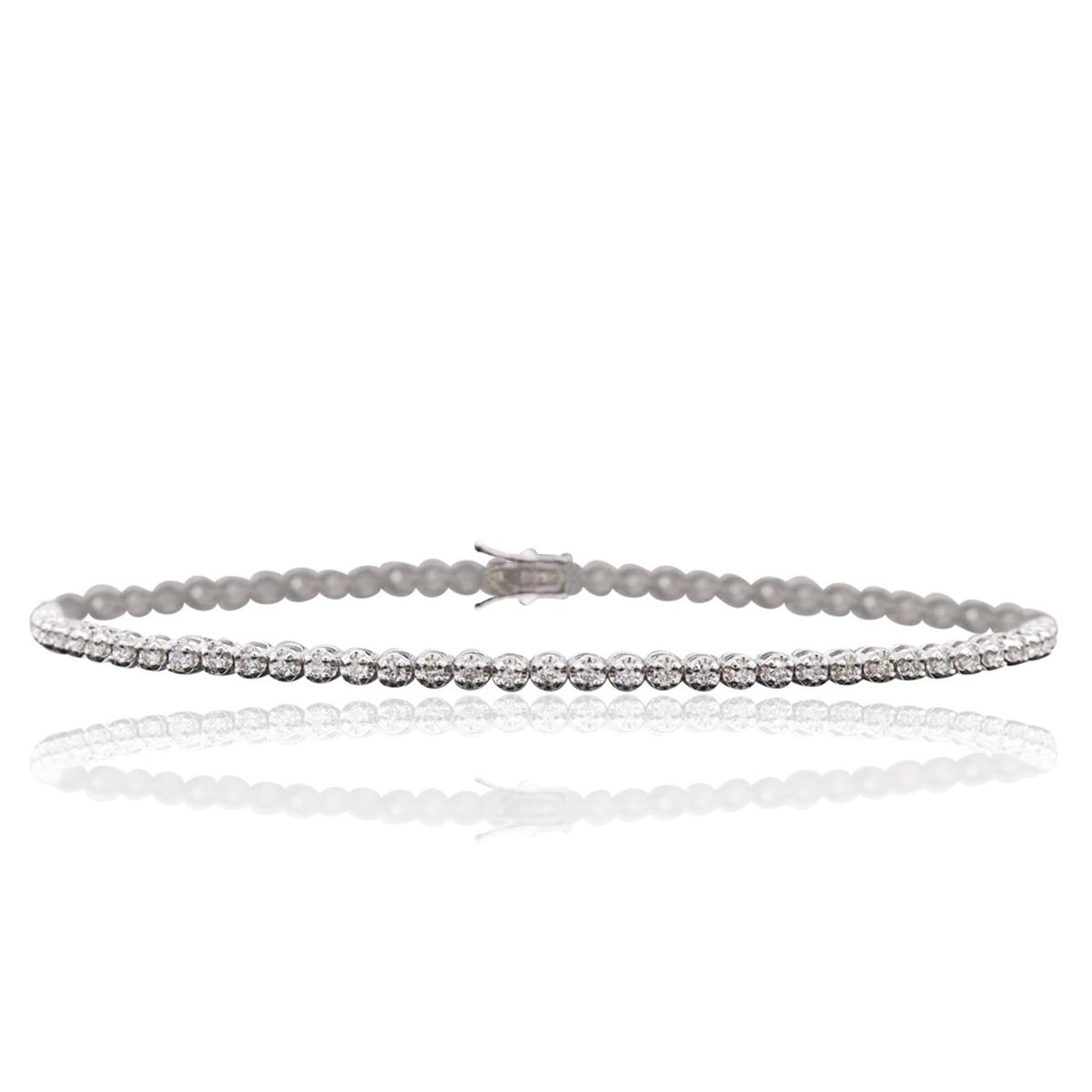 One electronically tested 18KT white gold ladies combination cast & assembled diamond tennis bracelet with a hidden box clasp with safety closer with a bright polish finish. Measurements: 7" in length. Identified with markings of "K18". Condition is new. Containing: Seventy-Three prong set round brilliant cut diamonds, measuring 1.50 - 1.50 x 0.90mm (depth est.) approximate total weight of 73 Stones = 0.90ct. . Clarity: SI-1 to I-1. Color: I - J, Cut is Good. All diamonds are graded in the mounting, unless otherwise stated.. Total Weight of Diamonds 0.90ct.. Total Weight of Tennis Bracelet 5.00 grams. GGL Appraised at $4,520.00.