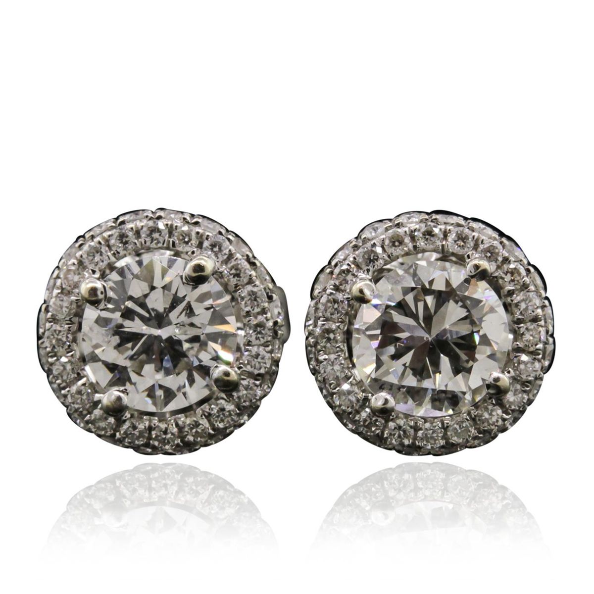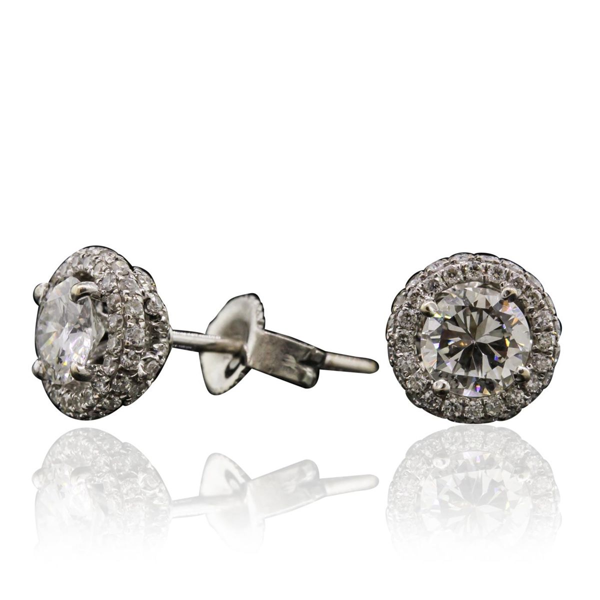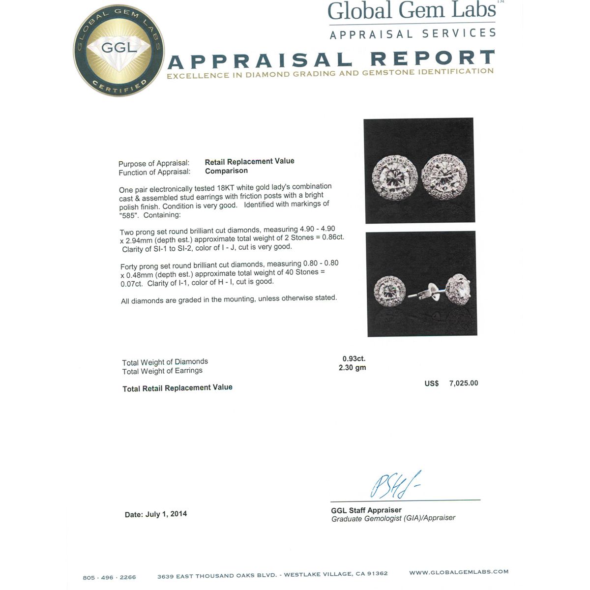 One pair electronically tested 18KT white gold Ladies combination cast & assembled stud earrings with friction posts with a bright polish finish. Condition is very good. Identified with markings of "585". Containing: Two prong set round brilliant cut diamonds, measuring 4.90 - 4.90 x 2.94mm (depth est.) approximate total weight of 2 Stones = 0.86ct. Clarity: SI-1 to SI-2. Color: I - J, Cut is Very Good. Forty prong set round brilliant cut diamonds, measuring 0.80 - 0.80 x 0.48mm (depth est.) approximate total weight of 40 Stones = 0.07ct. Clarity: I-1. Color: H - I, Cut is Good. All diamonds are graded in the mounting, unless otherwise stated. Total Weight of Diamonds 0.93ct. Total Weight of Earrings 2.30 grams. GGL Appraised at $7,025.00.