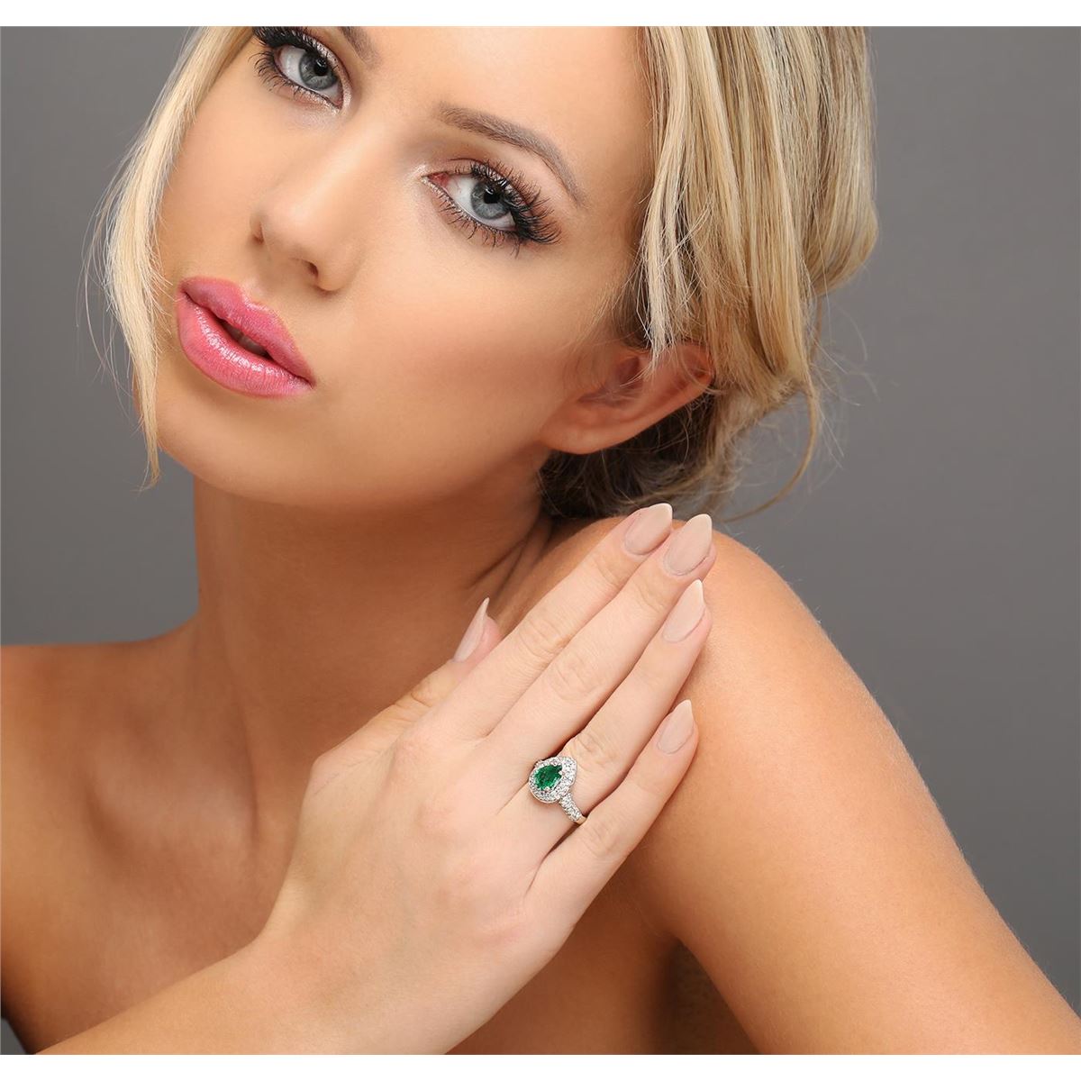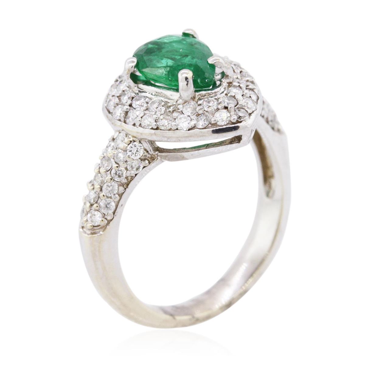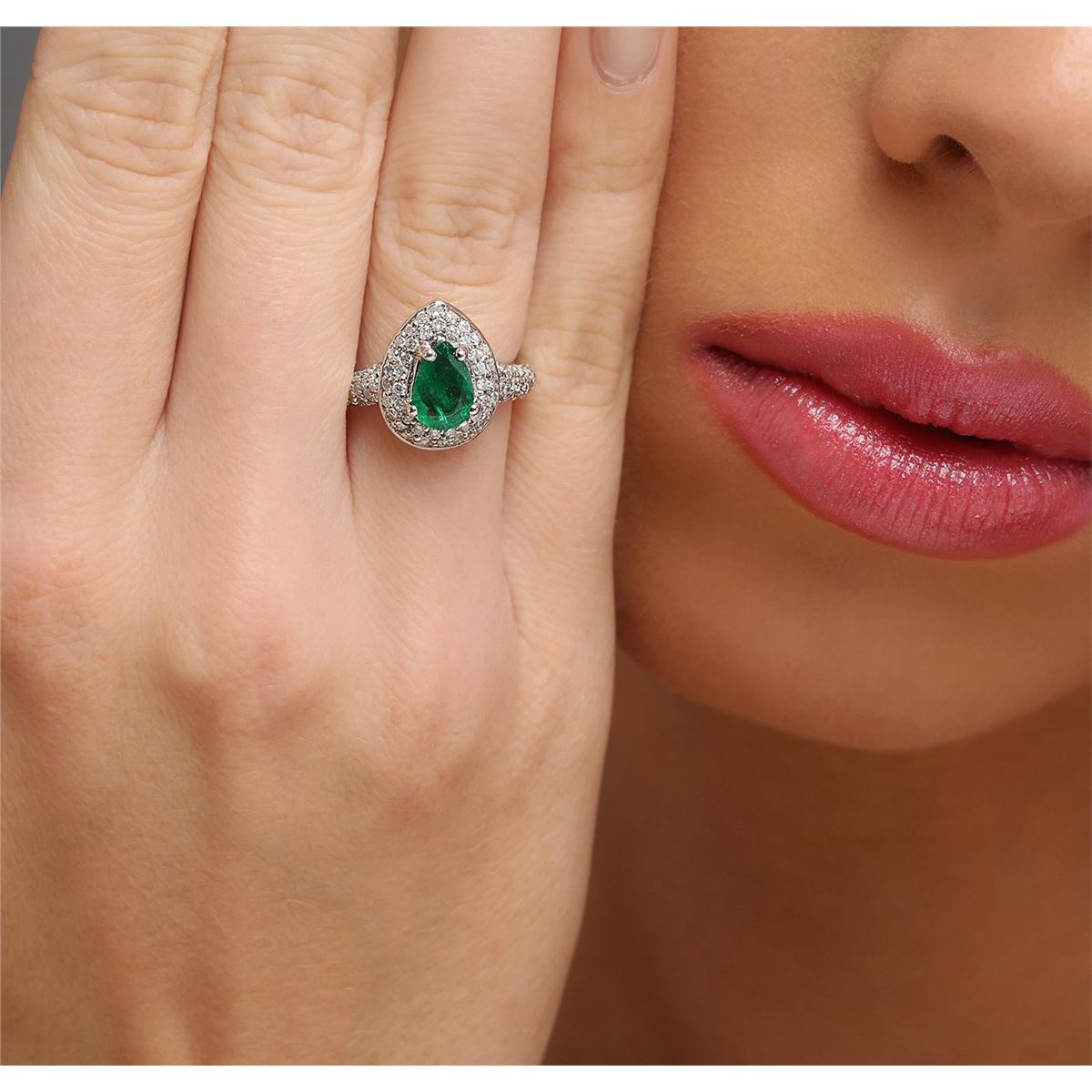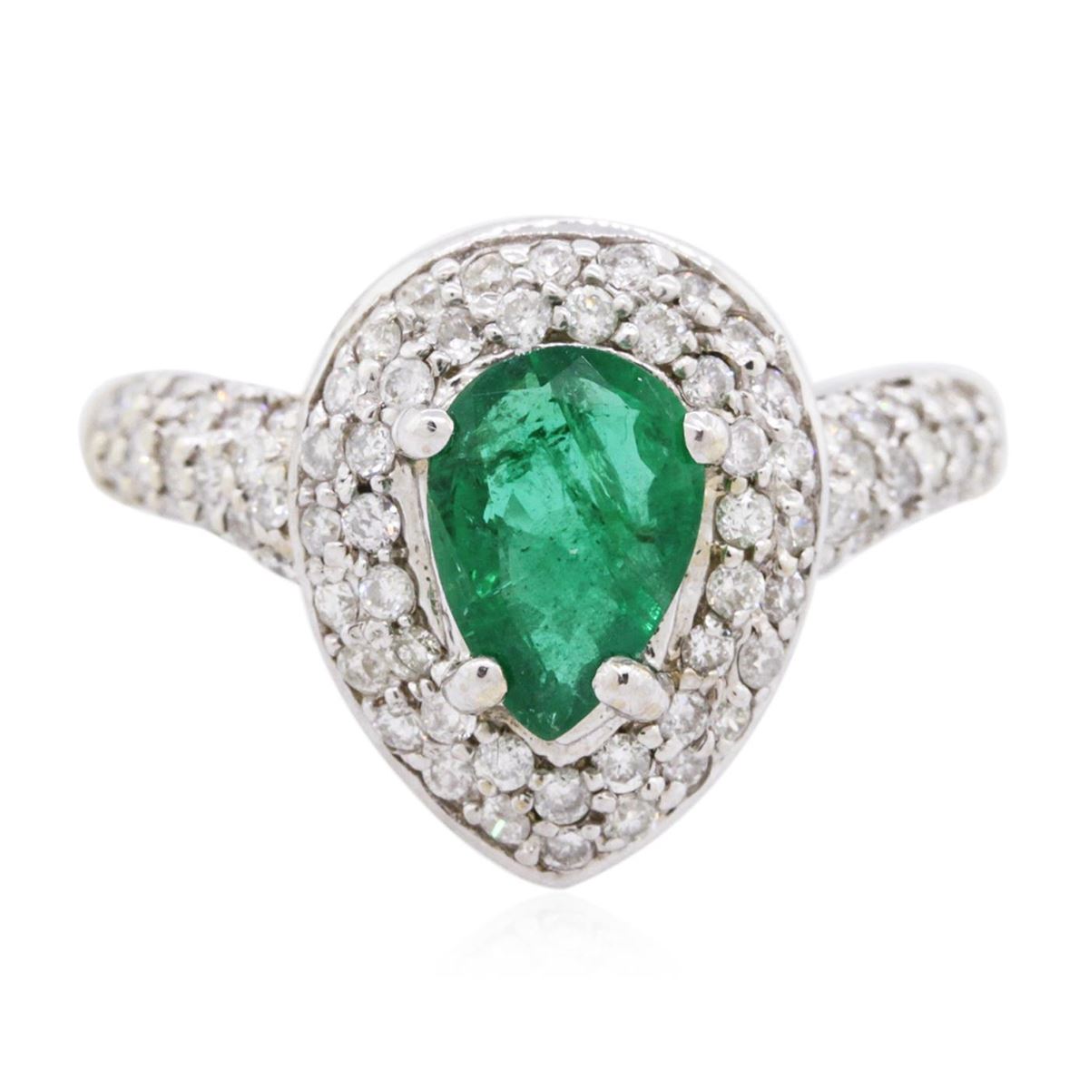 One electronically tested 18KT white gold ladies combination cast & assembled emerald and diamond ring with a half round shank with a bright polish finish. Identified with markings of "18K". Condition is new. Containing: One prong set pear modified step cut natural emerald, measuring 8.75 x 6.42 x 3.20mm, approximate weight of 0.98ct., clarity is moderately included, type III, medium, moderately strong, green color, (GIA G 5/4), cut is good. Seventy-Nine prong set round brilliant cut diamonds, measuring 1.30 - 1.30 x 0.78mm (depth est.) approximate total weight of 79 Stones = 0.63ct. Clarity: SI-2 to I-1. Color: I - J, Cut is Good. All diamonds and colored gemstones are graded in the mounting, unless otherwise stated. Colored gemstones are presumed to have been subjected to commonly used enhancement processes. Total Weight of Colored Stones 0.98ct. Total Weight of Diamonds 0.63ct. Total Weight of Ring 5.80 grams. GGL Appraised at $4,890.00.
