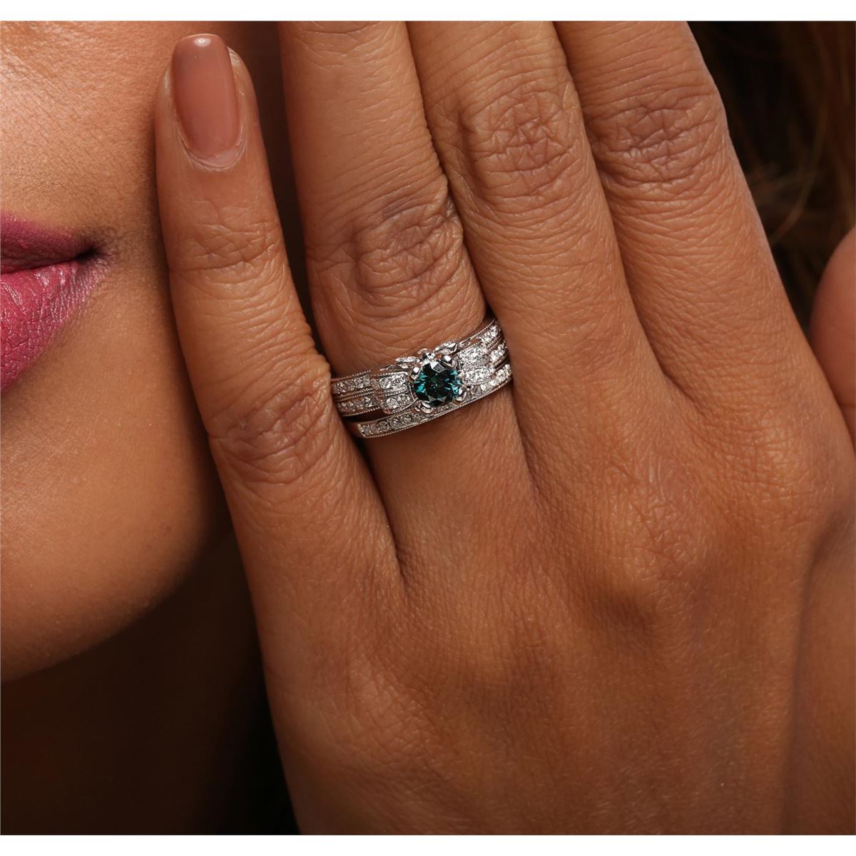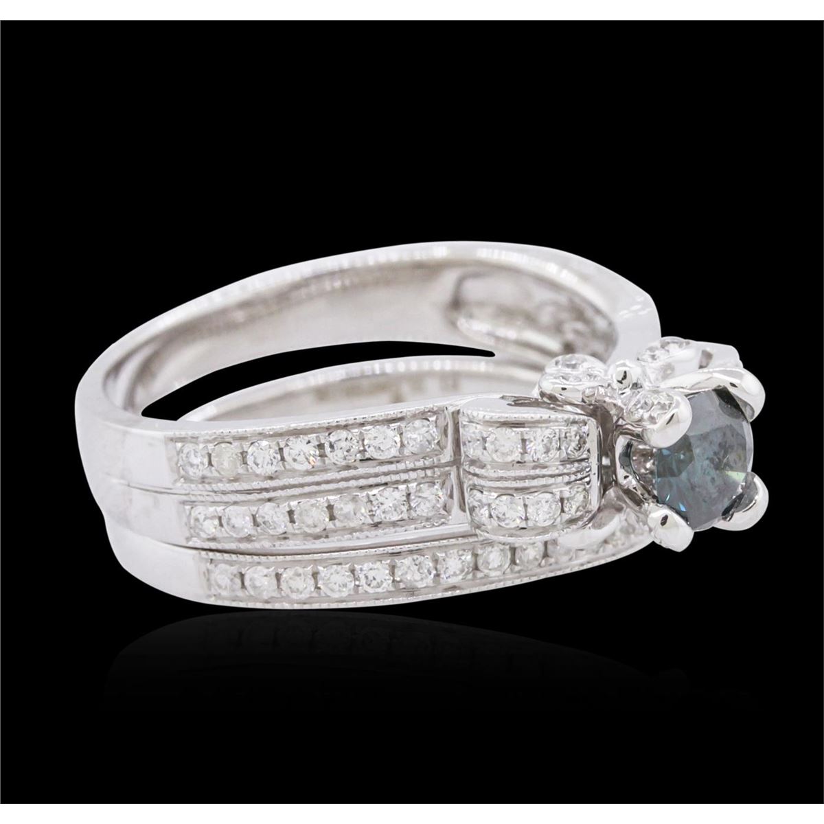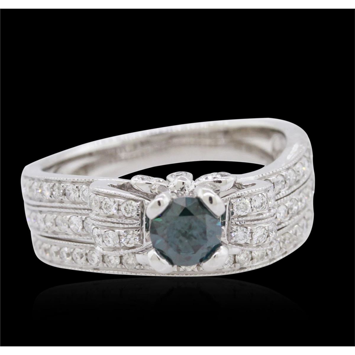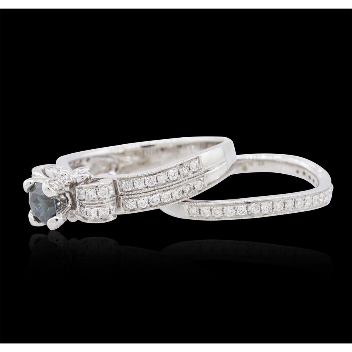 One wedding ring set featuring: 18KT white gold weighing 7.00 grams containing one blue diamond center stone with a total weight of 0.42ct and round diamonds with a total weight of 0.56cts.