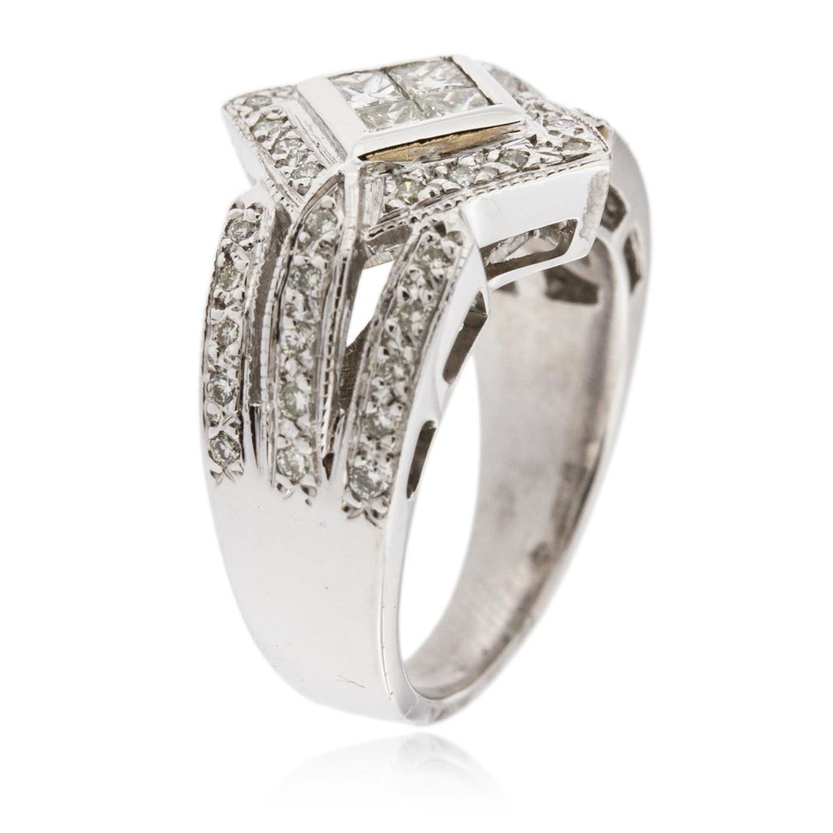 One ring featuring: 18KT white gold weighing 9.40 grams containing pave set diamonds and invisible set princess cut diamonds with a total weight of 1.00ct.