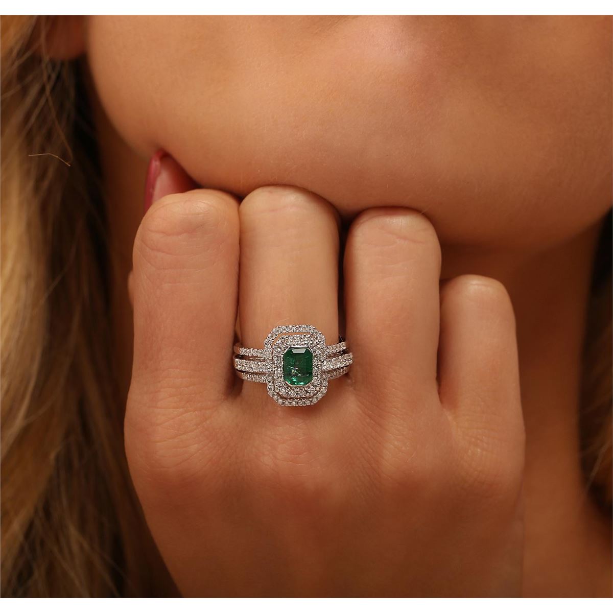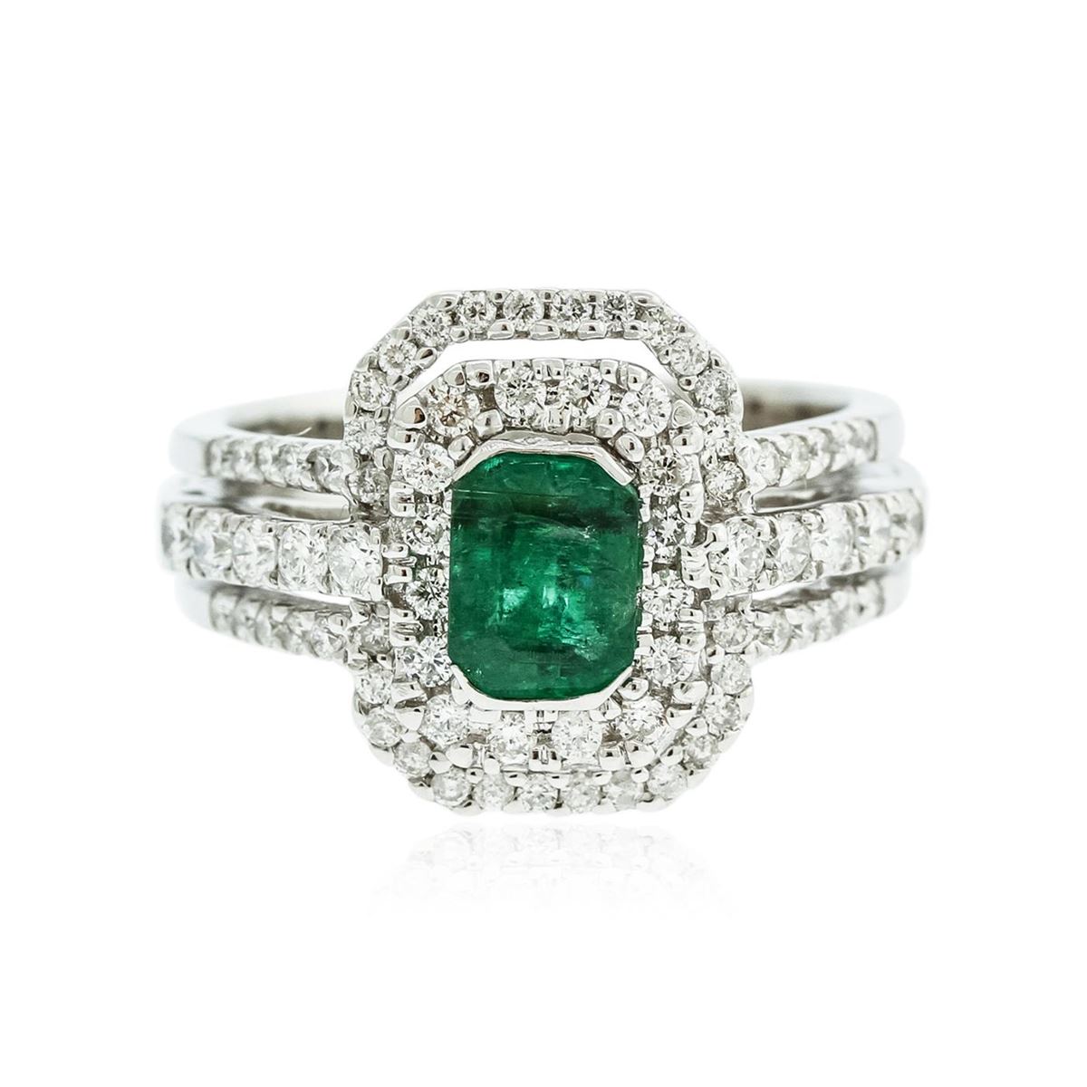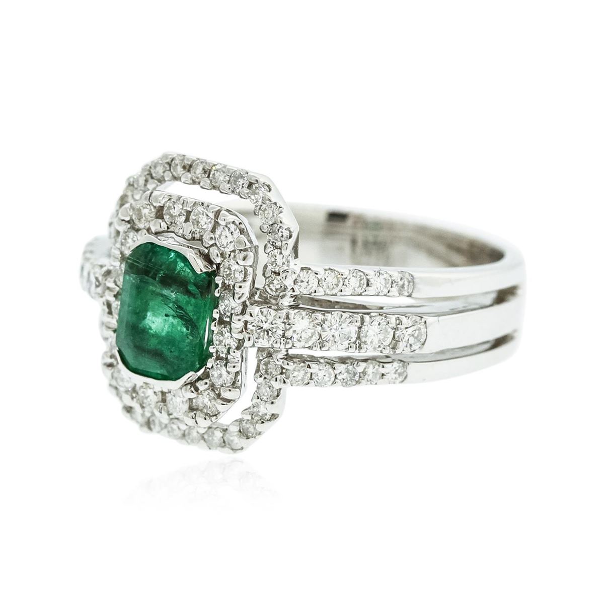 One electronically tested 18KT white gold ladies cast emerald and diamond ring with a bright polish finish. Condition is new, good workmanship. The featured emerald is set within two tiered diamond bezels supported by diamond set three-way split shoulders, completed by a four and one-half millimeter wide band. Identified with markings of "18K". Containing: One channel set rectangular step cut natural emerald, measuring 6.80 x 5.20 x 3.30mm, 6%. bulge factor, approximate weight of 1.01ct., clarity is heavily included, type III, medium dark, moderately strong, very slightly bluish green color, (GIA vslbG 6/4), cut is good. Transmitting light with a minimum of distortion, transparent. Naturally occurring internal & external characteristics are present. Indications of oil residue. Graded in the setting. Ten prong set round brilliant cut diamonds, measuring 1.90 - 1.80 x 1.11mm (depth est.) approximate. Total Weight of 10 Stones = 0.25ct. Graded in the setting. Clarity: VS-1 to VS-2. Color: G - I Sixty-Two prong set round brilliant cut diamonds, measuring 1.40 - 1.20 x 0.78mm (depth est.) approximate. Total Weight of 62 Stones = 0.60ct. Graded in the setting. Clarity: VS-1 to SI-1. Color: G - I. Total Weight of Colored Stones 1.01ct. Total Weight of Diamonds 0.85ct. Total Weight of Ring 8.69 grams. AIG Appraised at $6,625.00.