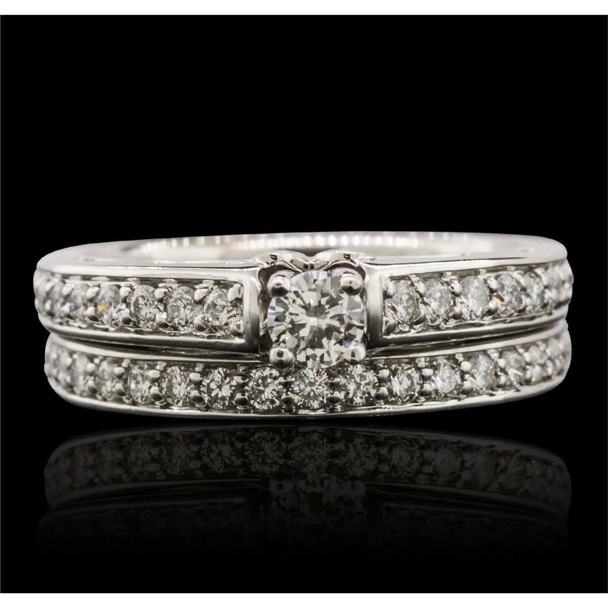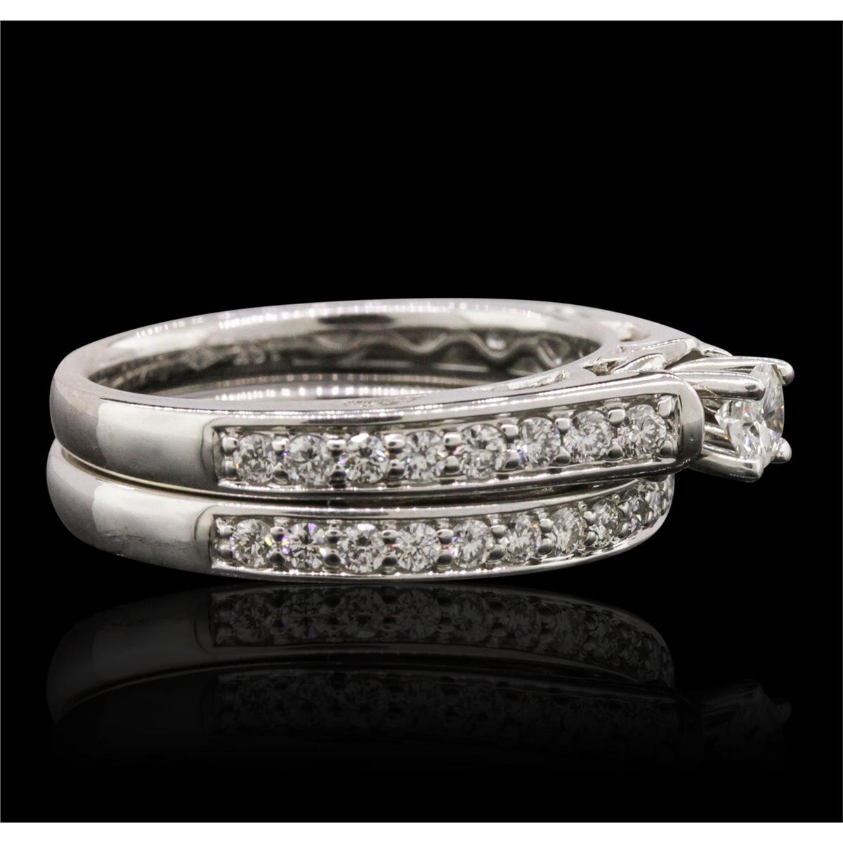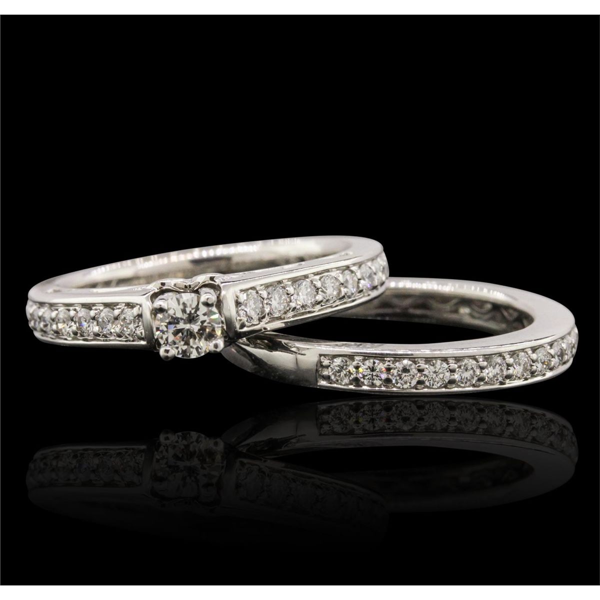 One electronically tested 18KT white gold ladies cast & assembled diamond wedding set with a bright polish finish. Condition is good. The wedding set includes a diamond engagement ring and a diamond wedding band from Helzberg's Masterpiece Collection. The engagement ring features a diamond supported by diamond set shoulders. The set is completed by a matching diamond wedding band. Each ring is completed by a two and one-half millimeter wide band. Trademark is HELZBERG Masterpiece. Identified with markings of "18K". Containing: One prong set round brilliant cut diamond, measuring 3.85 - 3.80 x 2.20mm (depth est.) approximate weight of 0.29ct. Graded in the setting. Clarity: VS-2. Color: 57.4%. Table 62.7%. Thirty-Four prong set round brilliant cut diamonds, measuring 1.80 - 1.70 x 1.05mm (depth est.) approximate. Total Weight of 34 Stones = 0.76ct. Graded in the setting. Clarity: VS-2 to SI-1. Color: G - I. Total Weight of Diamonds 1.05ct. Total Weight of Wedding Set 8.90 grams. AIG Appraised at $6,305.00.