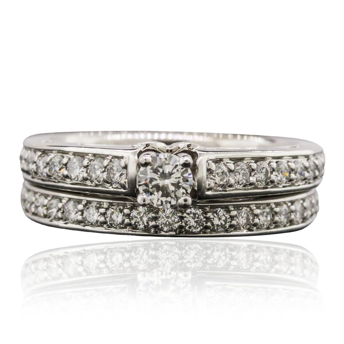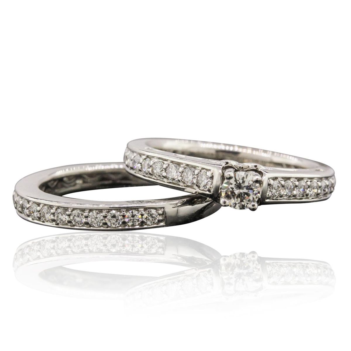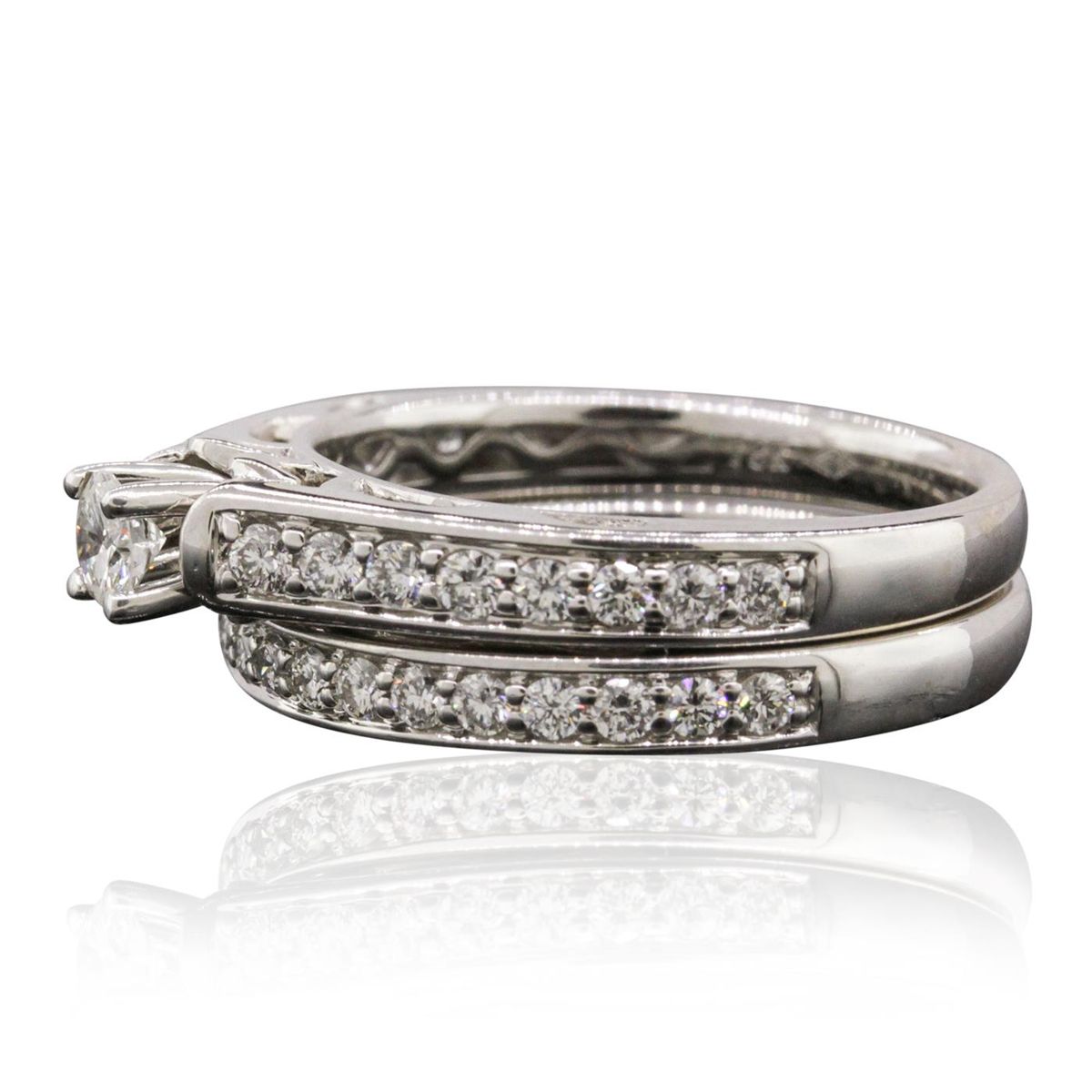 One electronically tested 18KT white gold ladies cast & assembled diamond wedding set with a bright polish finish. Condition is good. The wedding set includes a diamond engagement ring and a diamond wedding band from Helzberg's Masterpiece Collection. The engagement ring features a diamond supported by diamond set shoulders. The set is completed by a matching diamond wedding band. Each ring is completed by a two and one-half millimeter wide band. Trademark is HELZBERG Masterpiece. Identified with markings of "18K". Containing: One prong set round brilliant cut diamond, measuring 3.85 - 3.80 x 2.20mm (depth est.) approximate weight of 0.29ct. Graded in the setting. Clarity: VS-2. Color: 57.4%. Table 62.7%. Thirty-Four prong set round brilliant cut diamonds, measuring 1.80 - 1.70 x 1.05mm (depth est.) approximate. Total Weight of 34 Stones = 0.76ct. Graded in the setting. Clarity: VS-2 to SI-1. Color: G - I. Total Weight of Diamonds 1.05ct. Total Weight of Wedding Set 8.90 grams. AIG Appraised at $6,305.00.