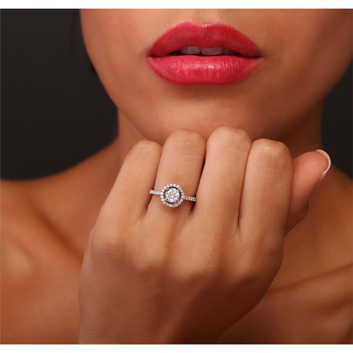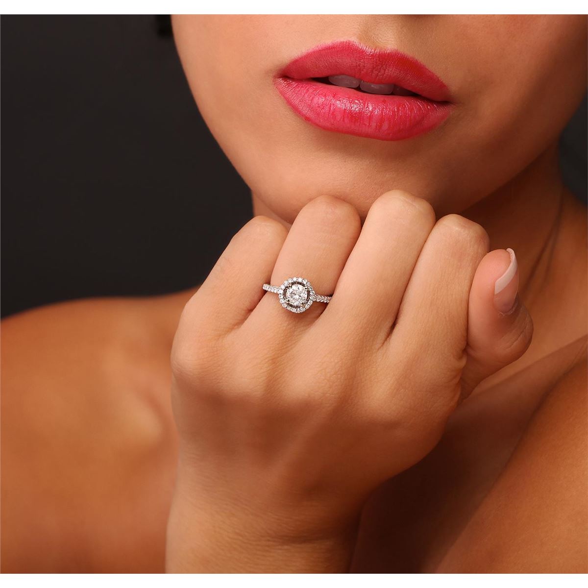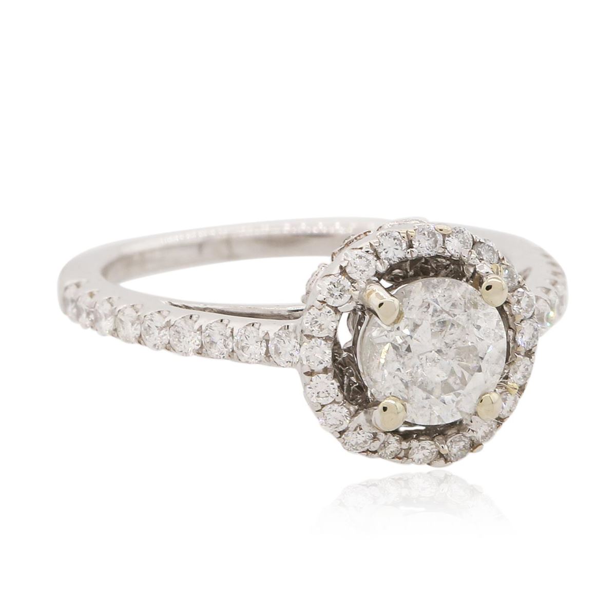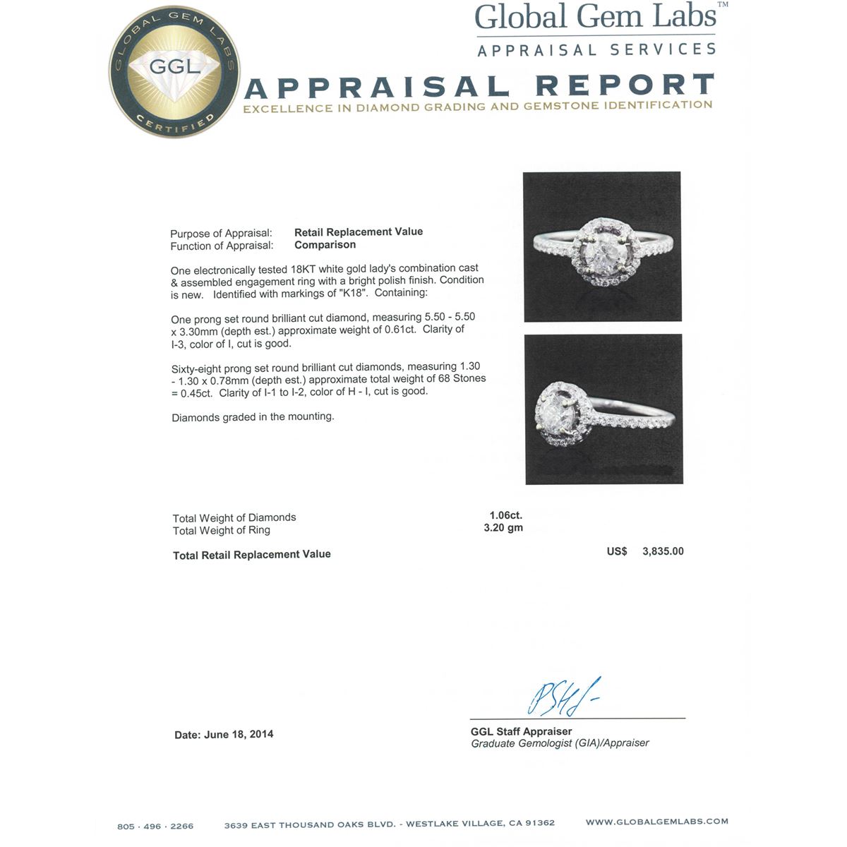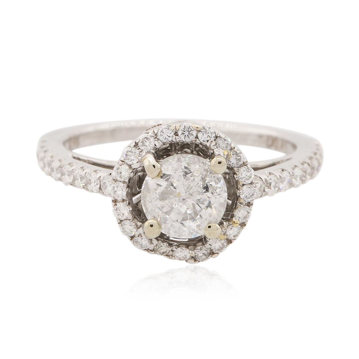 One electronically tested 18KT white gold Ladies combination cast & assembled engagement ring with a bright polish finish. Condition is new. Identified with markings of "K18". Containing: One prong set round brilliant cut diamond, measuring 5.50 - 5.50 x 3.30mm (depth est.) approximate weight of 0.61ct. Clarity: I-3. Color: I, Cut is Good. Sixty-Eight prong set round brilliant cut diamonds, measuring 1.30 - 1.30 x 0.78mm (depth est.) approximate. Total Weight of 68 Stones = 0.45ct. Clarity: I-1 to I-2. Color: H - I, Cut is Good. Diamonds graded in the mounting. Total Weight of Diamonds 1.06ct. Total Weight of Ring 3.20 grams. GGL Appraised at $3,835.00.