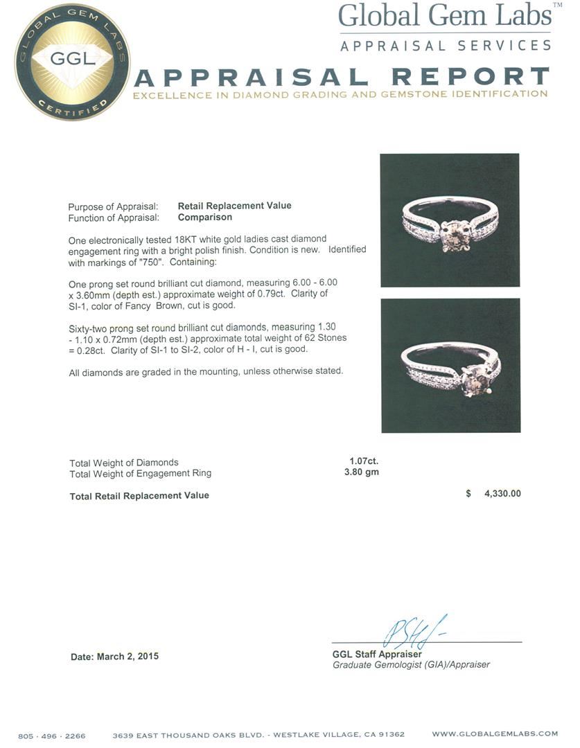 One electronically tested 18KT white gold ladies cast diamond engagement ring with a bright polish finish. Identified with markings of "750". Condition is new. Containing: One prong set round brilliant cut diamond, measuring 6.00 - 6.00 x 3.60mm (depth est.) approximate weight of 0.79ct. Clarity: SI-1, Cut is Good. Sixty-Two prong set round brilliant cut diamonds, measuring 1.30 - 1.10 x 0.72mm (depth est.) approximate total weight of 62 Stones = 0.28ct. Clarity: SI-1 to SI-2. Color: H - I, Cut is Good. All diamonds are graded in the mounting, unless otherwise stated. Total Weight of Diamonds 1.07ct. Total Weight of Engagement Ring 3.80 grams. GGL Appraised at $4,330.00.