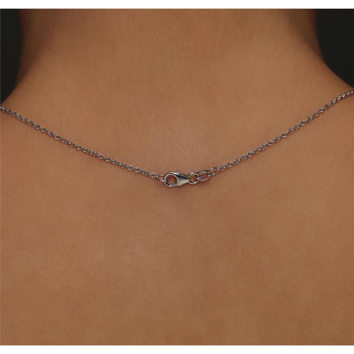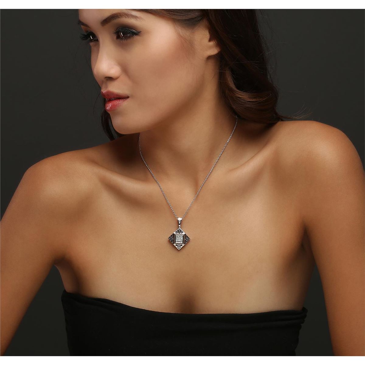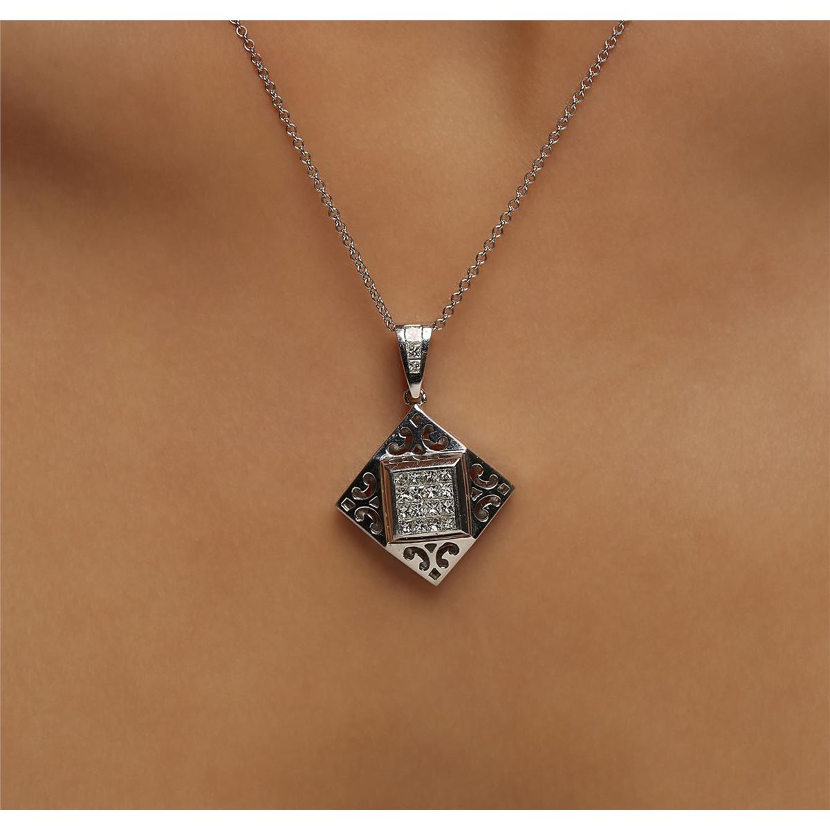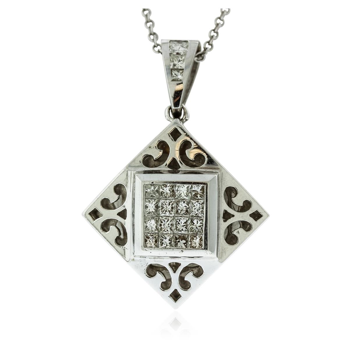 One electronically tested 18KT white gold ladies cast & assembled diamond pendant with chain. The pendant features an organized diamond cluster set within an open lattice design, completed by a diamond set bail. The pendant is supported by a sixteen inch length 14KT white gold designer style chain, terminating in a lobster claw clasp. Bright polish finish. Identified with markings of "18K". Condition is new, good workmanship. Containing: Nineteen invisible and channel set princess cut diamonds, measuring 2.10 x 2.00 x 1.50mm (depth est.) approximate total weight of 19 Stones = 1.08ct. Graded in the setting. Clarity: VS-1 to SI-1. Color: H - J. Total Weight of Diamonds 1.08ct. Total Weight of Pendant With Chain 13.91 grams. AIG Appraised at $5,945.00.