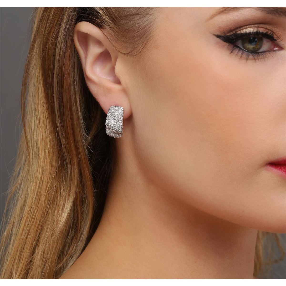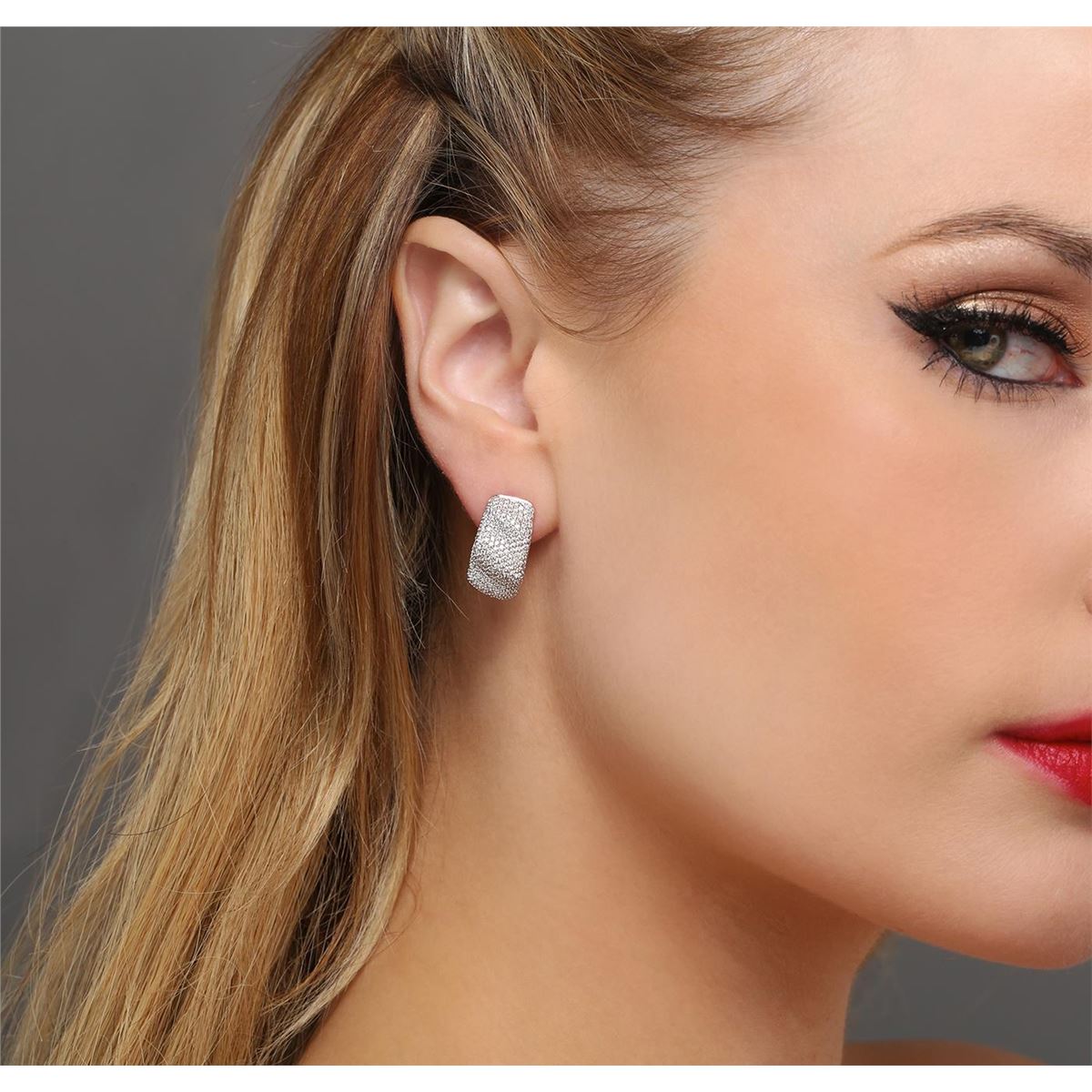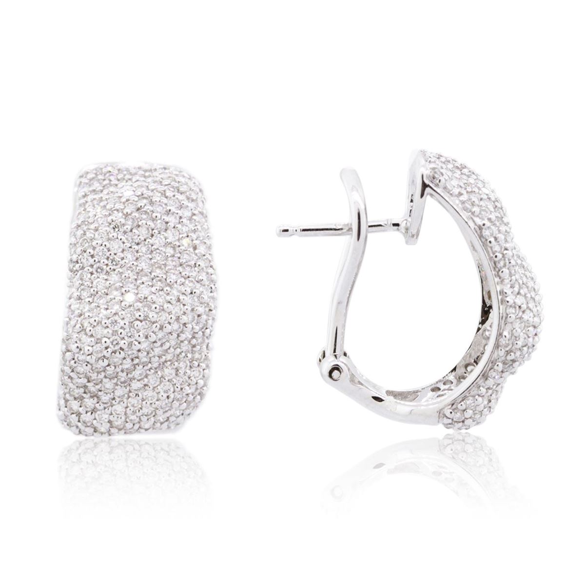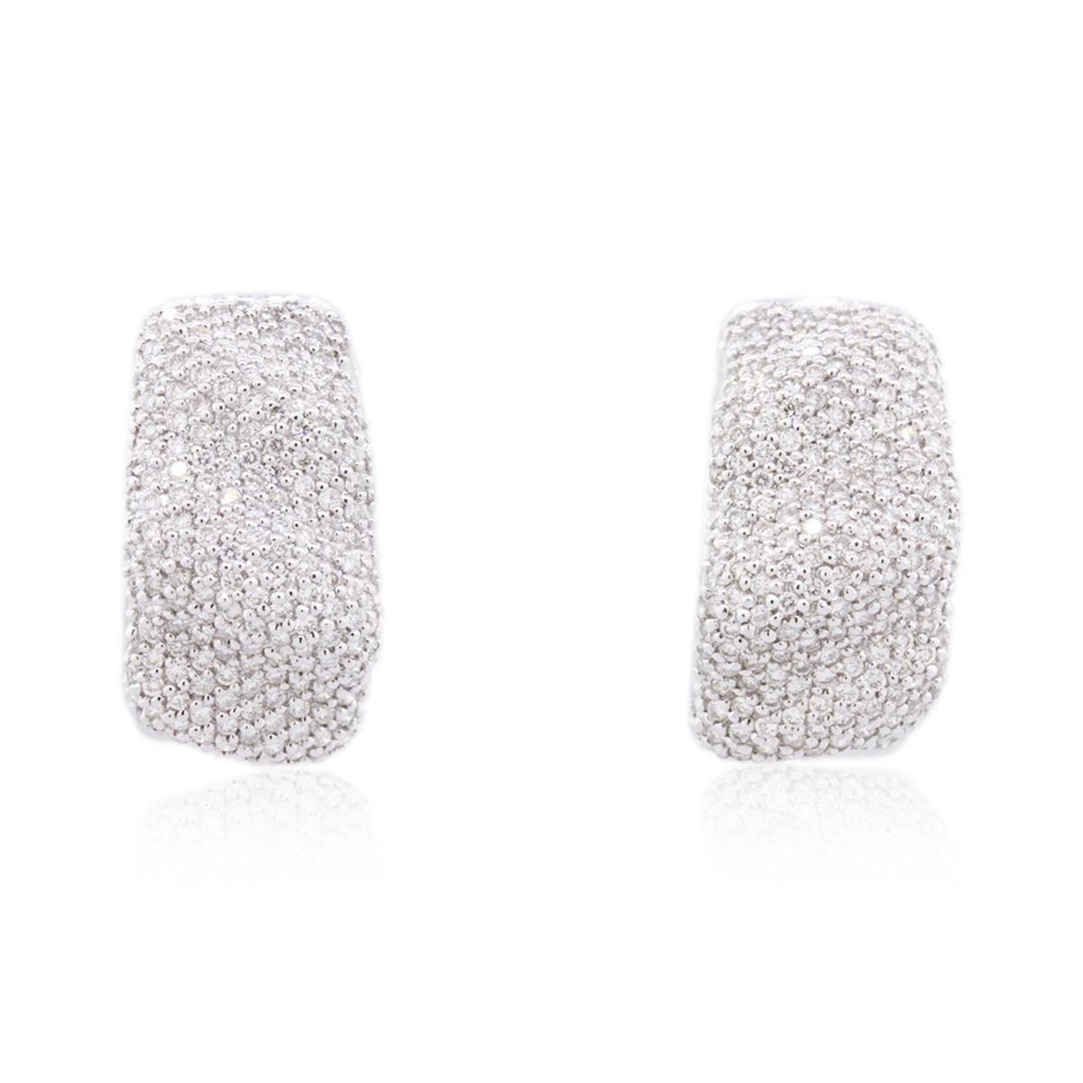 One pair electronically tested 18KT white gold ladies cast diamond earrings with Omega clip backs with posts with a bright polish finish. Identified with markings of "18K". Condition is new. Containing: Three Hundred Four prong set round brilliant cut diamonds, measuring 1.00 - 1.00 x 0.60mm (depth est.) approximate total weight of 304 Stones = 1.09ct. Clarity: SI-2 to I-1. Color: I - J, Cut is Good. All diamonds are graded in the mounting, unless otherwise stated. Total Weight of Diamonds 1.09ct. Total Weight of Earrings 8.50 grams. GGL Appraised at $4,465.00.
