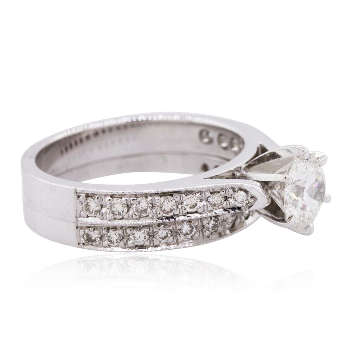 One electronically tested 18KT white gold ladies combination cast & assembled diamond engagement ring & wedding band with a bright polish finish. Identified with markings of "18K". Condition is new. Containing: One prong set round brilliant cut diamond, measuring 6.20 - 6.20 x 3.72mm (depth est.) approximate weight of 0.87ct. Clarity: SI-2. Color: J, Cut is Good. Twenty-Nine prong set round brilliant cut diamonds, measuring 1.30 - 1.30 x 0.78mm (depth est.) approximate total weight of 29 Stones = 0.23ct. Clarity: SI-2. Color: J - K, Cut is Good. All diamonds are graded in the mounting, unless otherwise stated. Total Weight of Diamonds 1.10ct. Total Weight of Engagement Ring & Wedding Band 7.50 grams. GGL Appraised at $10,805.00.