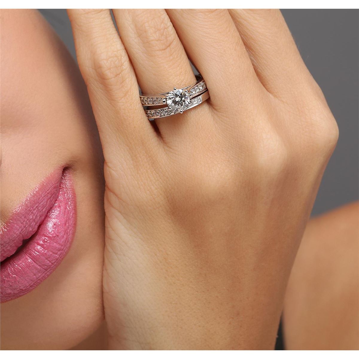One electronically tested 18KT white gold ladies combination cast & assembled diamond engagement ring & wedding band with a bright polish finish. Identified with markings of "18K". Condition is new. Containing: One prong set round brilliant cut diamond, measuring 6.20 - 6.20 x 3.72mm (depth est.) approximate weight of 0.87ct. Clarity: SI-2. Color: J, Cut is Good. Twenty-Nine prong set round brilliant cut diamonds, measuring 1.30 - 1.30 x 0.78mm (depth est.) approximate total weight of 29 Stones = 0.23ct. Clarity: SI-2. Color: J - K, Cut is Good. All diamonds are graded in the mounting, unless otherwise stated. Total Weight of Diamonds 1.10ct. Total Weight of Engagement Ring & Wedding Band 7.50 grams. GGL Appraised at $10,805.00.