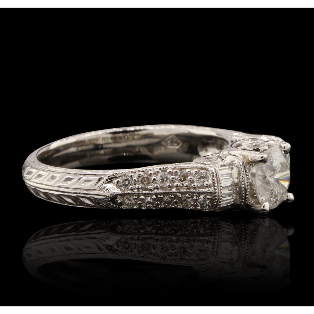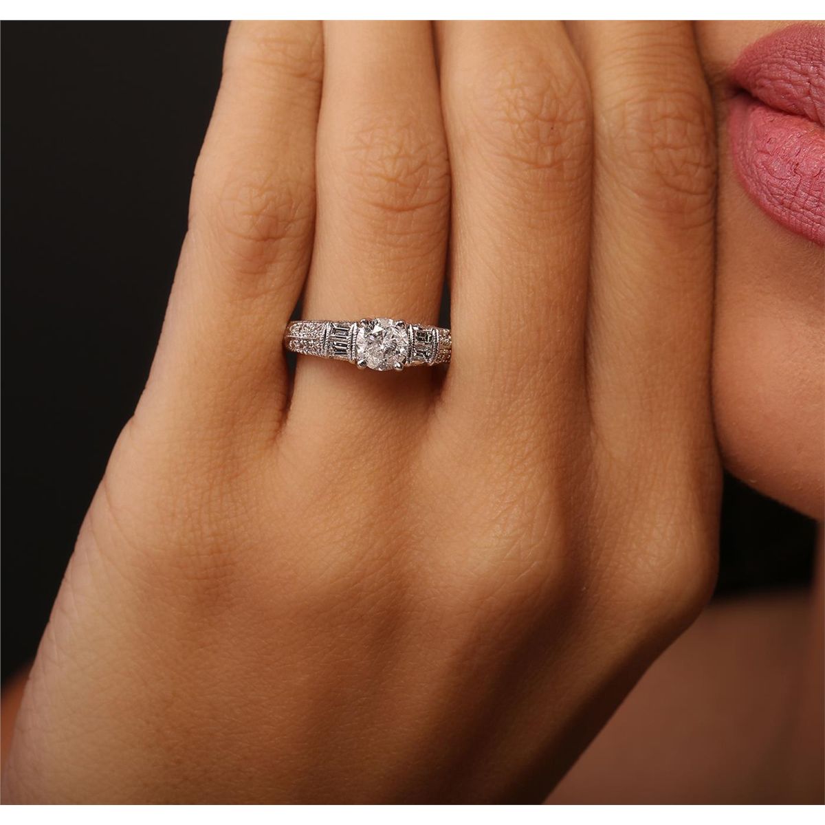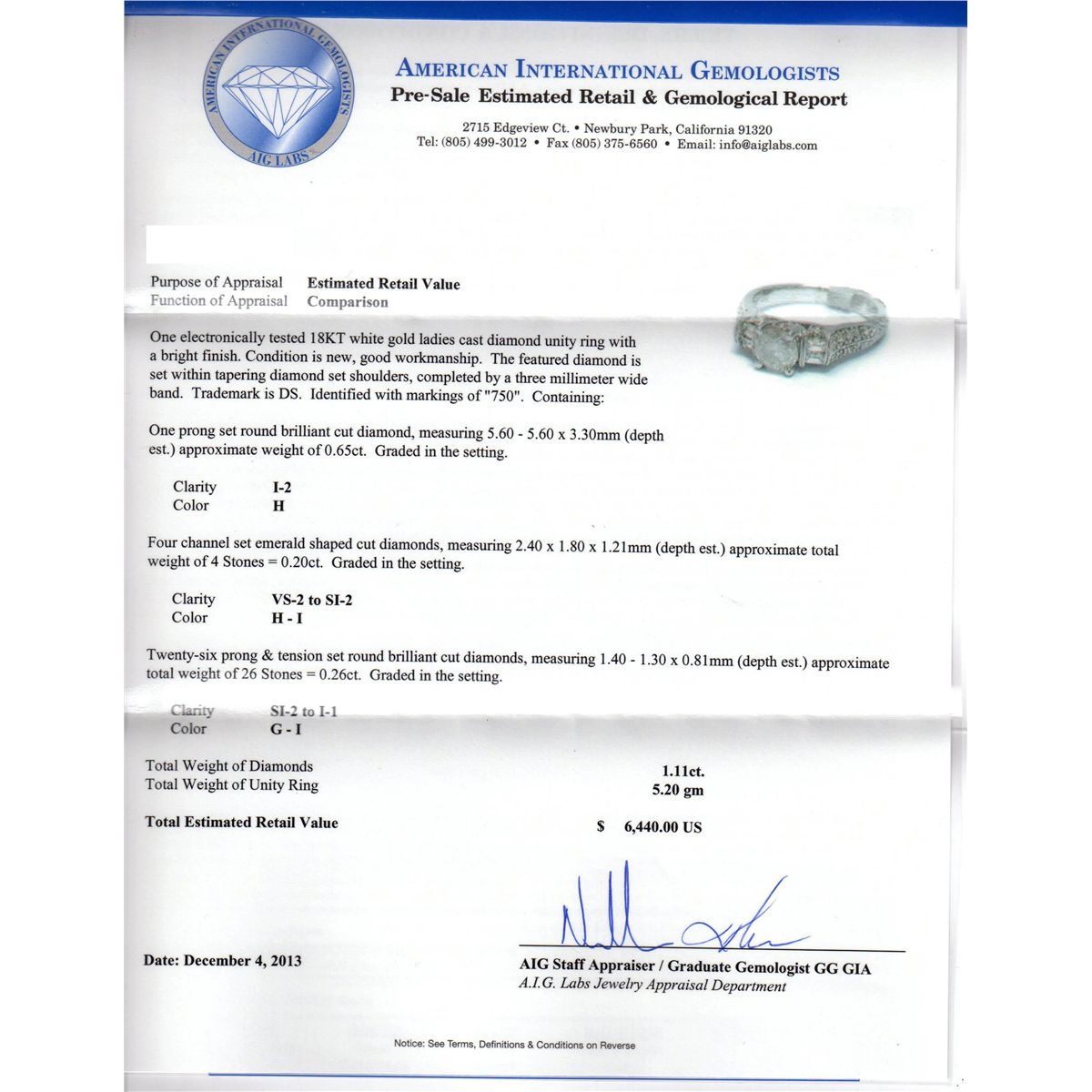 One electronically tested 18KT white gold ladies cast diamond unity ring with a bright finish. The featured diamond is set within tapering diamond set shoulders, completed by a three millimeter wide band. Trademark is DS. Identified with markings of "750". Condition is new, good workmanship. Containing: One prong set round brilliant cut diamond, measuring 5.60 - 5.60 x 3.30mm (depth est.) approximate weight of 0.65ct. Graded in the setting. Clarity: I-2. Color: H Four channel set emerald shaped cut diamonds, measuring 2.40 x 1.80 x 1.21mm (depth est.) approximate. Total Weight of 4 Stones = 0.20ct. Graded in the setting. Clarity: VS-2 to SI-2. Color: H - I Twenty-Six prong & tension set round brilliant cut diamonds, measuring 1.40 - 1.30 x 0.81mm (depth est.) approximate. Total Weight of 26 Stones = 0.26ct. Graded in the setting. Clarity: SI-2 to I-1. Color: G - I. Total Weight of Diamonds 1.11ct. AIG Appraised at $6,440.00.