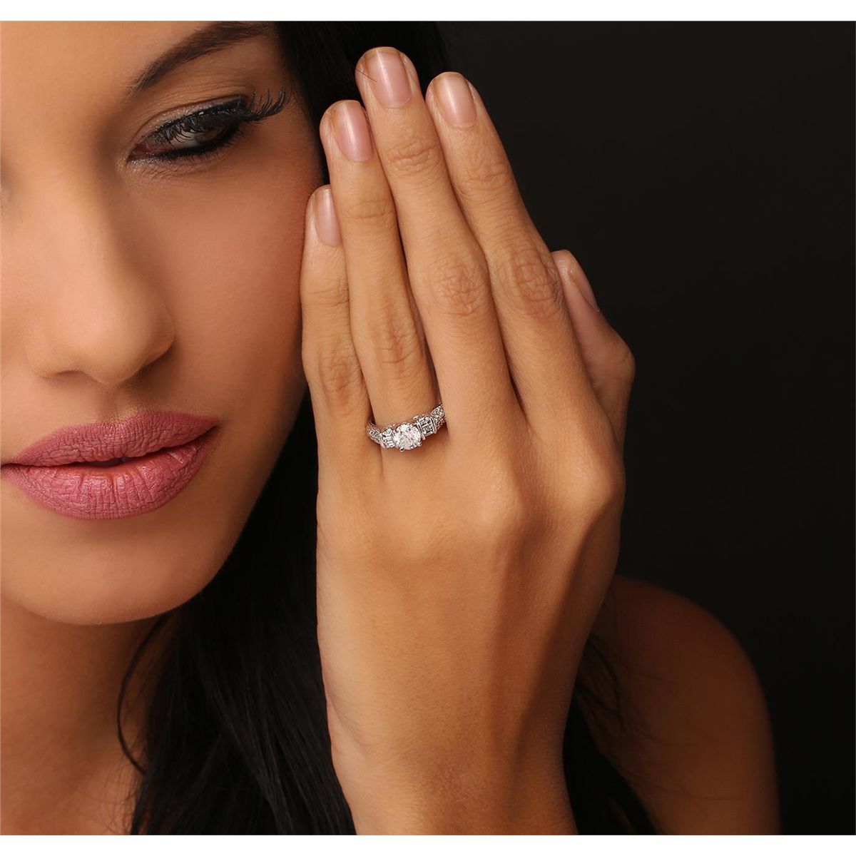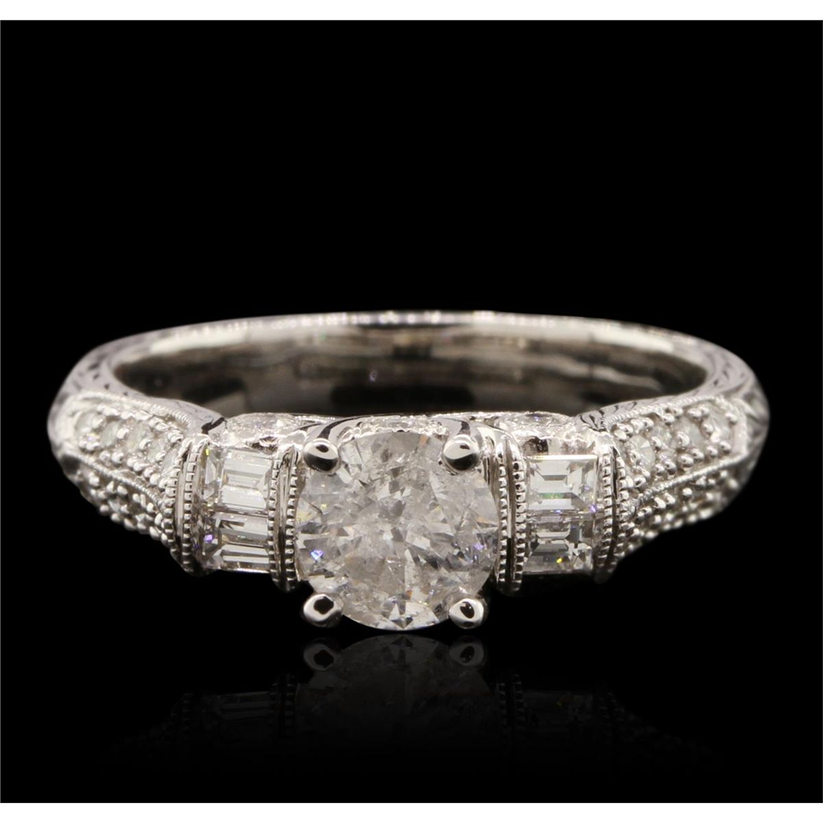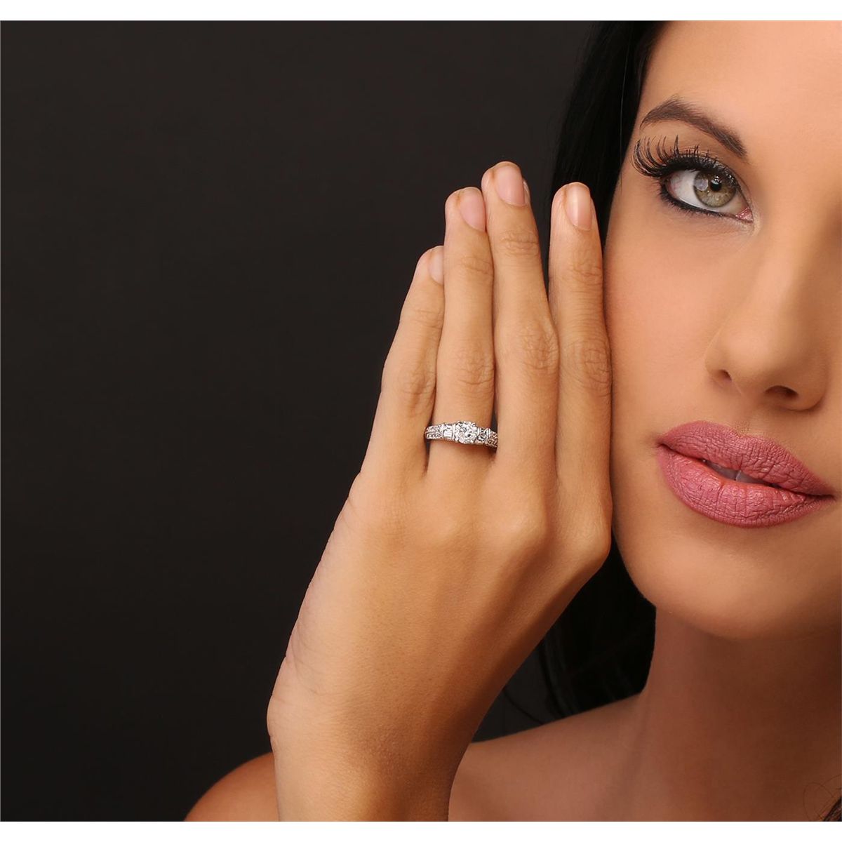 One electronically tested 18KT white gold ladies cast diamond unity ring with a bright finish. The featured diamond is set within tapering diamond set shoulders, completed by a three millimeter wide band. Trademark is DS. Identified with markings of "750". Condition is new, good workmanship. Containing: One prong set round brilliant cut diamond, measuring 5.60 - 5.60 x 3.30mm (depth est.) approximate weight of 0.65ct. Graded in the setting. Clarity: I-2. Color: H Four channel set emerald shaped cut diamonds, measuring 2.40 x 1.80 x 1.21mm (depth est.) approximate. Total Weight of 4 Stones = 0.20ct. Graded in the setting. Clarity: VS-2 to SI-2. Color: H - I Twenty-Six prong & tension set round brilliant cut diamonds, measuring 1.40 - 1.30 x 0.81mm (depth est.) approximate. Total Weight of 26 Stones = 0.26ct. Graded in the setting. Clarity: SI-2 to I-1. Color: G - I. Total Weight of Diamonds 1.11ct. AIG Appraised at $6,440.00.