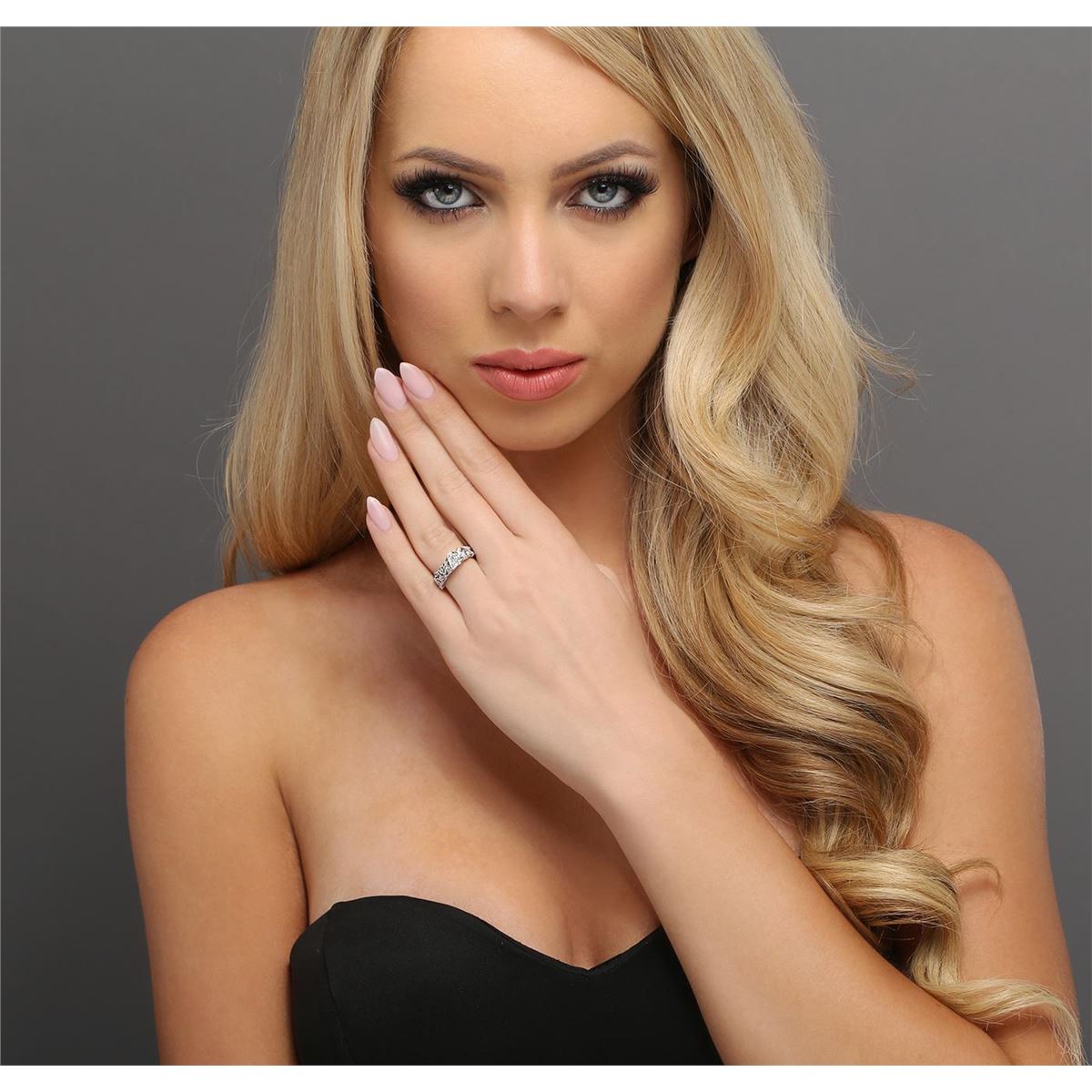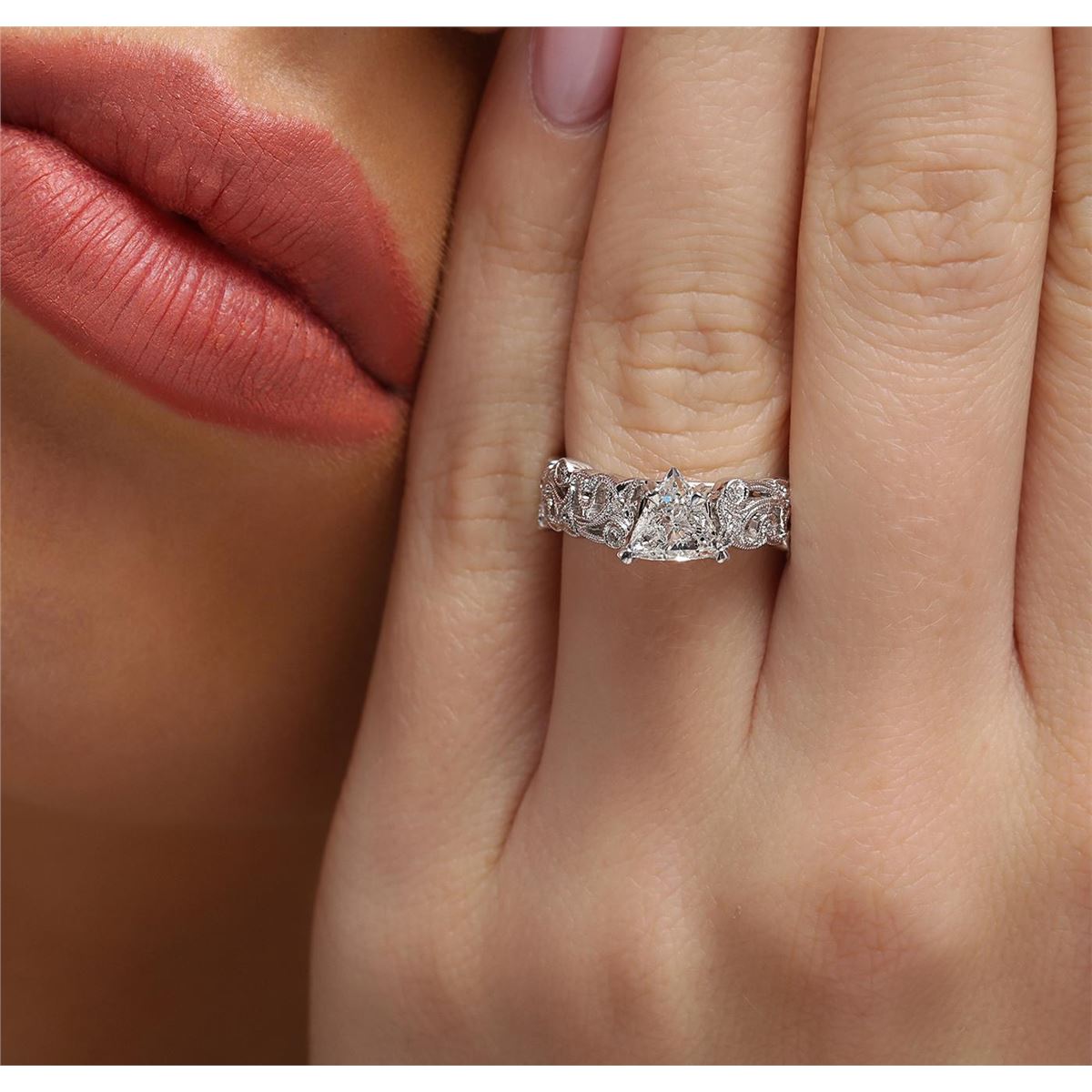 One electronically tested 18KT white gold ladies cast diamond engagement ring with a bright polish finish. Identified with markings of "18K". Condition is new. Containing: One prong set triangle brilliant cut diamond, measuring 6.50 x 6.50 x 4.03mm (depth est.) approximate weight of 0.97ct. Clarity: I-2. Color: J, Cut is Good. Eighteen prong set round brilliant cut diamonds, measuring 1.30 - 1.30 x 0.78mm (depth est.) approximate total weight of 18 Stones = 0.14ct. Clarity: SI-2 to I-1. Color: I - J, Cut is Good. All diamonds are graded in the mounting, unless otherwise stated. Total Weight of Diamonds 1.12ct. Total Weight of Ring 6.40 grams. GGL Appraised at $6,870.00.