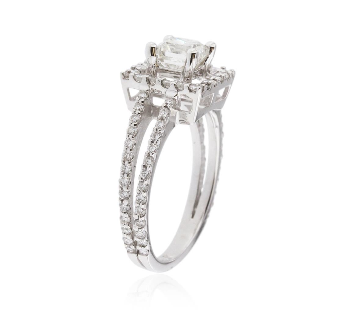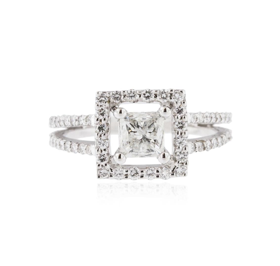 One electronically tested 18KT white gold ladies cast diamond engagement ring with a bright polish finish. Identified with markings of "18K". Condition is new. Containing: One prong set princess cut diamond, measuring 4.70 x 4.70 x 3.53mm (depth est.) approximate weight of 0.64ct. Clarity: I-1. Color: K, Cut is Good. Seventy-Six prong set round brilliant cut diamonds, measuring 1.20 - 1.20 x 0.72mm (depth est.) approximate total weight of 76 Stones = 0.48ct. Clarity: I-1 to I-2. Color: J, Cut is Good. All diamonds are graded in the mounting, unless otherwise stated. Total Weight of Diamonds 1.12ct. Total Weight of Engagement Ring 4.30 grams. GGL Appraised at $4,120.00.