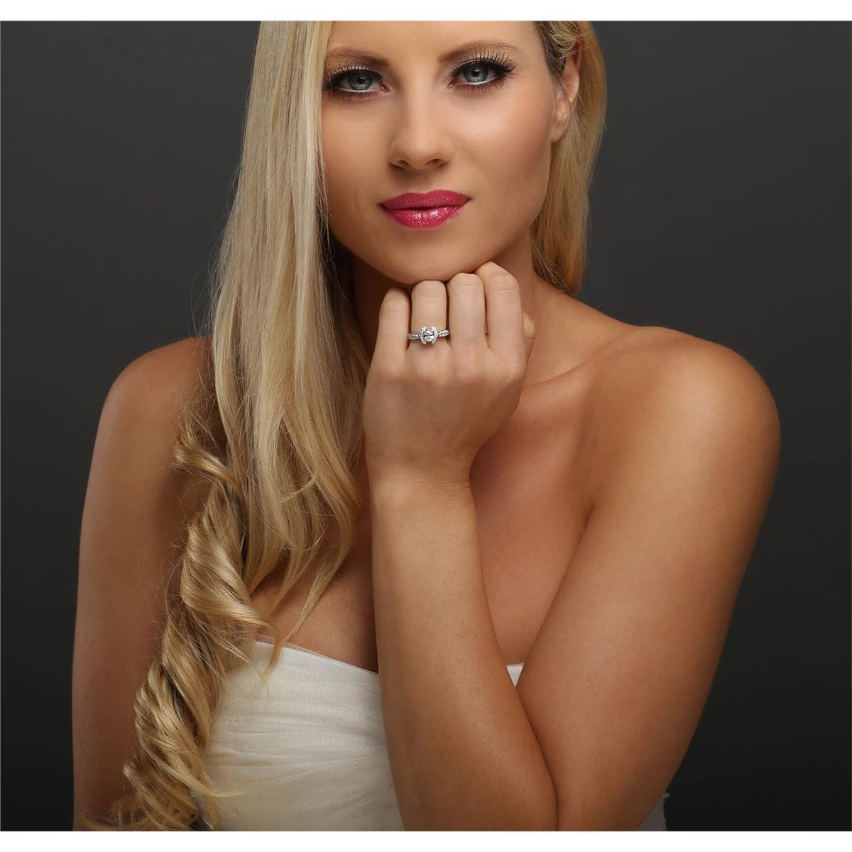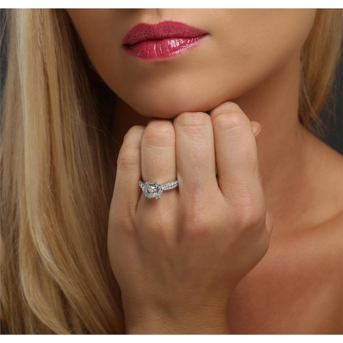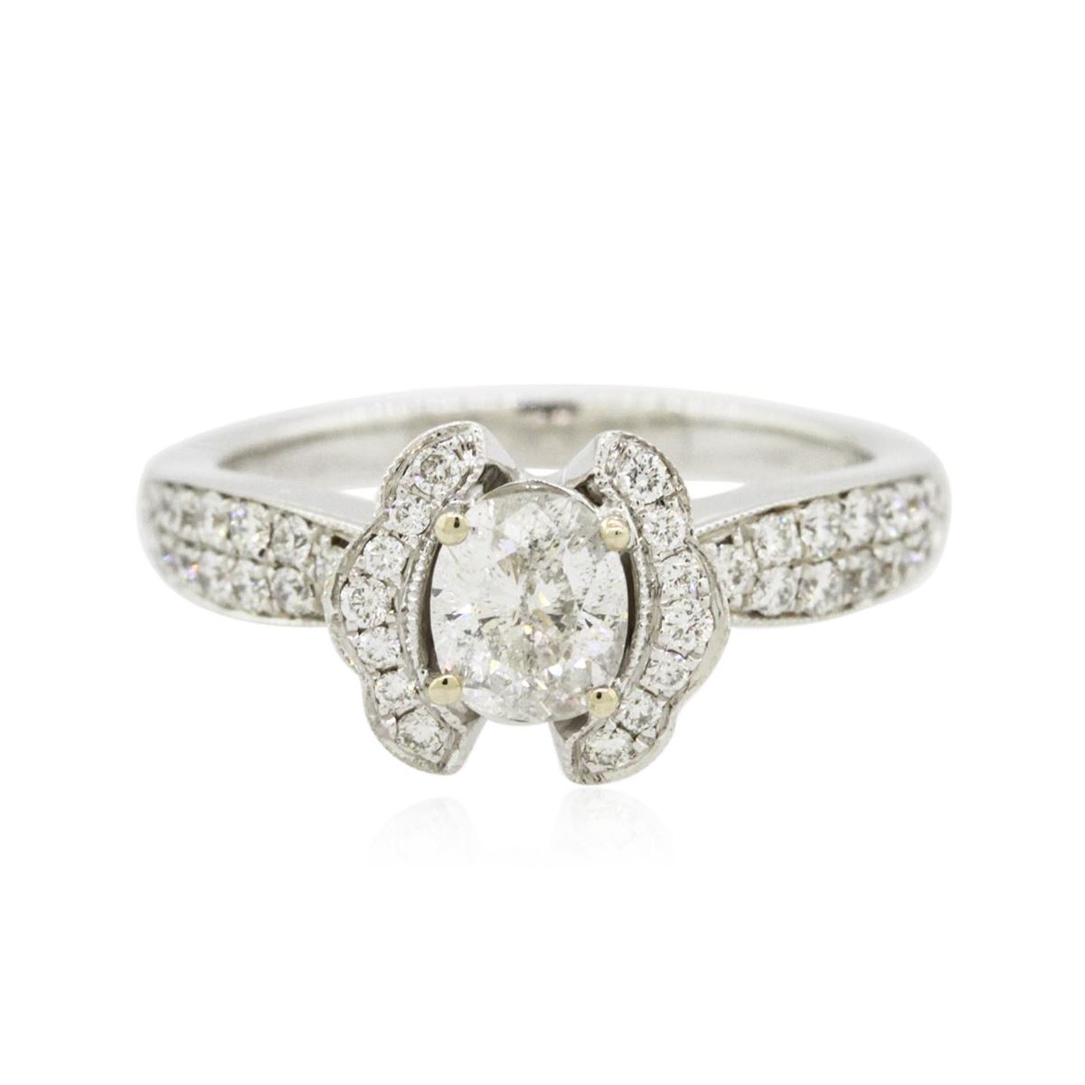 One electronically tested 18KT White Gold ladies cast diamond unity ring. The featured diamond is set within mirroring diamond ribbons supported by diamond set shoulders, completed by a two millimeter wide band. Bright polish finish with milgrain detailing throughout. Identified with markings of "18K 750". Condition is new, good workmanship. Containing: One prong set oval shaped cut diamond, measuring 5.75 x 4.90 x 3.35mm (depth est.), 5.00.% GTCF approximate weight of 0.71ct. Graded in the setting. Clarity: I-1. Color: H. Depth 68.4%. Table 51.0%. Forty prong set round brilliant cut diamonds, measuring 1.50 - 1.40 x 0.87mm (depth est.) approximate total weight of 40 Stones = 0.41ct. Graded in the setting. Clarity: VS-1 to SI-1. Color: G - I. Total Weight of Diamonds 1.12ct. Total Weight of Unity Ring 5.22 grams. AIG Appraised at $8,325.00.