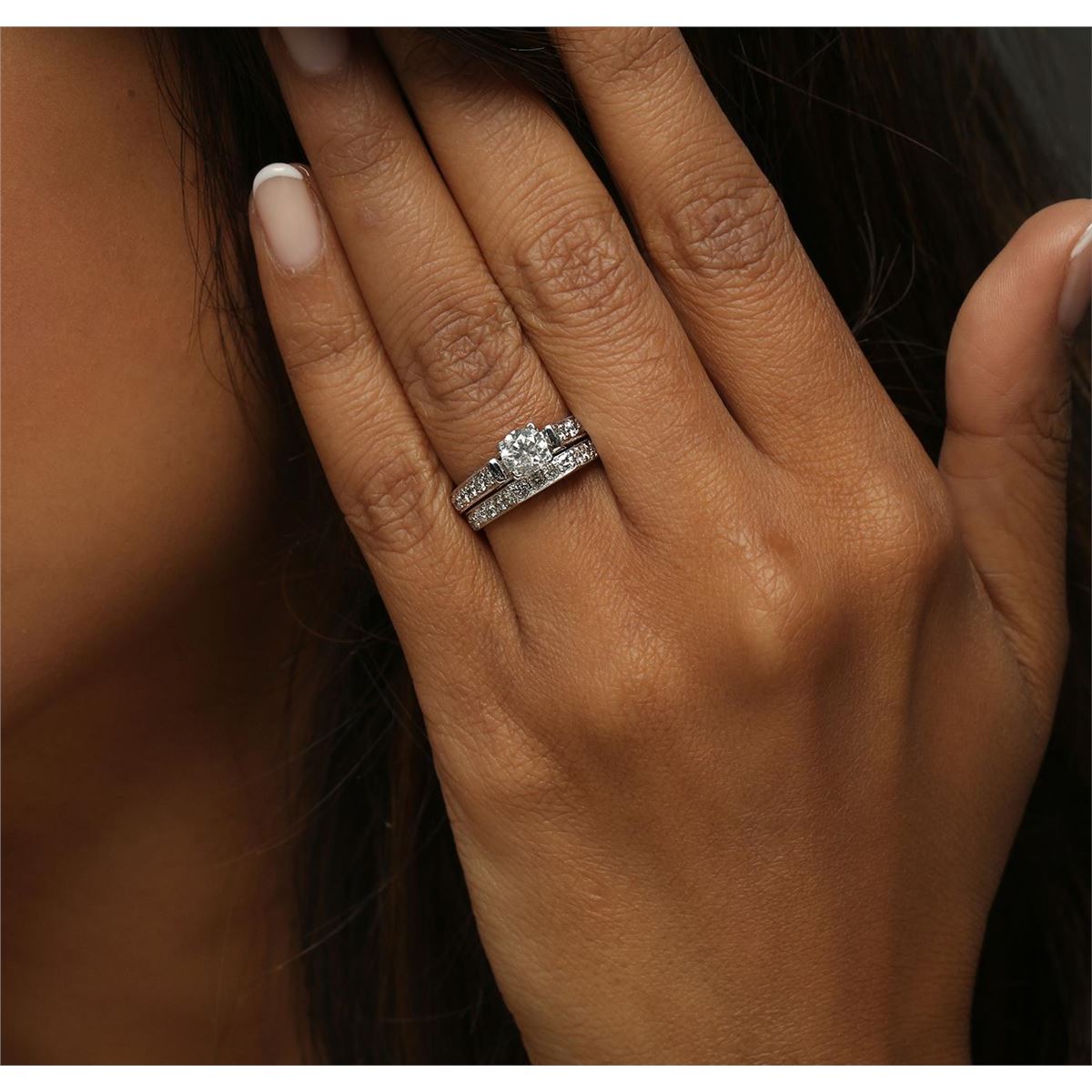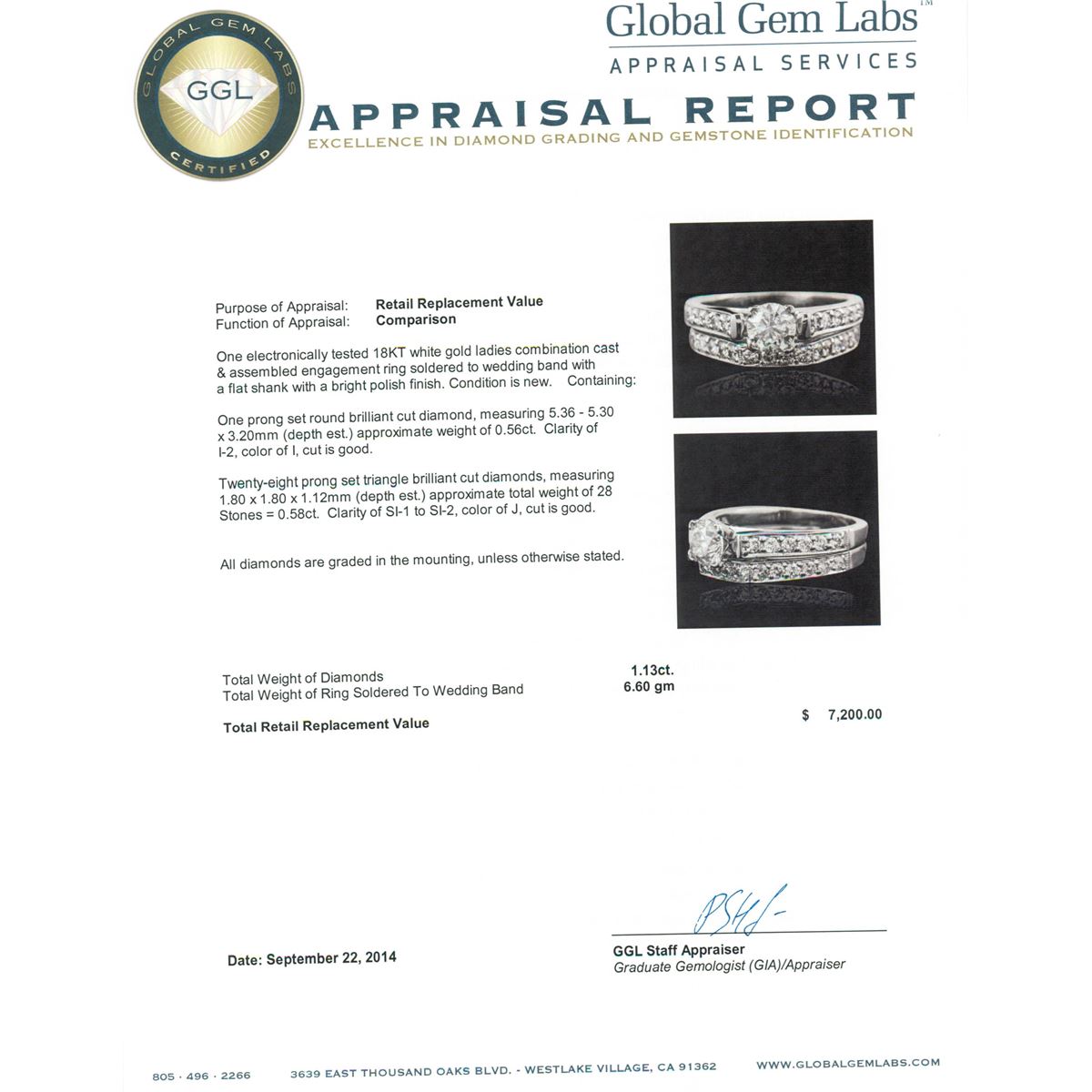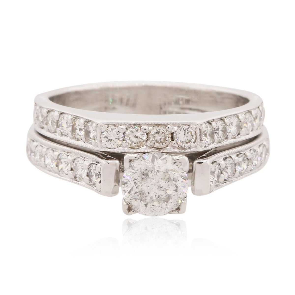 One electronically tested 18KT white gold ladies combination cast & assembled engagement ring soldered to wedding band with a flat shank with a bright polish finish. Condition is new. Containing: One prong set round brilliant cut diamond, measuring 5.36 - 5.30 x 3.20mm (depth est.) approximate weight of 0.56ct. Clarity: I-2. Color: I, Cut is Good. Twenty-Eight prong set triangle brilliant cut diamonds, measuring 1.80 x 1.80 x 1.12mm (depth est.) approximate total weight of 28 Stones = 0.58ct. Clarity: SI-1 to SI-2. Color: J, Cut is Good. All diamonds are graded in the mounting, unless otherwise stated. Total Weight of Diamonds 1.13ct. Total Weight of Ring Soldered To Wedding Band 6.60 grams. GGL Appraised at $7,200.00.