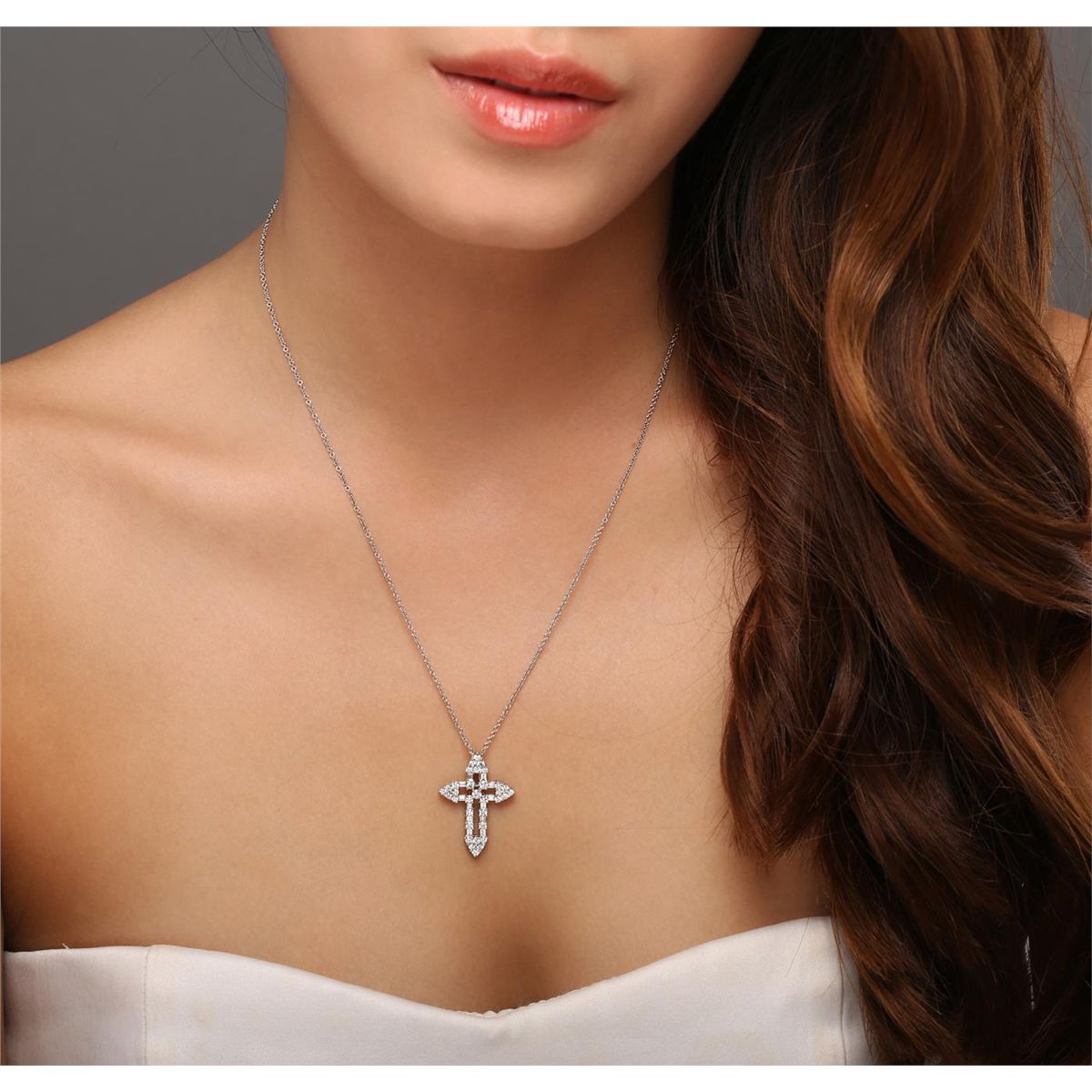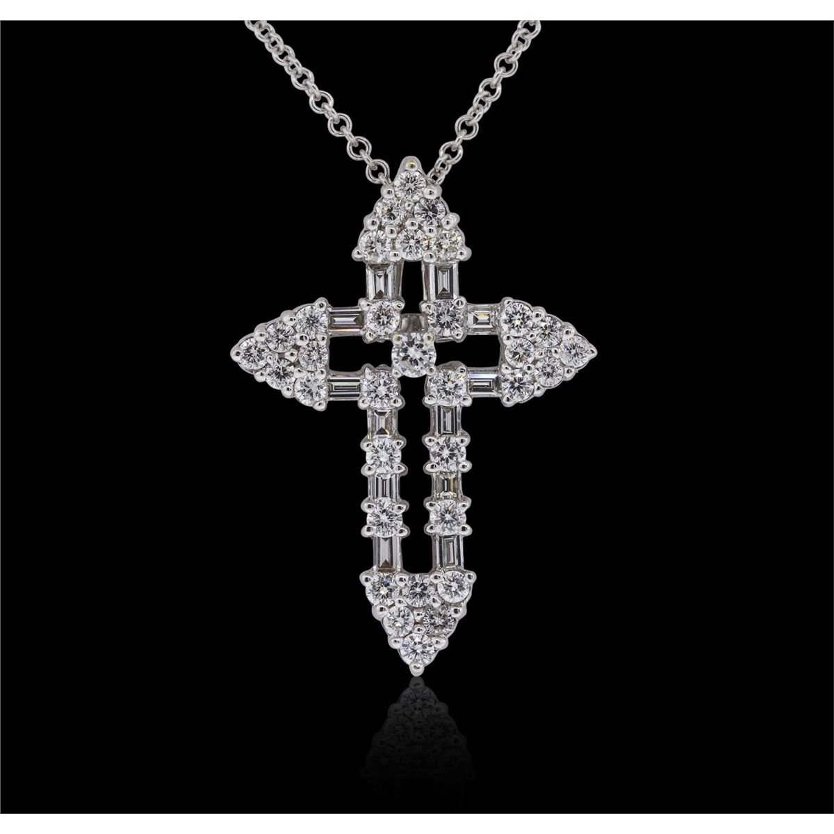 One cross pendant with chain featuring: 18KT white gold weighing 5.90 grams with chain containing 33 brilliant cut and 12 baguette cut diamonds with a total weight of 1.13cts.