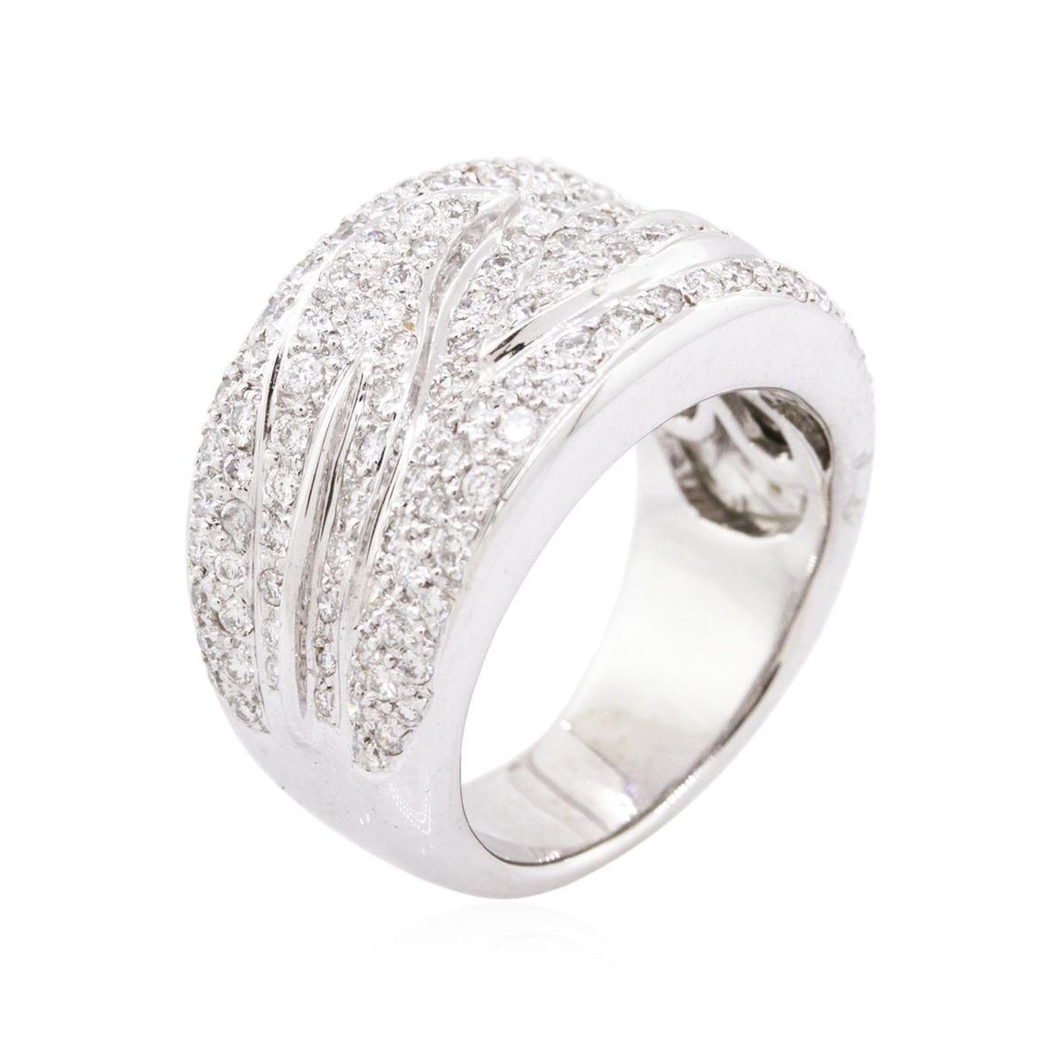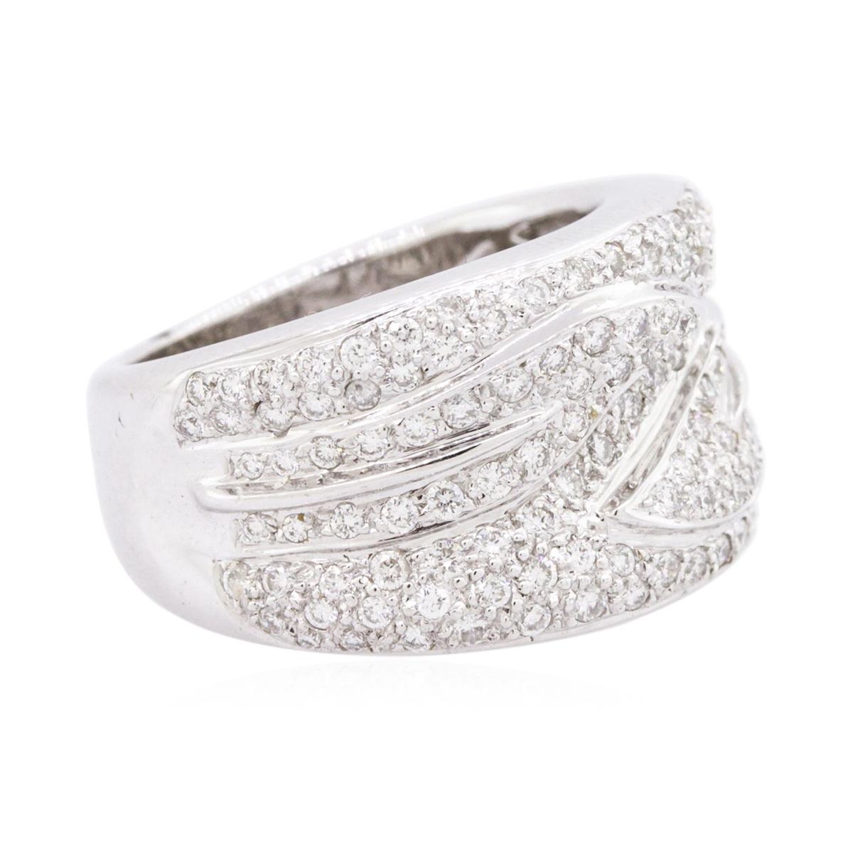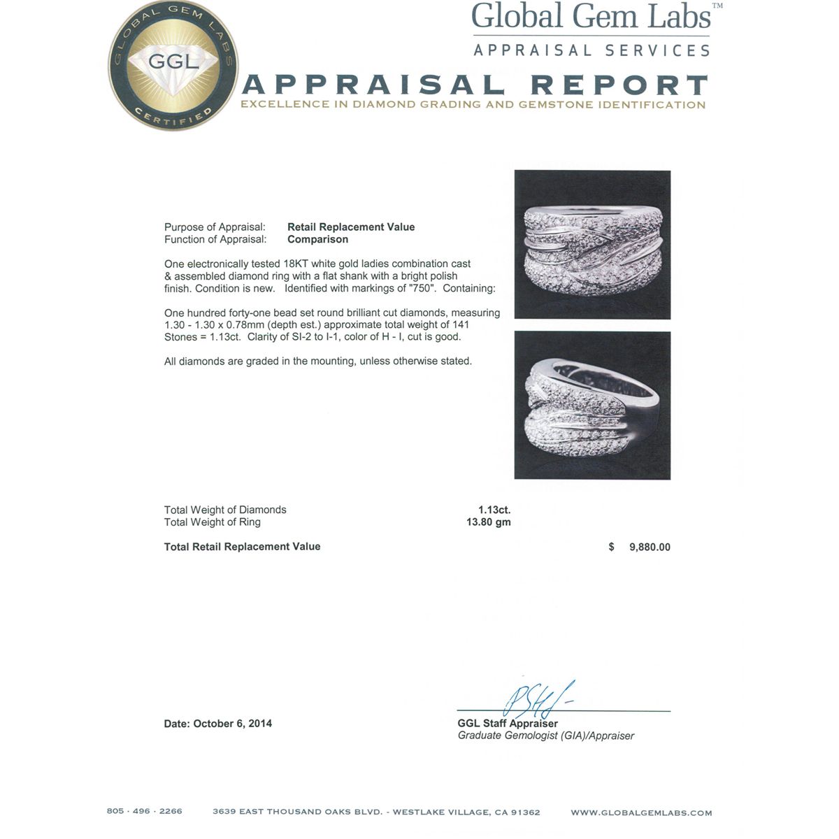 One electronically tested 18KT white gold ladies combination cast & assembled diamond ring with a flat shank with a bright polish finish. Identified with markings of "750". Condition is new. Containing: One Hundred Forty-One bead set round brilliant cut diamonds, measuring 1.30 - 1.30 x 0.78mm (depth est.) approximate total weight of 141 Stones = 1.13ct. Clarity: SI-2 to I-1. Color: H - I, Cut is Good. All diamonds are graded in the mounting, unless otherwise stated. Total Weight of Diamonds 1.13ct. Total Weight of Ring 13.80 grams. GGL Appraised at $9,880.00.