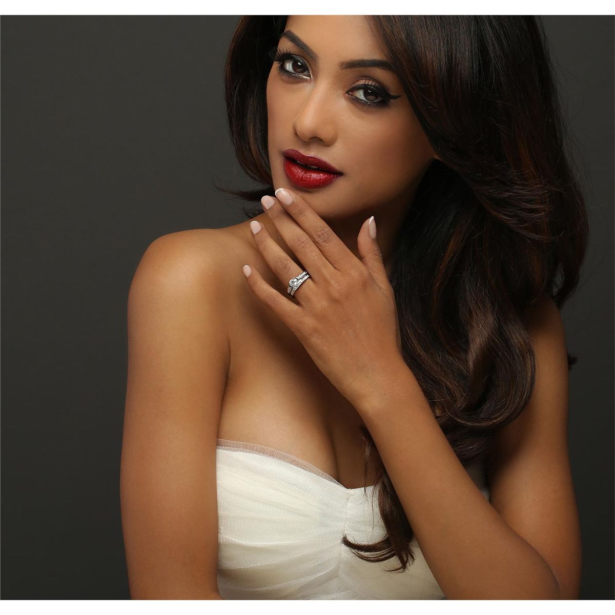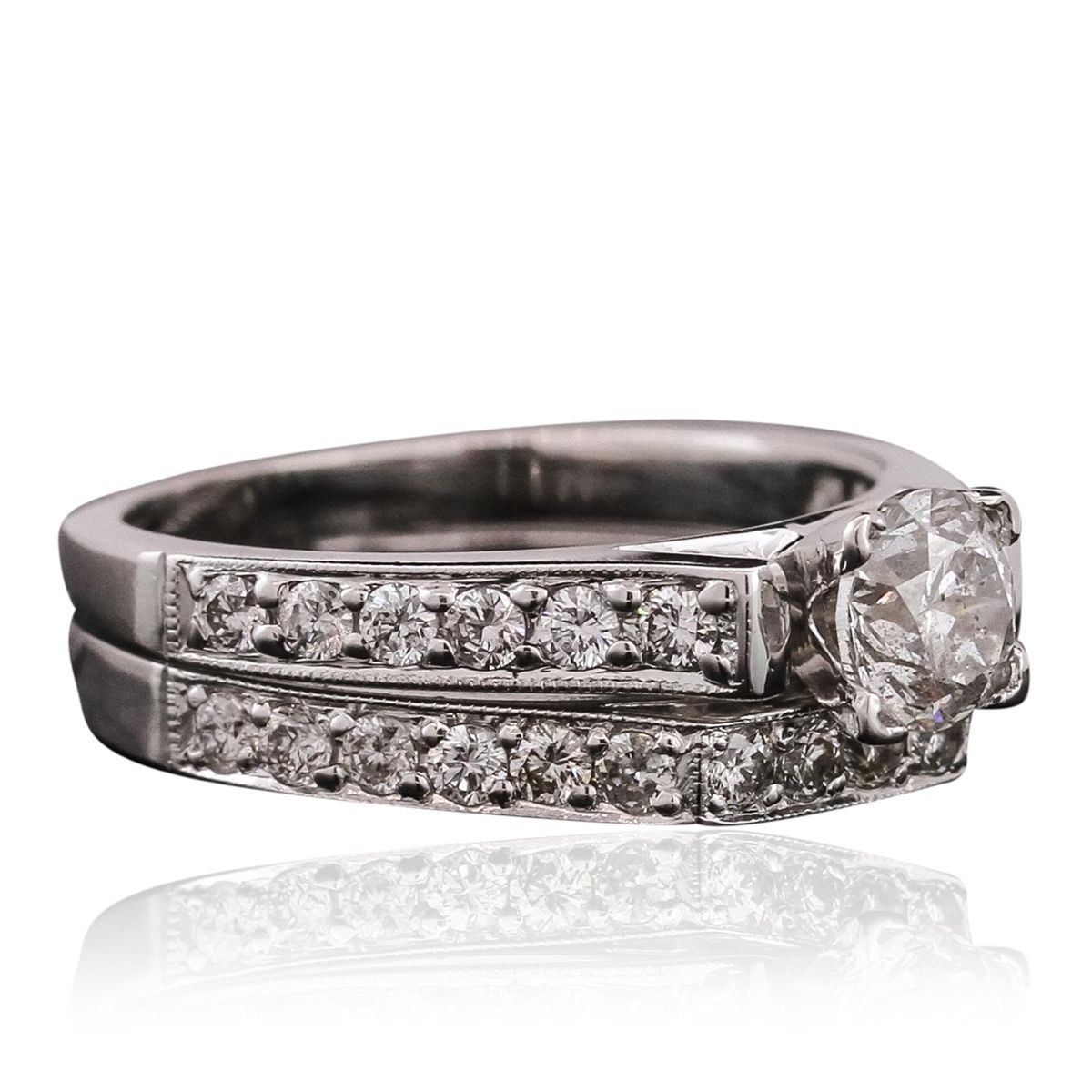 One electronically tested 18KT white gold ladies combination cast & assembled engagement ring soldered to wedding band with a flat shank with a bright polish finish. Condition is new. Containing: One prong set round brilliant cut diamond, measuring 5.36 - 5.30 x 3.20mm (depth est.) approximate weight of 0.56ct. Clarity: I-2. Color: I, Cut is Good. Twenty-Eight prong set triangle brilliant cut diamonds, measuring 1.80 x 1.80 x 1.12mm (depth est.) approximate total weight of 28 Stones = 0.58ct. Clarity: SI-1 to SI-2. Color: J, Cut is Good. All diamonds are graded in the mounting, unless otherwise stated. Total Weight of Diamonds 1.13ct. Total Weight of Ring Soldered To Wedding Band 6.60 grams. GGL Appraised at $7,200.00.
