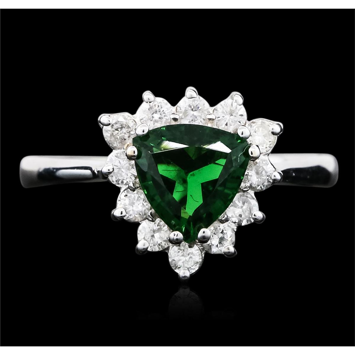 One electronically tested 18KT white gold ladies cast green tourmaline and diamond ring with a bright polish finish. The featured green tourmaline is set within a diamond bezel, completed by a one and one-half millimeter wide band. Identified with markings of "18K". Condition is new, good workmanship. Containing: One prong set triangle mixed cut natural green tourmaline, measuring 7.40 x 7.20 x 3.70mm, 6%. bulge factor, approximate weight of 1.15ct., clarity is eye clean, type I, dark, very slightly grayish, green color, (GIA G 7/3), cut is good. Transmitting light with no distortion, transparent. Graded in the setting. Twelve prong set round brilliant cut diamonds, measuring 2.20 - 2.10 x 1.29mm (depth est.) approximate total weight of 12 Stones = 0.53ct. Graded in the setting. Clarity: I-1 to I-2. Color: F - H. Total Weight of Colored Stones 1.15ct. Total Weight of Diamonds 0.53ct. Total Weight of Ring 3.84 grams. AIG Appraised at $2,245.00.