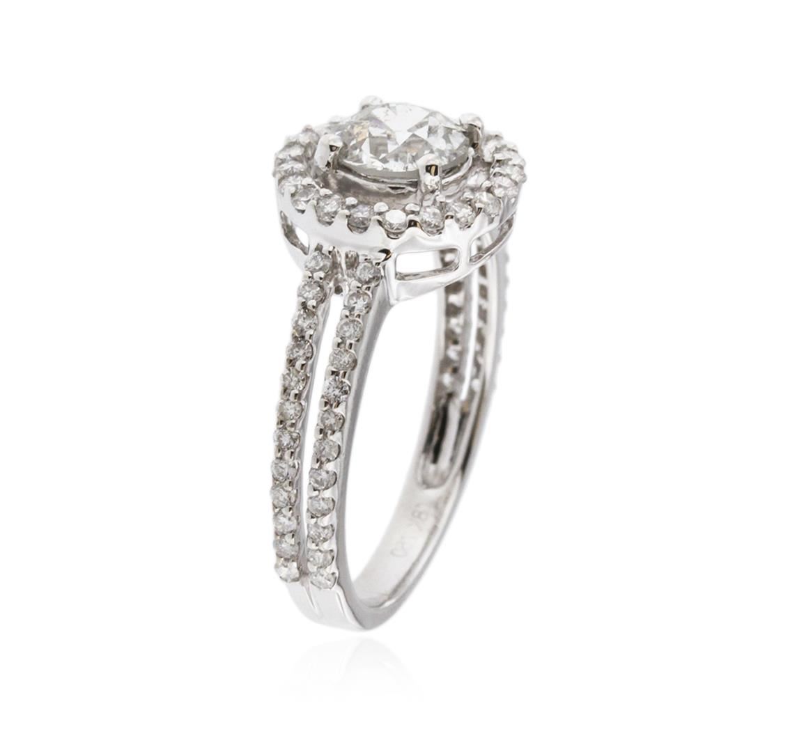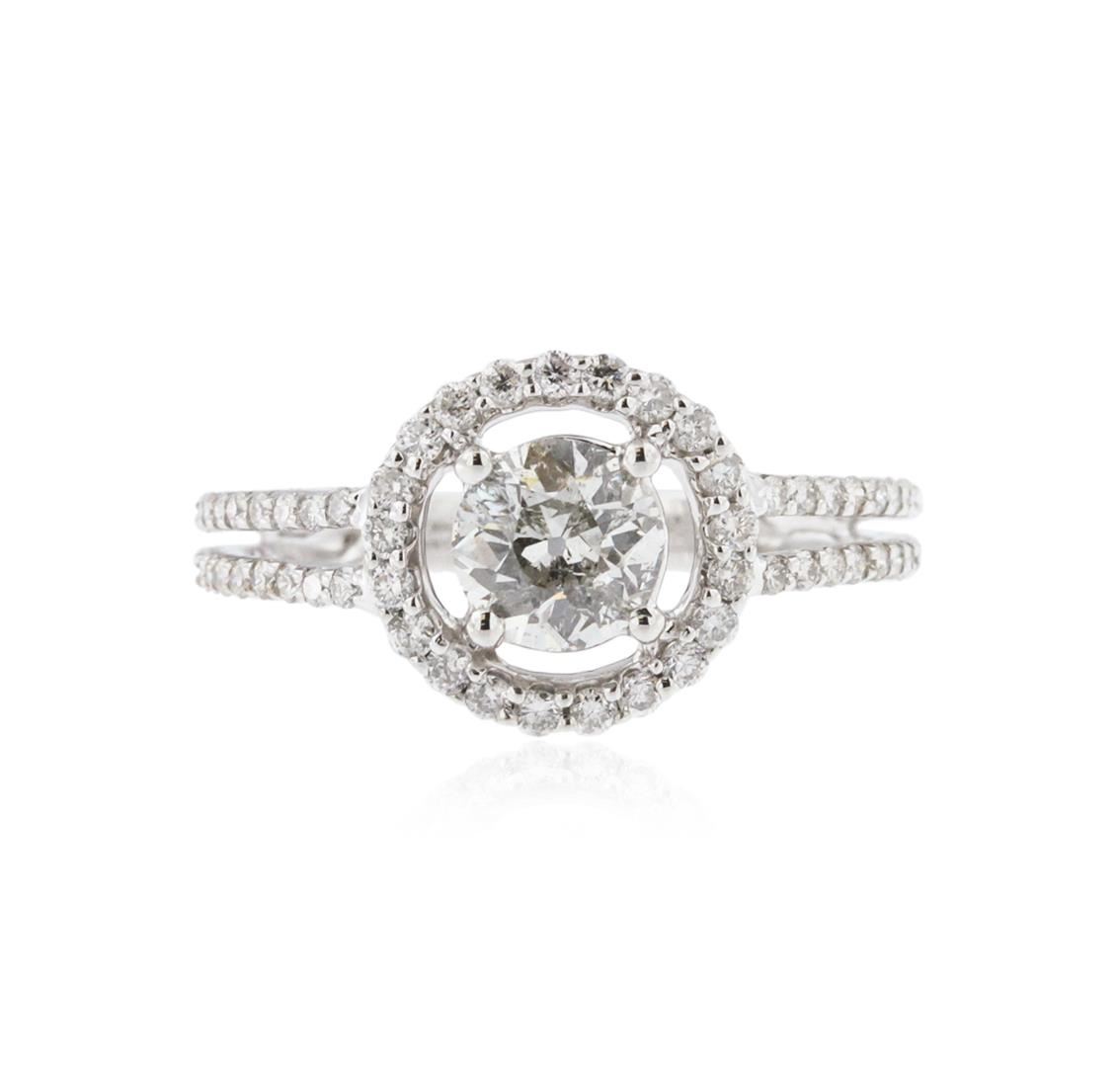 One electronically tested 18KT white gold ladies cast diamond engagement ring with a bright polish finish. Identified with markings of "18K". Condition is new. Containing: One prong set Old European cut diamond, measuring 6.30 - 6.30 x 3.48mm (depth est.) approximate weight of 0.84ct. Clarity: I-2. Color: K. Fifty-Two prong set round brilliant cut diamonds, measuring 1.20 - 1.20 x 0.72mm (depth est.) approximate total weight of 52 Stones = 0.33ct. Clarity: SI-2 to I-1. Color: I, Cut is Good. All diamonds are graded in the mounting, unless otherwise stated. Total Weight of Diamonds 1.17ct. Total Weight of Engagement Ring 4.00 grams. GGL Appraised at $4,700.00.