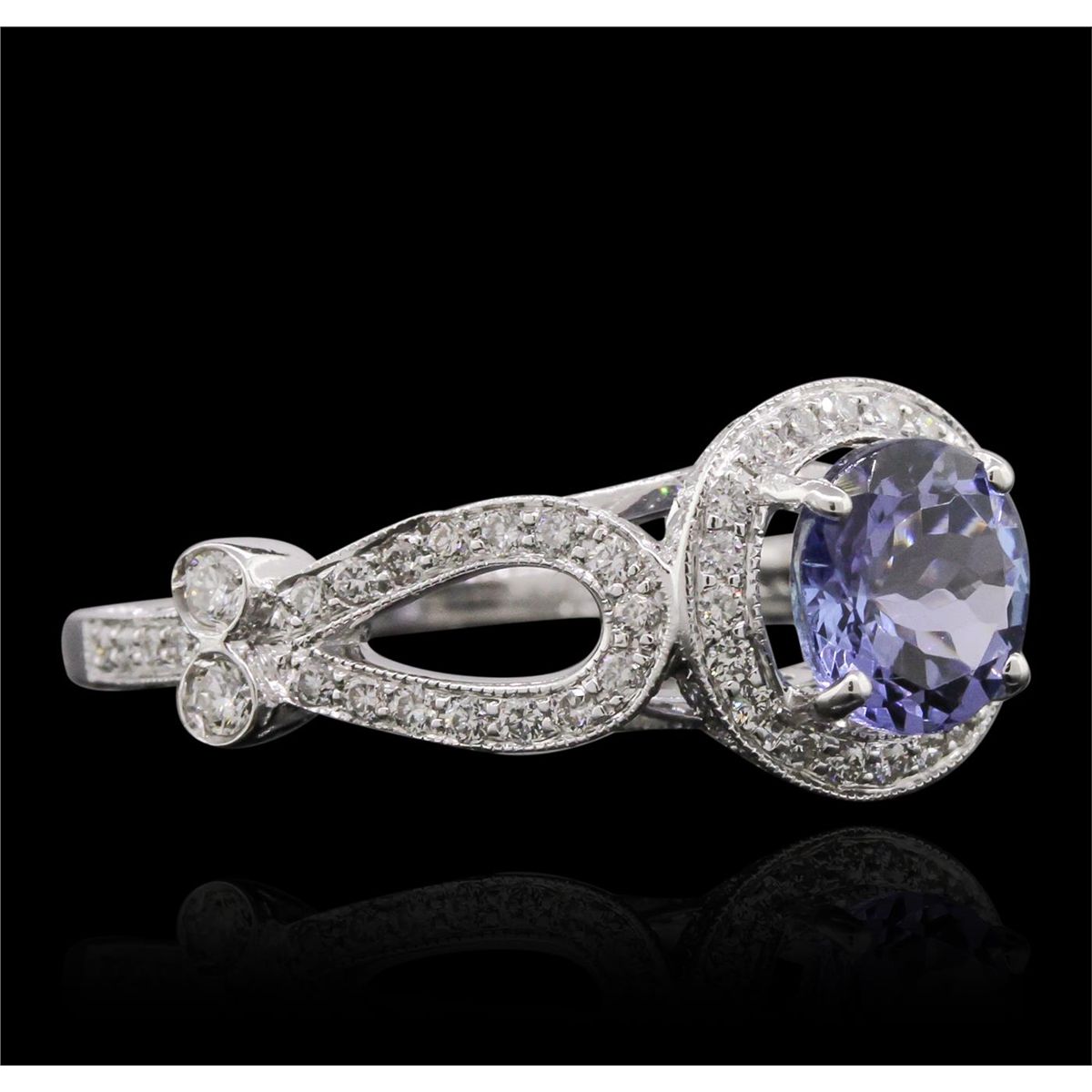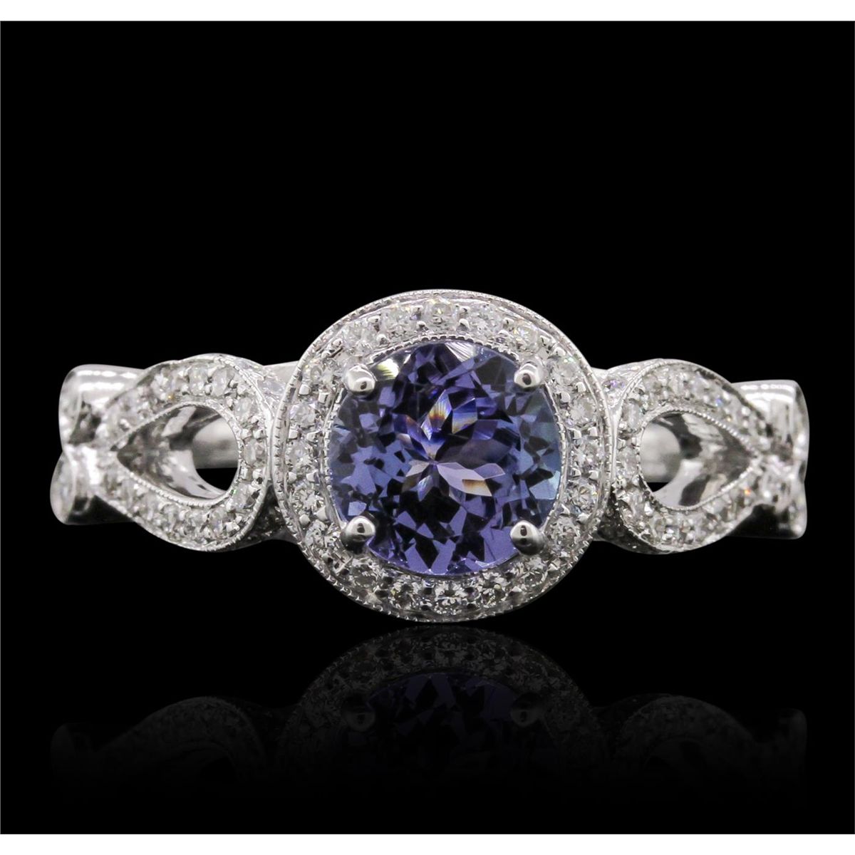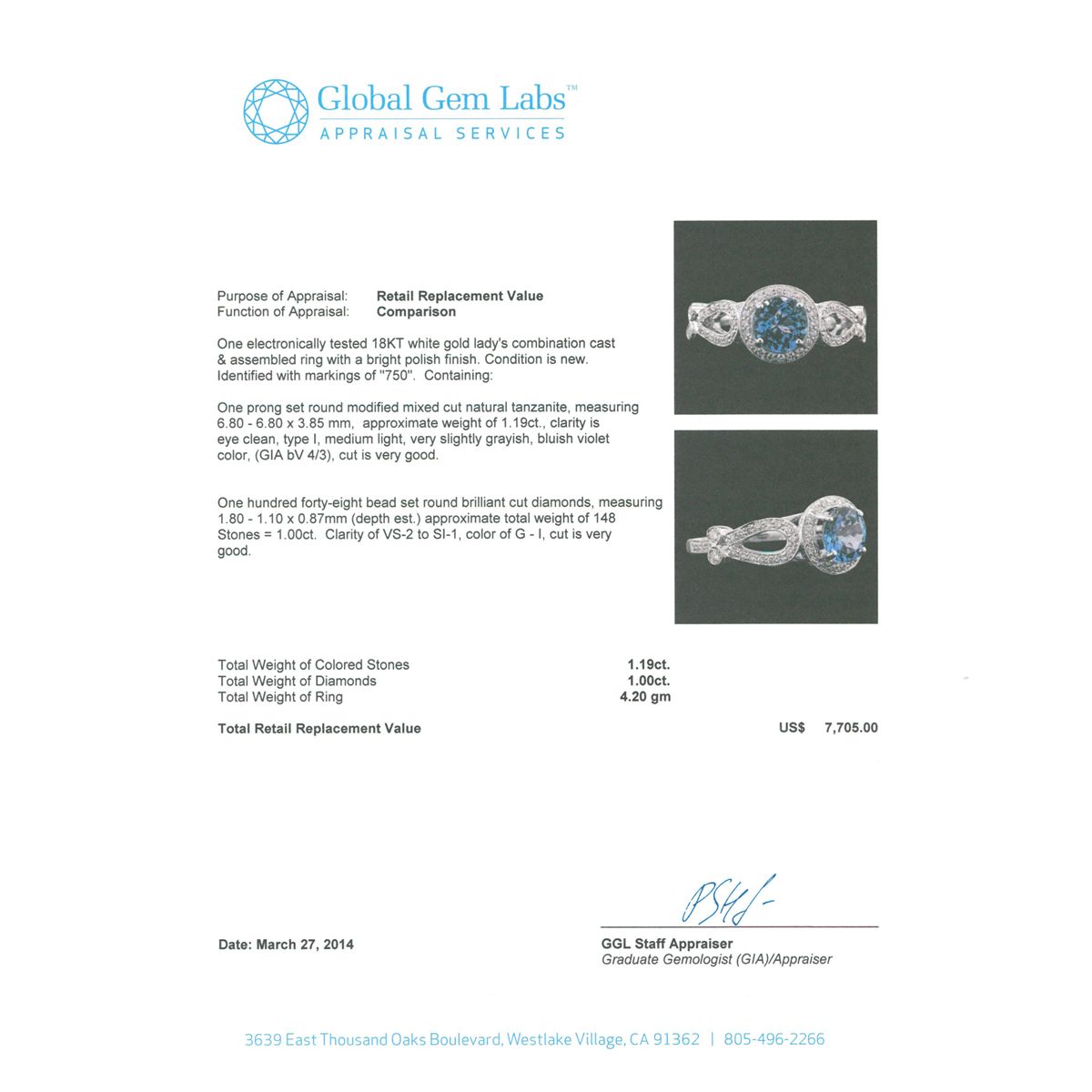 One electronically tested 18KT white gold Ladies combination cast & assembled ring with a bright polish finish. Condition is new. Identified with markings of "750". Containing: One prong set round modified mixed cut natural tanzanite, measuring 6.80 - 6.80 x 3.85 mm, approximate weight of 1.19ct., clarity is eye clean, type I, medium light, very slightly grayish, bluish violet color, (GIA bV 4/3), cut is very good. One Hundred Forty-Eight bead set round brilliant cut diamonds, measuring 1.80 - 1.10 x 0.87mm (depth est.) approximate. Total Weight of 148 Stones = 1.00.ct. Clarity: VS-2 to SI-1. Color: G - I, Cut is Very Good. Total Weight of Colored Stones 1.19ct. Total Weight of Diamonds 1.00.ct. Total Weight of Ring 4.20 grams. GGL Appraised at $7,705.00.