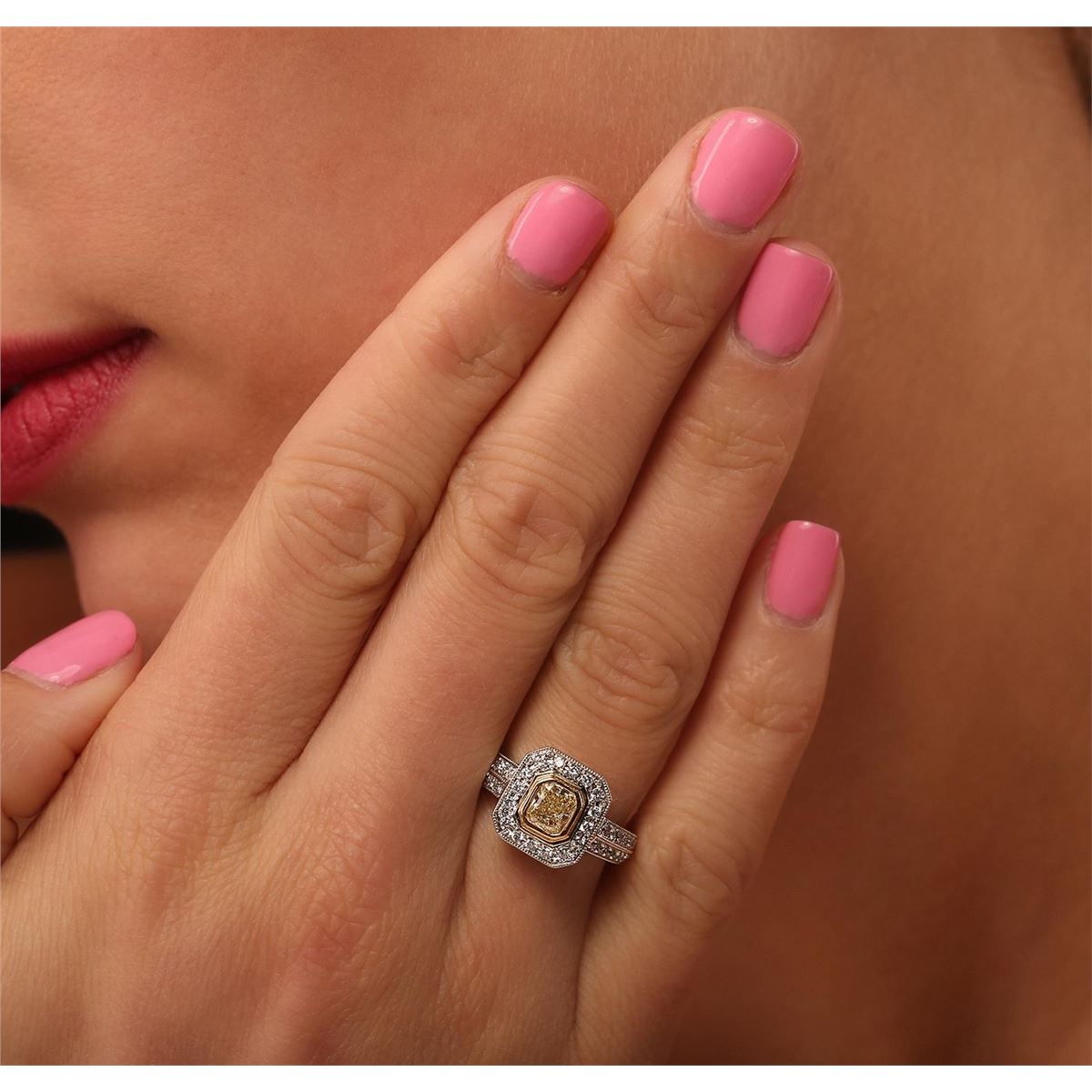 One electronically tested 18KT white gold ladies cast diamond ring. Condition is new, good workmanship. The featured diamond is set within a diamond bezel, supported by diamond set shoulders and completed by a three millimeter wide band. Bright polish finish with a milgrain detailing throughout. Identified with markings of "750". Containing: One bezel set radiant shaped cut diamond, measuring 5.30 x 4.40 x 2.85mm (depth est) approximate weight of 0.60ct. Graded in the setting. Clarity SI-1 Color M Depth 64.8% Table 63.6%. Fifty-four bead set round brilliant cut diamonds, measuring 1.50 - 1.40 x 0.87mm (depth est) approximate total weight of 54 Stones = 0.61ct. Graded in the setting. Clarity VS-2 to SI-2 Color F-H. Total Weight of Diamonds 1.21ct. Total Weight of Ring 6.00 grams. AIG Appraised at $7,600.00.