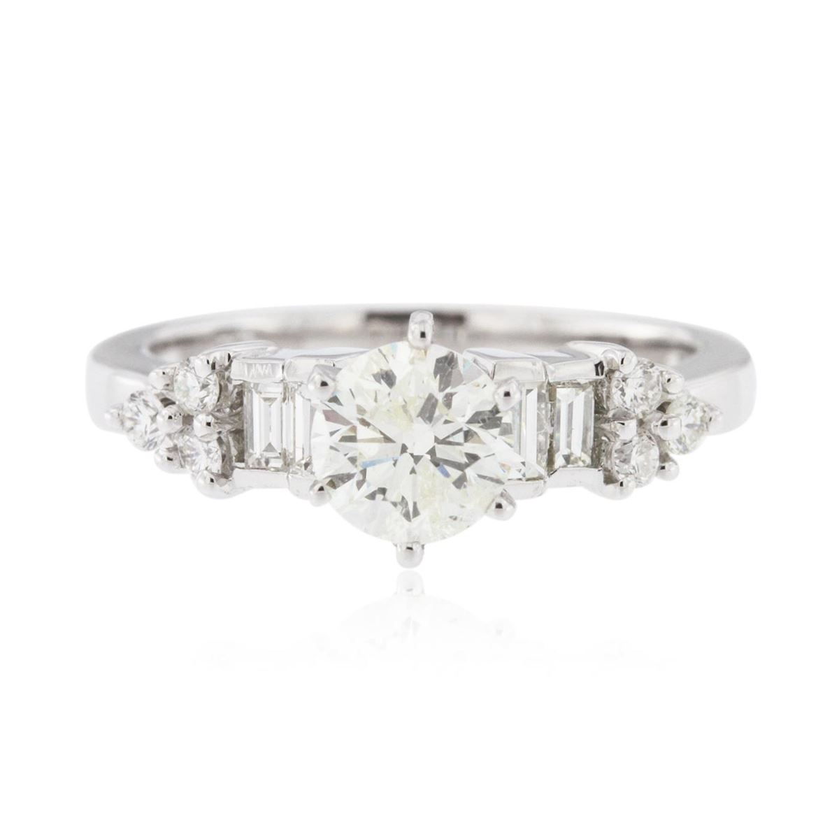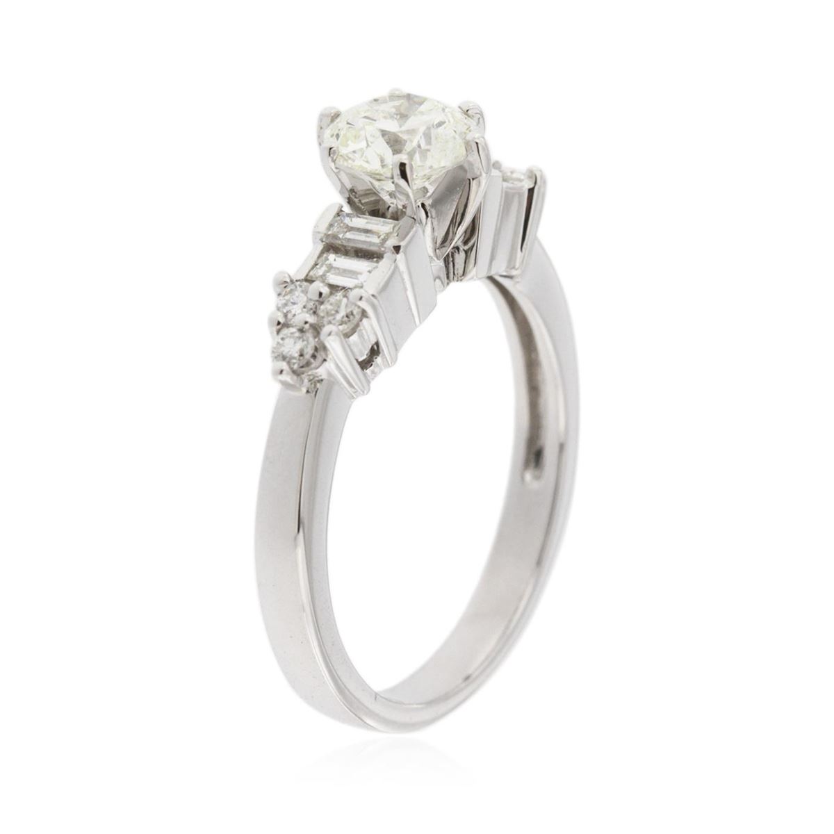 One electronically tested 18KT white gold ladies cast diamond unity ring with a bright finish. Condition is good. The featured diamond is set within tapering diamond set shoulders, completed by a three millimeter wide band. Identified with markings of "18K". Containing: One prong set round brilliant cut diamond, measuring 6.00 - 5.90 x 3.85mm (depth est.), 4.00%. GTCF approximate weight of 0.85ct with a medium strong 3.48 fluorescence. Clarity: I-1 . Depth: 64.7%. Table 58.3%. Four channel set baguette cut diamonds, measuring from 3.00 x 1.70 x 1.16mm (depth est.) to 3.30 x 1.88 x 1.28mm (depth est.) approximate. Total Weight of 4 Stones = 0.26ct. Graded in the setting. Clarity: VS-1 to SI-1 Six prong set round brilliant cut diamonds, measuring 1.95 - 1.90 x 1.16mm (depth est.) approximate. Total Weight of 6 Stones = 0.16ct. Graded in the setting. Clarity: SI-1 to I-1 . Color: I - K. Total Weight of Diamonds 1.27ct.. Total Weight of Ring 4.89 grams. AIG Appraised at $5,220.00.