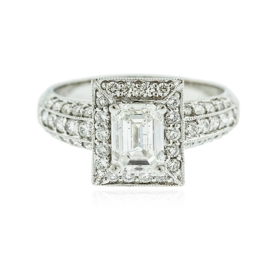 One electronically tested 18KT white gold ladies cast diamond engagement ring with a half round shank with a bright polish finish. Identified with markings of "K18". Condition is new. Containing: One prong set emerald cut diamond, measuring 6.73 x 4.83 x 3.24mm (depth est.) approximate weight of 0.97ct. Clarity: I-1. Color: J, Cut is Good. Forty-Eight prong set round brilliant cut diamonds, measuring 1.30 - 1.10 x 0.72mm (depth est.) approximate total weight of 48 Stones = 0.30ct. Clarity: SI-1. Color: I - J, Cut is Good. All diamonds are graded in the mounting, unless otherwise stated. Total Weight of Diamonds 1.27ct. Total Weight of Engagement Ring 5.10 grams. GGL Appraised at $7,155.00.