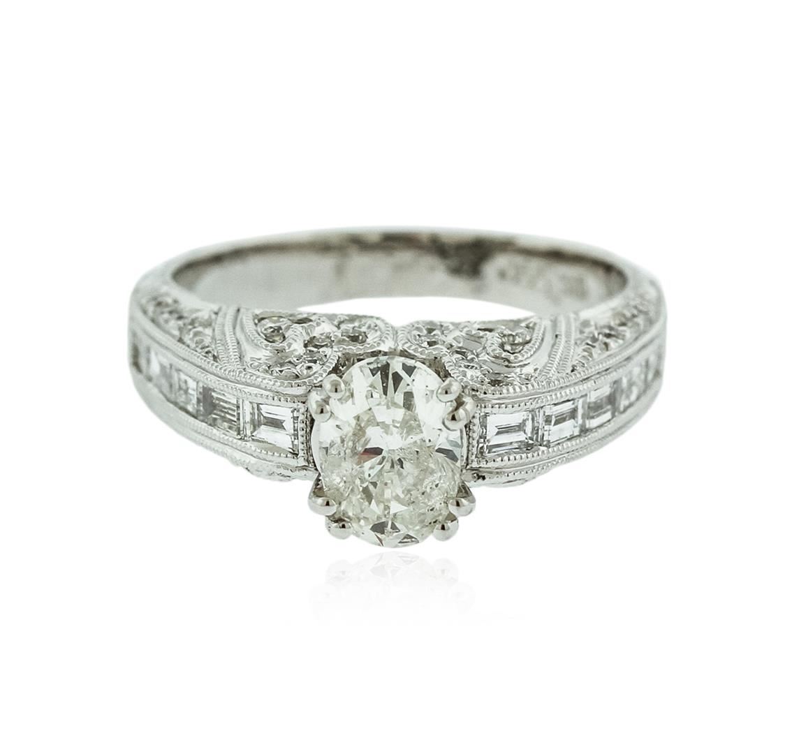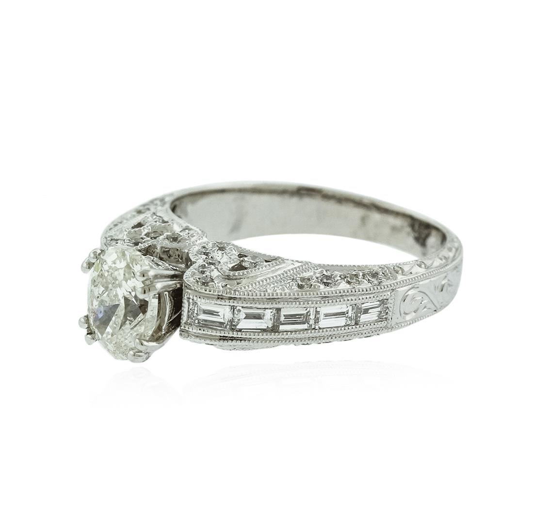 One electronically tested 18KT white gold ladies cast diamond engagement ring with a flat shank with a bright polish finish. Identified with markings of "18K 750". Condition is new. Containing: One prong set oval shaped cut diamond, measuring 7.09 x 5.00 x 3.15mm (depth est.) approximate weight of 0.71ct. Clarity: I-2. Color: J, Cut is Good. Ten channel set baguette cut diamonds, measuring 2.00 x 1.50 x 1.28mm (depth est.) approximate total weight of 10 Stones = 0.35ct. Clarity: SI-1. Color: H - I, Cut is Good. Forty prong set round brilliant cut diamonds, measuring 1.50 - 1.10 x 0.78mm (depth est.) approximate total weight of 40 Stones = 0.20ct. Clarity: SI-1 to SI-2. Color: H - I, Cut is Good. All diamonds are graded in the mounting, unless otherwise stated. Total Weight of Diamonds 1.27ct. Total Weight of Engagement Ring 6.70 grams. GGL Appraised at $6,150.00.