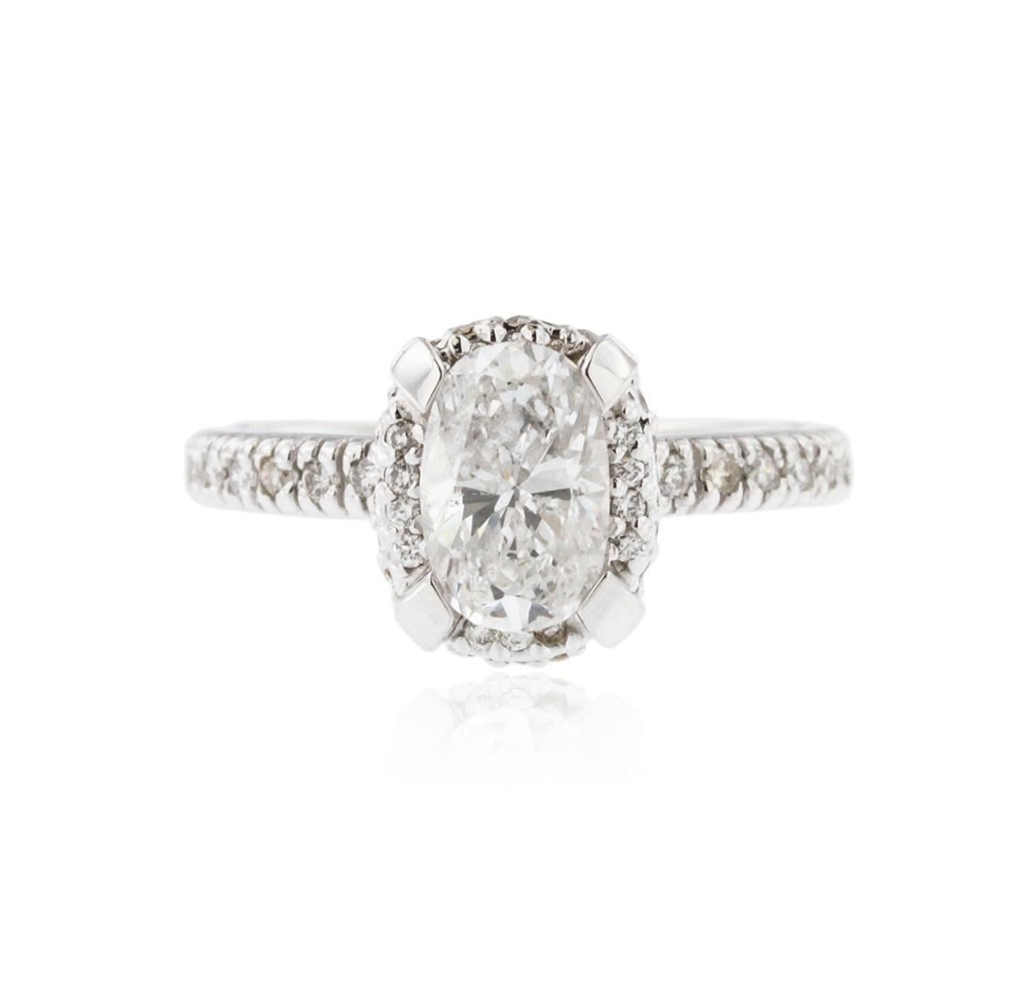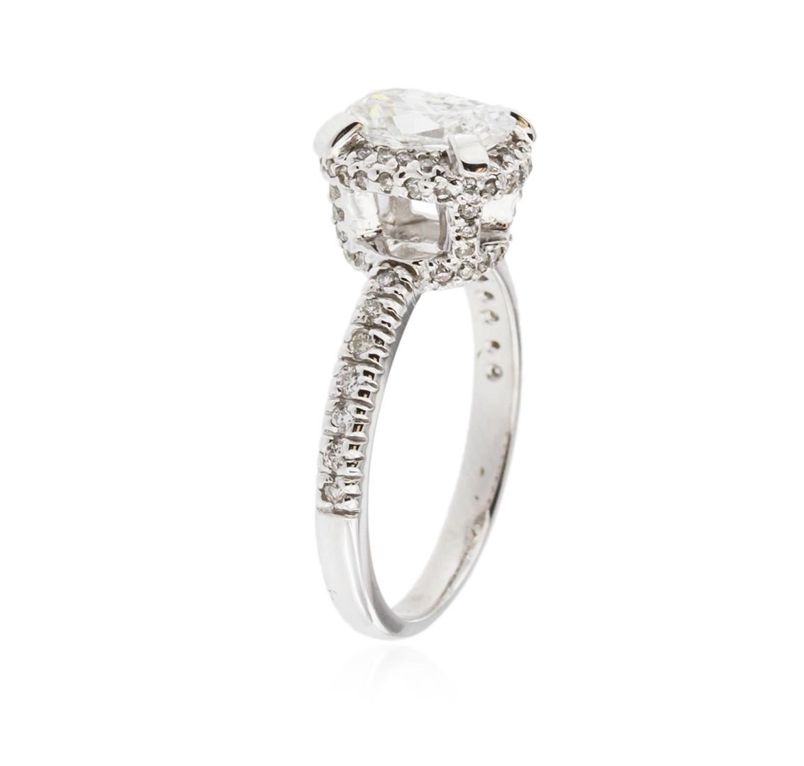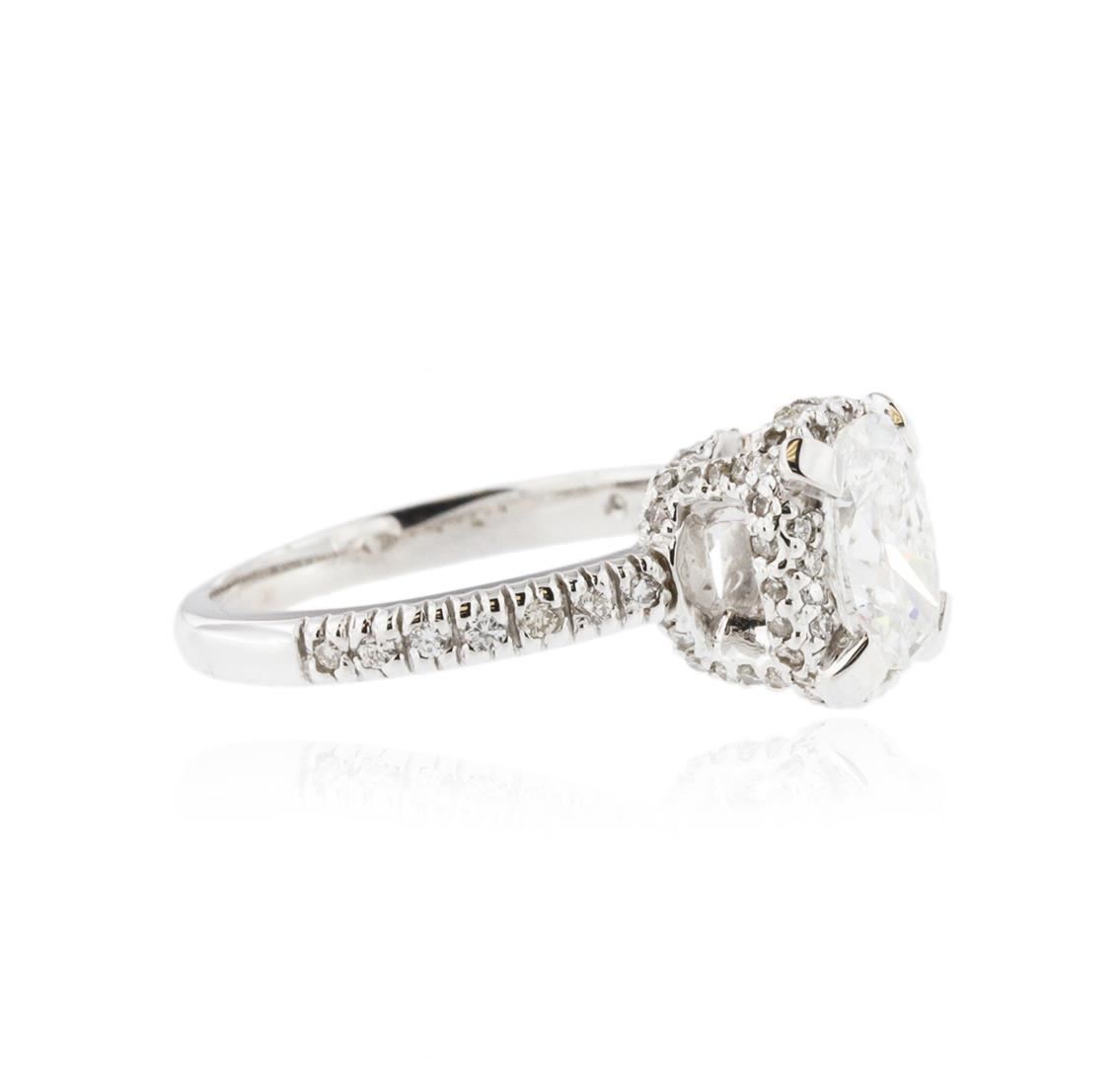 One electronically tested 18KT white gold ladies cast diamond engagement ring with a bright polish finish. Identified with markings of "18K". Condition is new. Containing: One prong set oval shaped cut diamond, measuring 8.20 x 5.30 x 3.34mm (depth est.) approximate weight of 0.94ct. Clarity: I-2. Color: G. Seventy-Two prong set round brilliant cut diamonds, measuring 1.10 - 1.10 x 0.66mm (depth est.) approximate total weight of 72 Stones = 0.35ct. Clarity: SI-2 to I-1. Color: I - J, Cut is Good. All diamonds are graded in the mounting, unless otherwise stated. Total Weight of Diamonds 1.29ct. Total Weight of Engagement Ring 4.30 grams. GGL Appraised at $5,490.00.