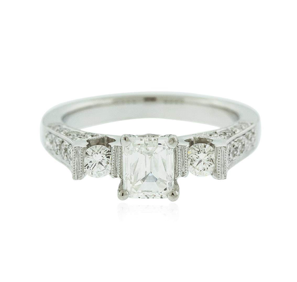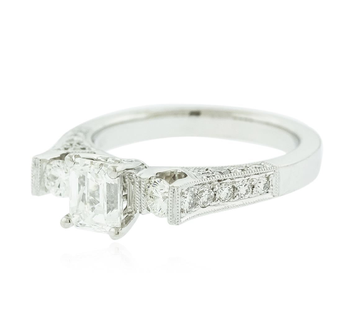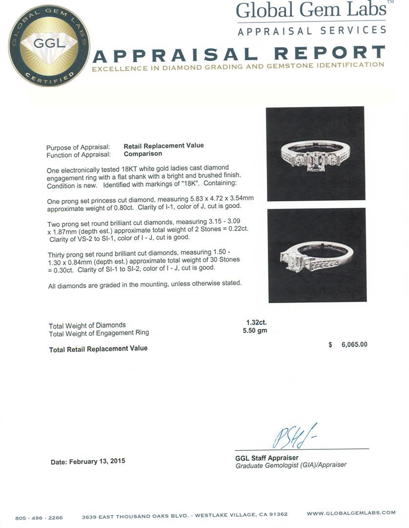 One electronically tested 18KT white gold ladies cast diamond engagement ring with a flat shank with a bright and brushed finish. Identified with markings of "18K". Condition is new. Containing: One prong set princess cut diamond, measuring 5.83 x 4.72 x 3.54mm approximate weight of 0.80ct. Clarity: I-1. Color: J, Cut is Good. Two prong set round brilliant cut diamonds, measuring 3.15 - 3.09 x 1.87mm (depth est.) approximate total weight of 2 Stones = 0.22ct. Clarity: VS-2 to SI-1. Color: I - J, Cut is Good. Thirty prong set round brilliant cut diamonds, measuring 1.50 - 1.30 x 0.84mm (depth est.) approximate total weight of 30 Stones = 0.30ct. Clarity: SI-1 to SI-2. Color: I - J, Cut is Good. All diamonds are graded in the mounting, unless otherwise stated. Total Weight of Diamonds 1.32ct. Total Weight of Engagement Ring 5.50 grams. GGL Appraised at $6,065.00.
