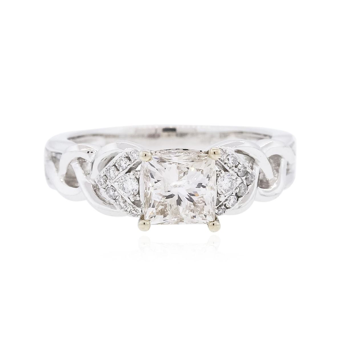 One electronically tested 18KT white gold ladies combination cast & assembled engagement ring with a bright polish finish. Identified with markings of "750". Condition is new. Containing: One prong set princess cut diamond, measuring 5.75 x 5.70 x 4.40mm (depth est.) approximate weight of 1.18ct. Clarity: I-1. Color: J, Cut is Good. Sixteen prong set round brilliant cut diamonds, measuring 1.80 - 1.10 x 0.87mm (depth est.) approximate total weight of 16 Stones = 0.16ct. Clarity: SI-1. Color: I - J, Cut is Good. All diamonds are graded in the mounting, unless otherwise stated. Total Weight of Diamonds 1.34ct. Total Weight of Ring 4.90 grams. GGL Appraised at $17,130.00.