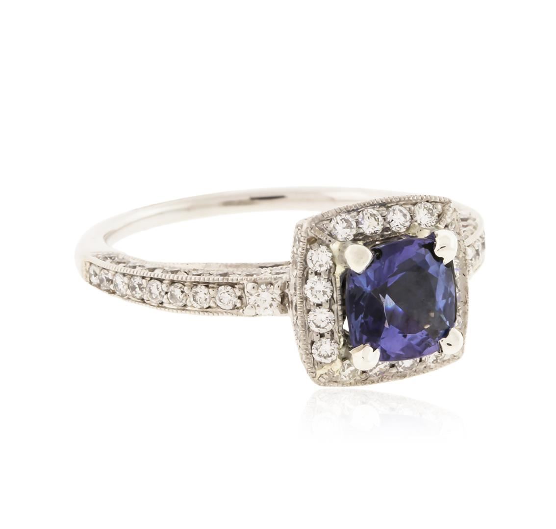 One electronically tested 18KT white gold ladies cast tanzanite and diamond ring with a bright polish finish. Identified with markings of "18K". Condition is new. Containing: One prong set oval square cushion modified brilliant cut natural tanzanite, measuring 6.40 x 6.40 x 4.16mm, approximate weight of 1.34ct., clarity is eye clean, type I, medium light, very slightly grayish, bluish violet color, (GIA bV 4/3), cut is good. One Hundred Two prong set round brilliant cut diamonds, measuring 1.20 - 1.20 x 0.72mm (depth est.) approximate total weight of 102 Stones = 0.64ct. Clarity: SI-1 to SI-2. Color: I - J, Cut is Good. Colored gemstones are presumed to have been subjected to commonly used enhancement processes. All diamonds and colored gemstones are graded in the mounting, unless otherwise stated. Total Weight of Colored Stones 1.34ct. Total Weight of Diamonds 0.64ct. Total Weight of Ring 3.90 grams. GGL Appraised at $3,440.00.