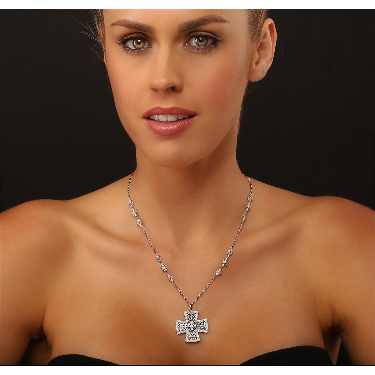One electronically tested 18KT white gold Ladies combination cast & die struck religious pendant & chain 16.0" long, medium open cable link with a lobster claw clasp with a bright polish finish. Pendant measures: 1.10" x 1.10". Condition is new. Containing: Twenty-Nine bezel set round brilliant cut diamonds, measuring 2.80 - 2.00 x 1.44mm (depth est.) approximate total weight of 29 Stones = 1.00ct. Clarity of SI-1 to SI-2, Color of G - H, Cut is Good. Seventy-One bead set round brilliant cut diamonds, measuring 1.20 - 1.20 x 0.72mm (depth est.) approximate total weight of 71 Stones = 0.34ct. Clarity of VS-2 to SI-1, Color of G - H, Cut is Very Good. Total Weight of Diamonds 1.34ct. Total Weight of Pendant & Chain 21.40gm. GGL Appraised at $14,205.00.