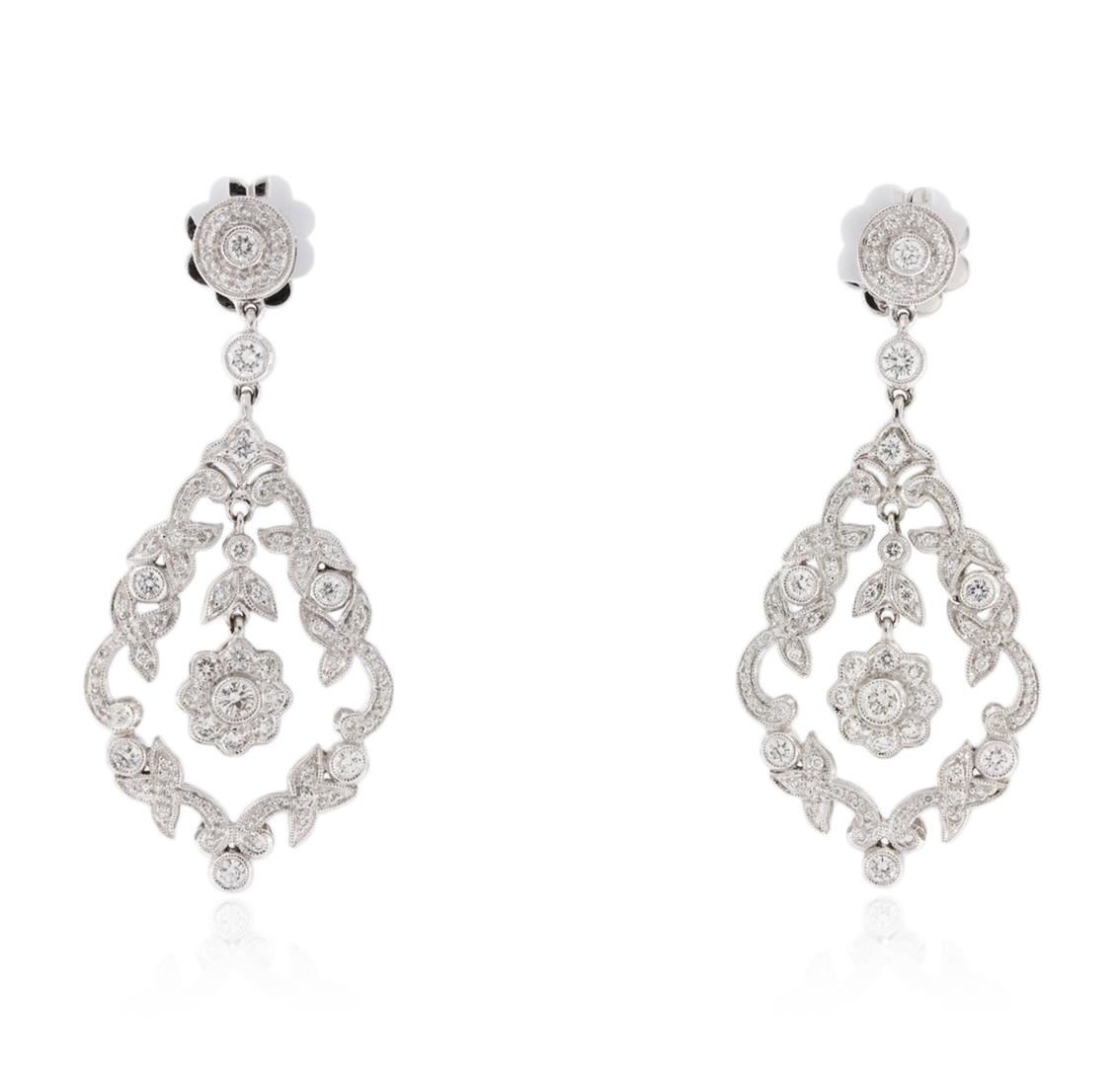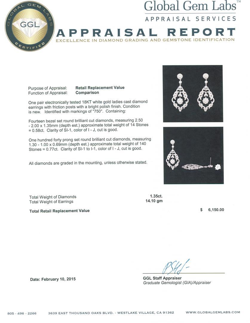 One pair electronically tested 18KT white gold ladies cast diamond earrings with friction posts with a bright polish finish. Identified with markings of "750". Condition is new. Containing: Fourteen bezel set round brilliant cut diamonds, measuring 2.50 - 2.00 x 1.35mm (depth est.) approximate total weight of 14 Stones = 0.58ct. Clarity: SI-1. Color: I - J, Cut is Good. One Hundred Forty prong set round brilliant cut diamonds, measuring 1.30 - 1.00 x 0.69mm (depth est.) approximate total weight of 140 Stones = 0.77ct. Clarity: SI-1 to I-1. Color: I - J, Cut is Good. All diamonds are graded in the mounting, unless otherwise stated. Total Weight of Diamonds 1.35ct. Total Weight of Earrings 14.10 grams. GGL Appraised at $6,150.00.