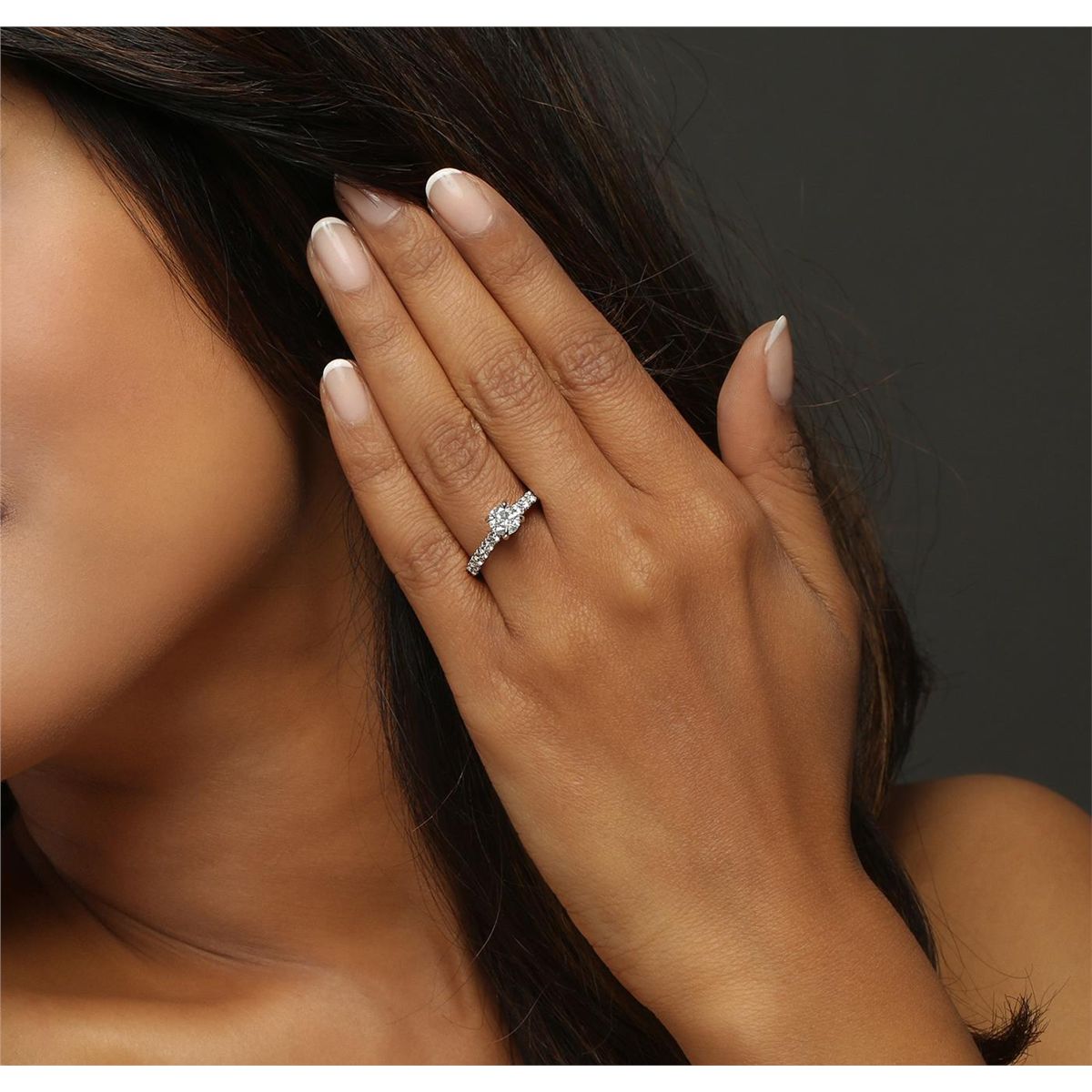 One electronically tested 18KT white gold ladies combination cast & assembled engagement ring with a flat shank with a bright polish finish. Identified with markings of "750". Condition is new. Containing: One prong set round brilliant cut diamond, measuring 5.80 - 5.79 x 3.48mm (depth est.) approximate weight of 0.71ct. Clarity: I-2. Color: G, Cut is Good. Twenty prong set triangle brilliant cut diamonds, measuring 2.10 x 2.10 x 1.30mm (depth est.) approximate total weight of 20 Stones = 0.65ct. Clarity: SI-1 to SI-2. Color: I - J, Cut is Good. All diamonds are graded in the mounting, unless otherwise stated. Total Weight of Diamonds 1.37ct. Total Weight of Ring 4.00 grams. GGL Appraised at $8,705.00.