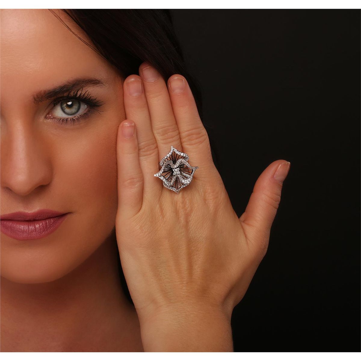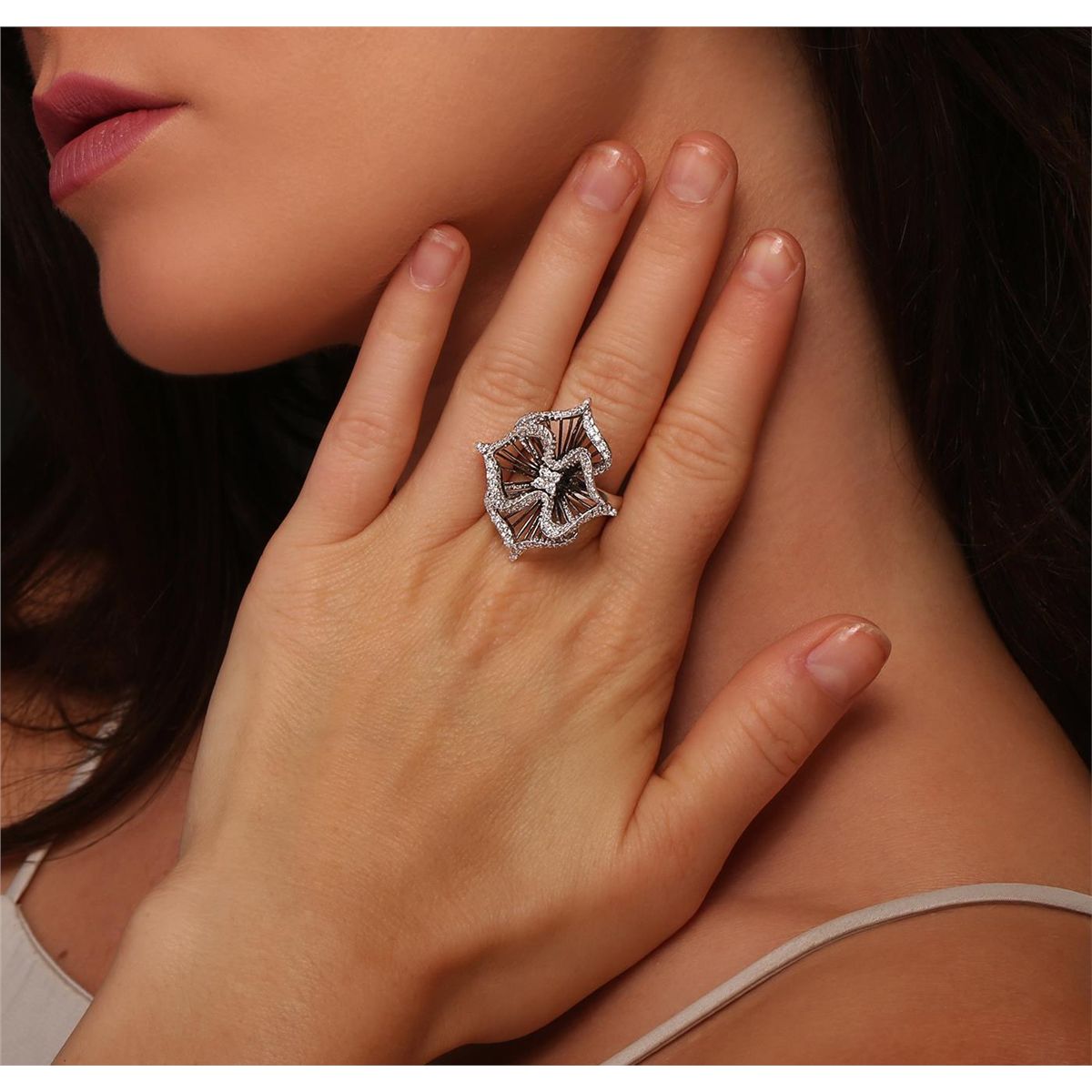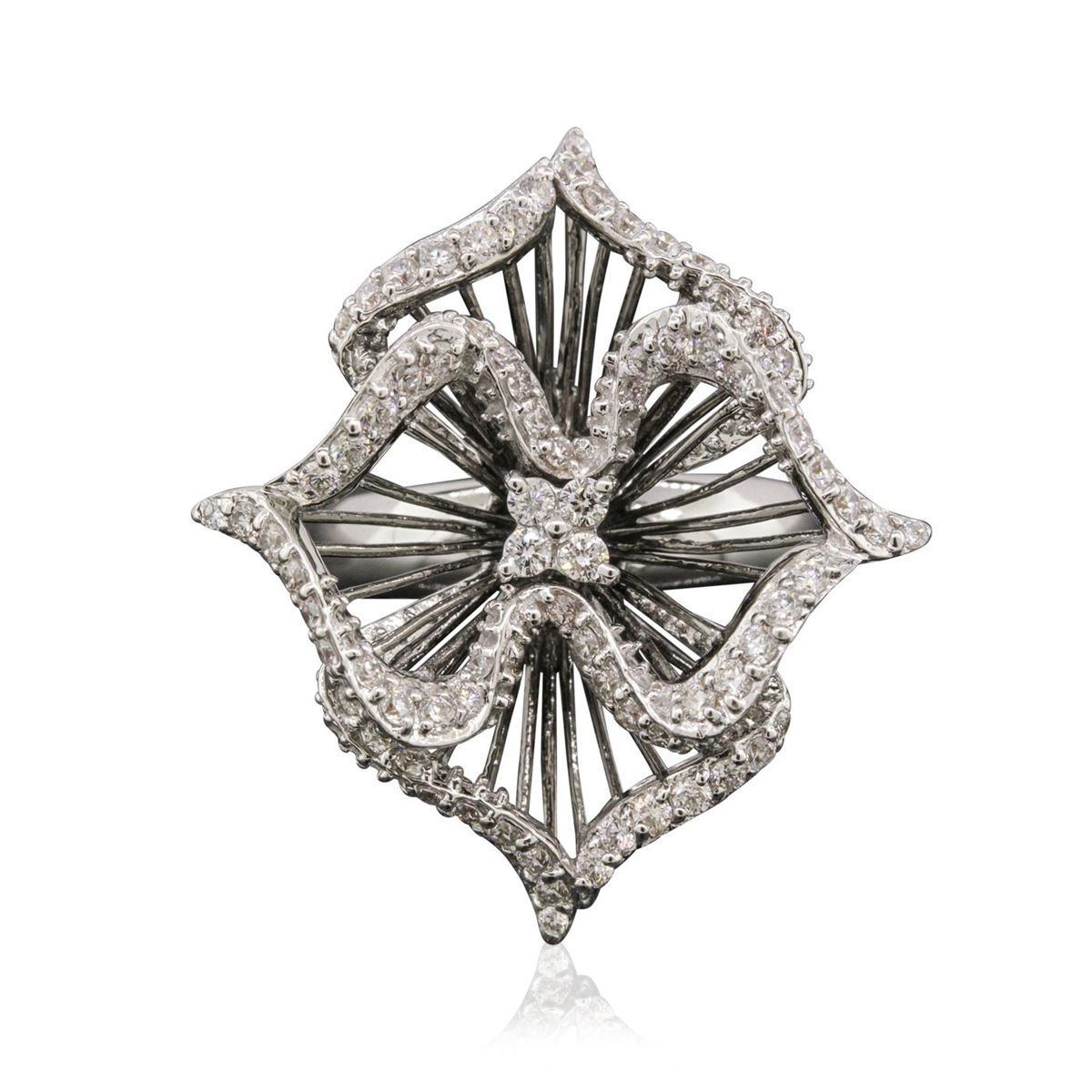 One electronically tested 18KT white gold ladies cast diamond flower ring with a bright and anodized finish. Condition is new, good workmanship. The ring is completed by a three millimeter wide band. Identified with markings of "K18". Containing: Seventy-Eight prong set round brilliant cut diamonds, measuring 1.80 - 1.50 x 0.99mm (depth est.) approximate. Total Weight of 78 Stones = 1.37ct. Graded in the setting. Clarity: VS-2 to SI-1. Color: G - I. Total Weight of Diamonds 1.37ct. Total Weight of Ring 11.78 grams. AIG Appraised at $7,765.00.