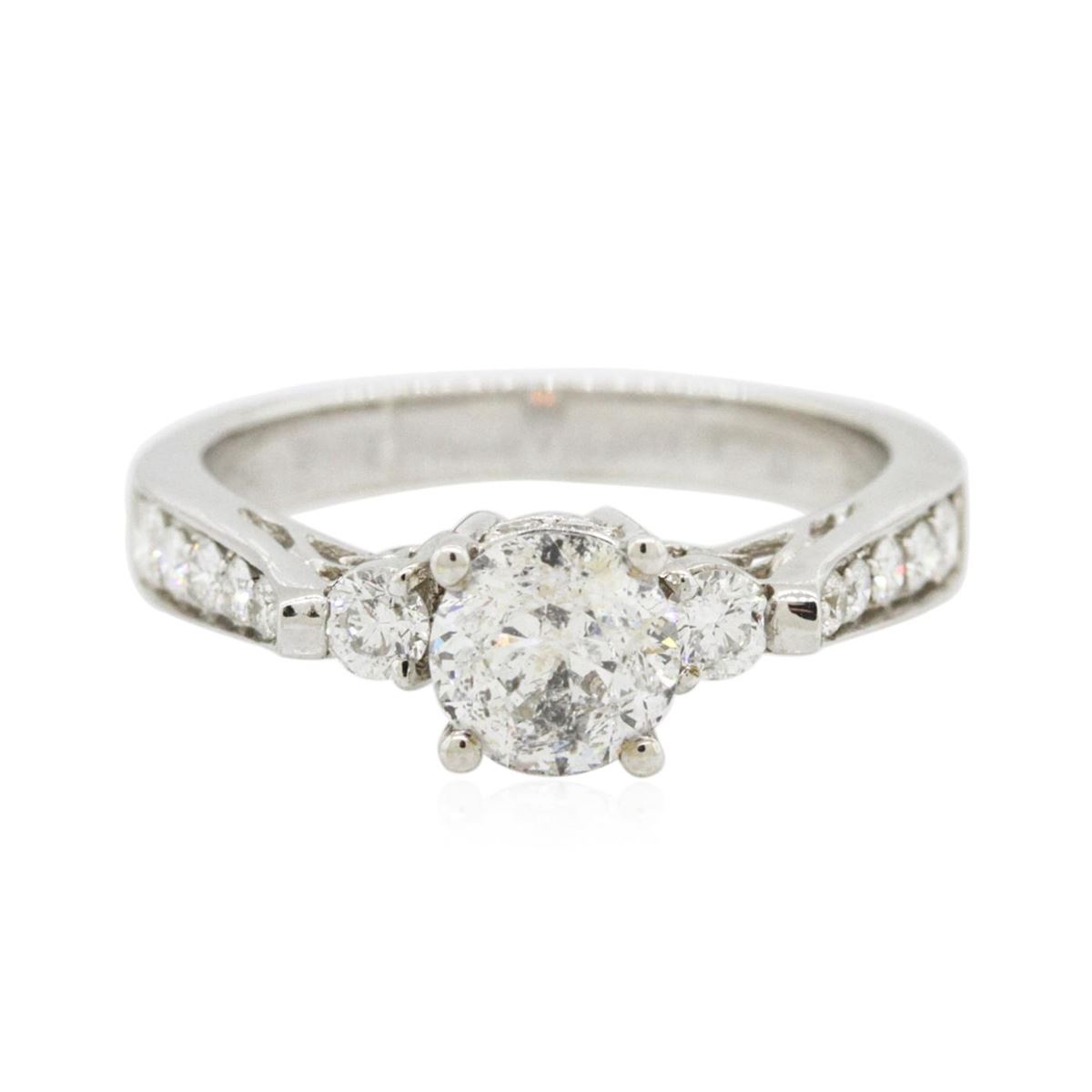 One electronically tested 18KT White Gold ladies cast diamond unity ring with a bright polish finish. The featured diamond is supported by diamond set shoulders, completed by a two and one-half millimeter wide band. Identified with markings of "18K 750". Condition is new, good workmanship. Containing: One prong set round brilliant cut diamond, measuring 5.95 - 5.90 x 3.85mm (depth est.), 4.00.% GTCF approximate weight of 0.96ct with a faint blue fluorescence. Graded in the setting. Clarity: I-2. Color: F. Depth 64.9%. Table 51.4%. Sixteen prong set round brilliant cut diamonds approximate total weight of 16 Stones = 0.44ct. Graded in the setting. Clarity: VS-1 to SI-1. Color: G - I. Total Weight of Diamonds 1.40ct. Total Weight of Unity Ring 4.14 grams. AIG Appraised at $9,875.00.