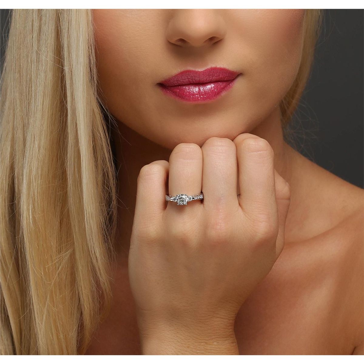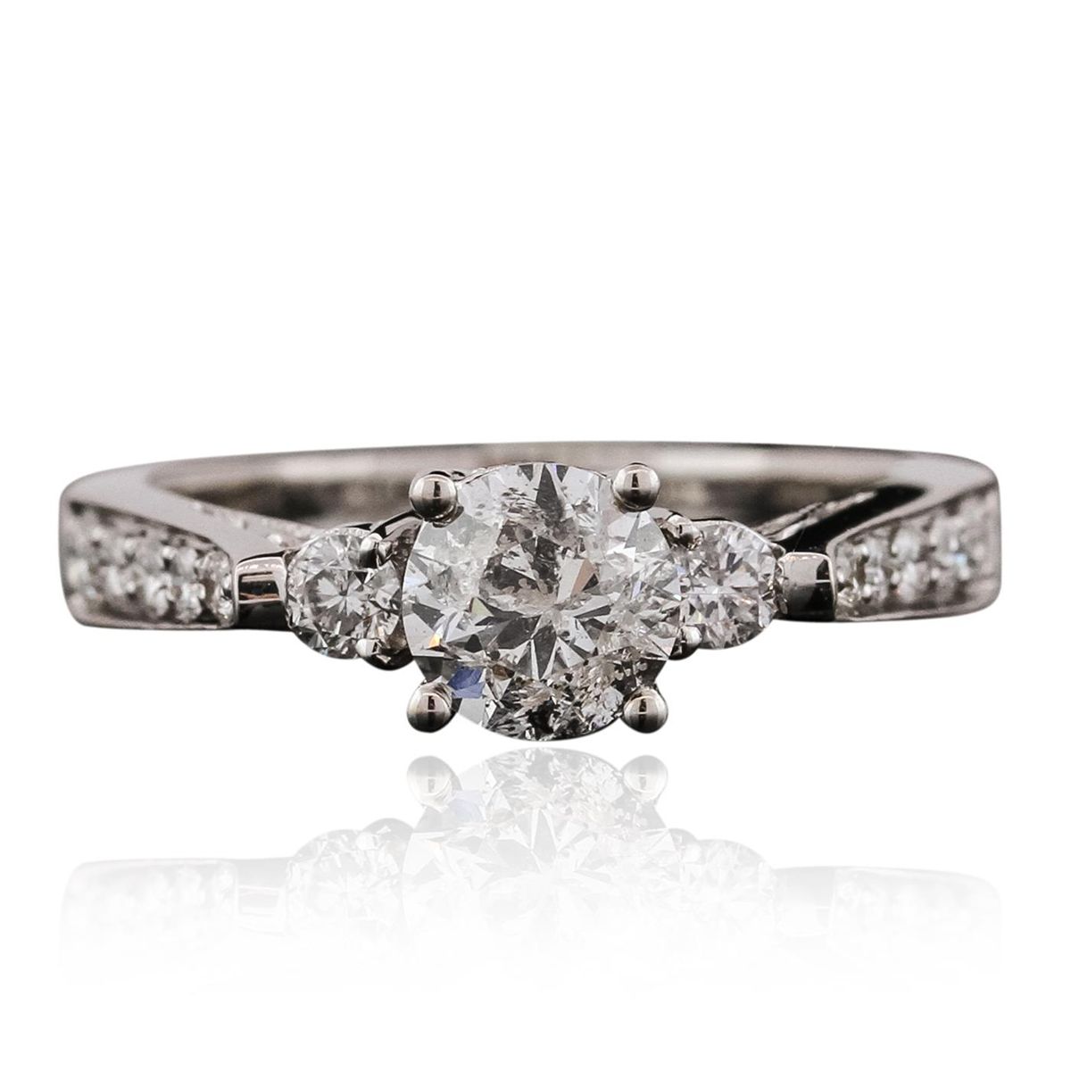 One electronically tested 18KT White Gold ladies cast diamond unity ring with a bright polish finish. The featured diamond is supported by diamond set shoulders, completed by a two and one-half millimeter wide band. Identified with markings of "18K 750". Condition is new, good workmanship. Containing: One prong set round brilliant cut diamond, measuring 5.95 - 5.90 x 3.85mm (depth est.), 4.00.% GTCF approximate weight of 0.96ct with a faint blue fluorescence. Graded in the setting. Clarity: I-2. Color: F. Depth 64.9%. Table 51.4%. Sixteen prong set round brilliant cut diamonds approximate total weight of 16 Stones = 0.44ct. Graded in the setting. Clarity: VS-1 to SI-1. Color: G - I. Total Weight of Diamonds 1.40ct. Total Weight of Unity Ring 4.14 grams. AIG Appraised at $9,875.00.