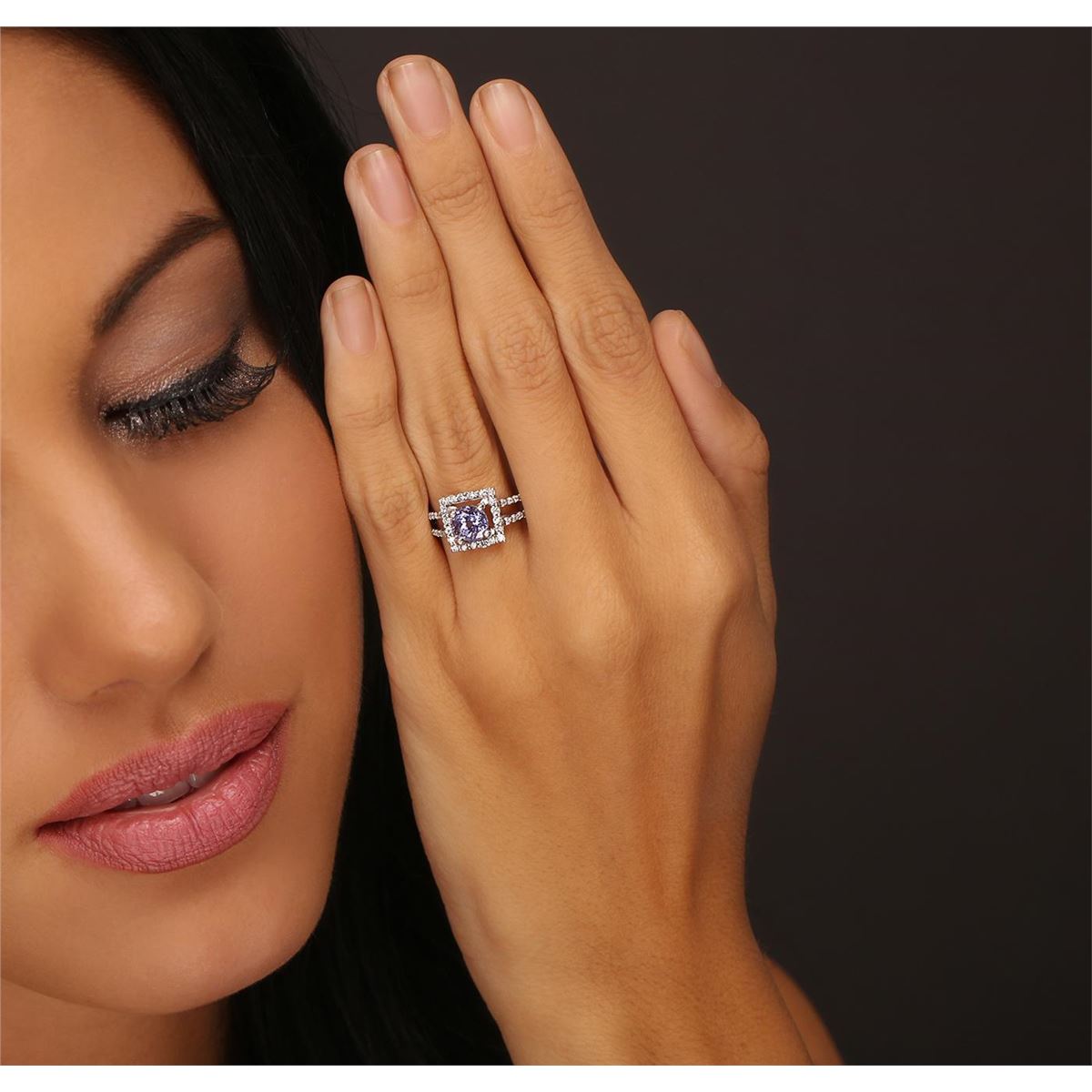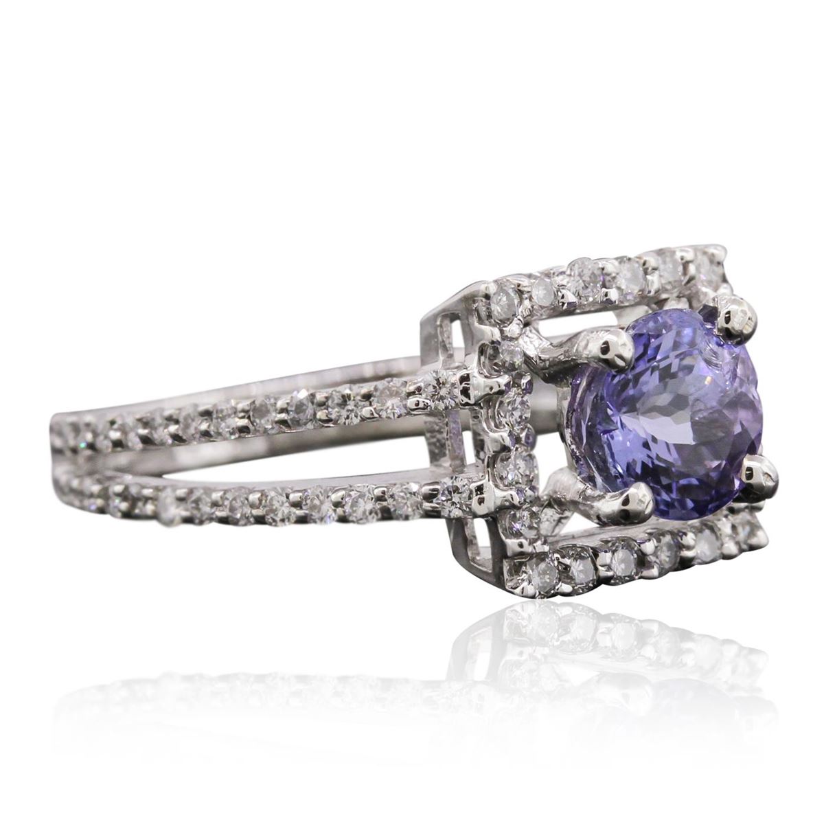 One electronically tested 18KT white gold Ladies combination cast & assembled ring with a bright polish finish. Condition is new. Identified with markings of "18K". Containing: One prong set round modified brilliant cut natural tanzanite, measuring 6.50 - 6.50 x 5.00 mm, approximate weight of 1.42ct., clarity is eye clean, type I, medium light, very slightly grayish, violet color, (GIA V 4/3), cut is good. Colored gemstones are presumed to have been subjected to commonly used color/clarity enhancement processes. Seventy-Six prong set round brilliant cut diamonds, measuring 1.30 - 1.30 x 0.78mm (depth est.) approximate. Total Weight of 76 Stones = 0.61ct. Clarity: I-1 to I-2. Color: I - J, Cut is Good. Total Weight of Colored Stones 1.42ct. Total Weight of Diamonds 0.61ct. Total Weight of Ring 4.90 grams. GGL Appraised at $5,665.00.