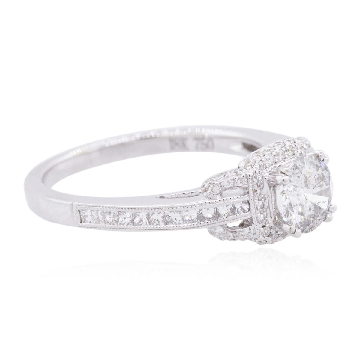 One electronically tested 18KT white gold ladies cast diamond unity ring. The featured diamond is set within a diamond bezel supported by elaborate diamond set shoulders, completed by a two millimeter wide band. Bright polish finish with milgrain detailing. Identified with markings of "18K 750". Condition is new, good workmanship. Containing: One prong set round brilliant cut diamond, measuring 5.70 - 5.65 x 3.50mm (depth est.) approximate weight of 0.80ct with a faint blue fluorescence. Graded in the setting. Clarity: I-1. Color: 61.6%. Table 63.4%. Twenty-Two channel set princess cut diamonds, measuring 1.40 x 1.20 x 0.90mm (depth est.) approximate total weight of 22 Stones = 0.37ct. Graded in the setting. Clarity: VS-1 to SI-1. Color: F - H Fifty-Six bead set round brilliant cut diamonds, measuring 1.00 - 1.00 x 0.60mm (depth est.) approximate total weight of 56 Stones = 0.25ct. Graded in the setting. Clarity: VS-1 to SI-1. Color: F - H. Total Weight of Diamonds 1.42ct. Total Weight of Ring 4.06 grams. AIG Appraised at $10,220.00.