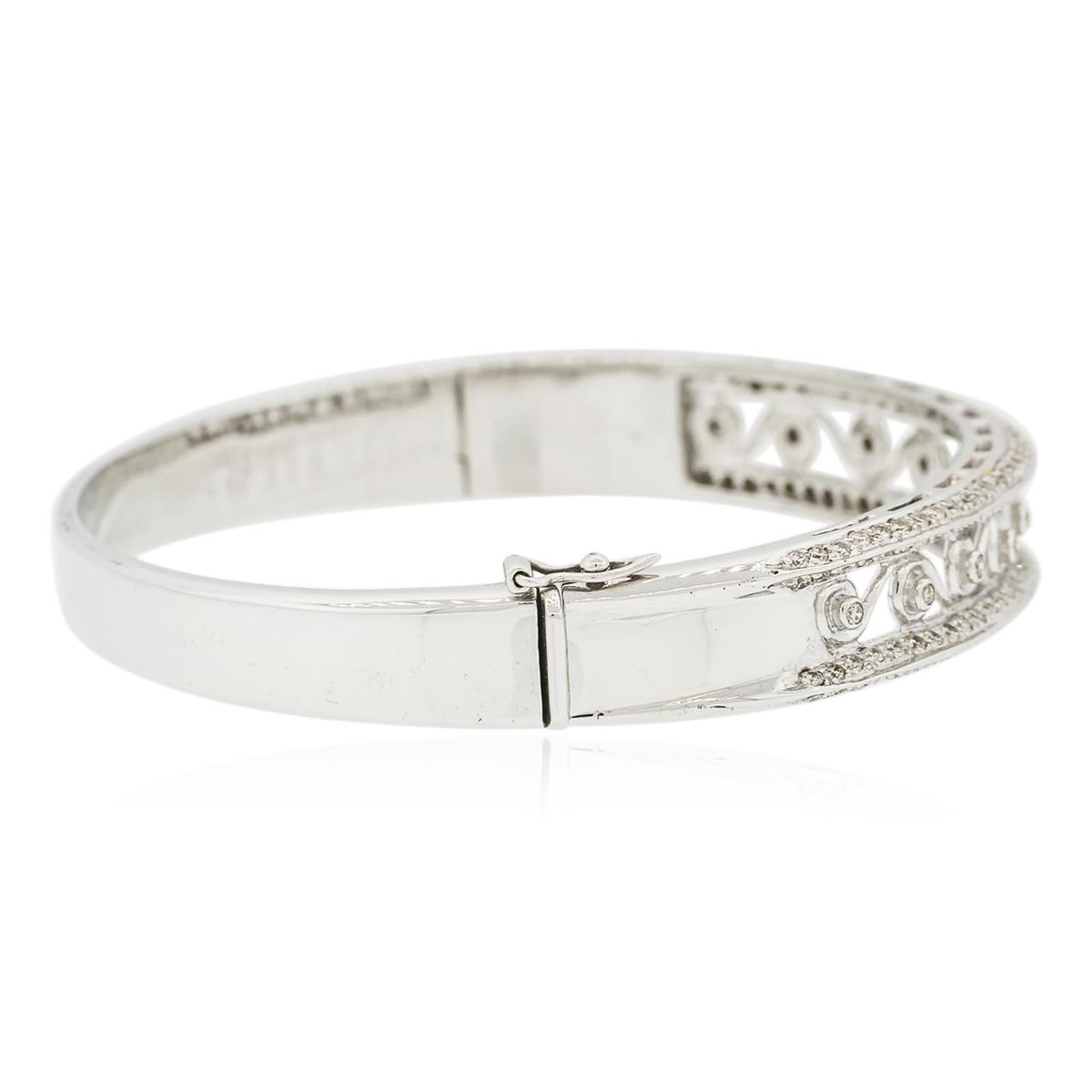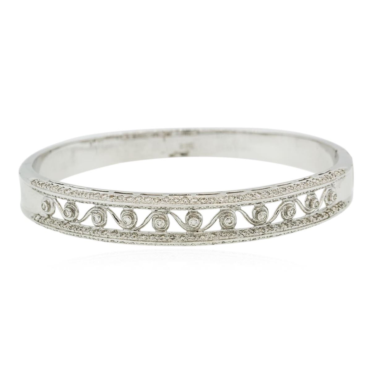 One electronically tested 18KT white gold ladies combination cast & assembled bangle bracelet with a bright polish finish. Measurements: 2.5" x 2.2". Identified with markings of "750". Condition is new. Containing: One Hundred Sixty-Two prong set round brilliant cut diamonds, measuring 1.30 - 1.30 x 0.78mm (depth est.) approximate total weight of 162 Stones = 1.30ct. Clarity: SI-1 to SI-2. Color: J - K, Cut is Good. Eleven bezel set round brilliant cut diamonds, measuring 1.50 - 1.50 x 0.90mm (depth est.) approximate total weight of 11 Stones = 0.14ct. Clarity: SI-2. Color: J, Cut is Good. All diamonds are graded in the mounting, unless otherwise stated. Total Weight of Diamonds 1.43ct. Total Weight of Bracelet 34.90 grams. GGL Appraised at $9,215.00.