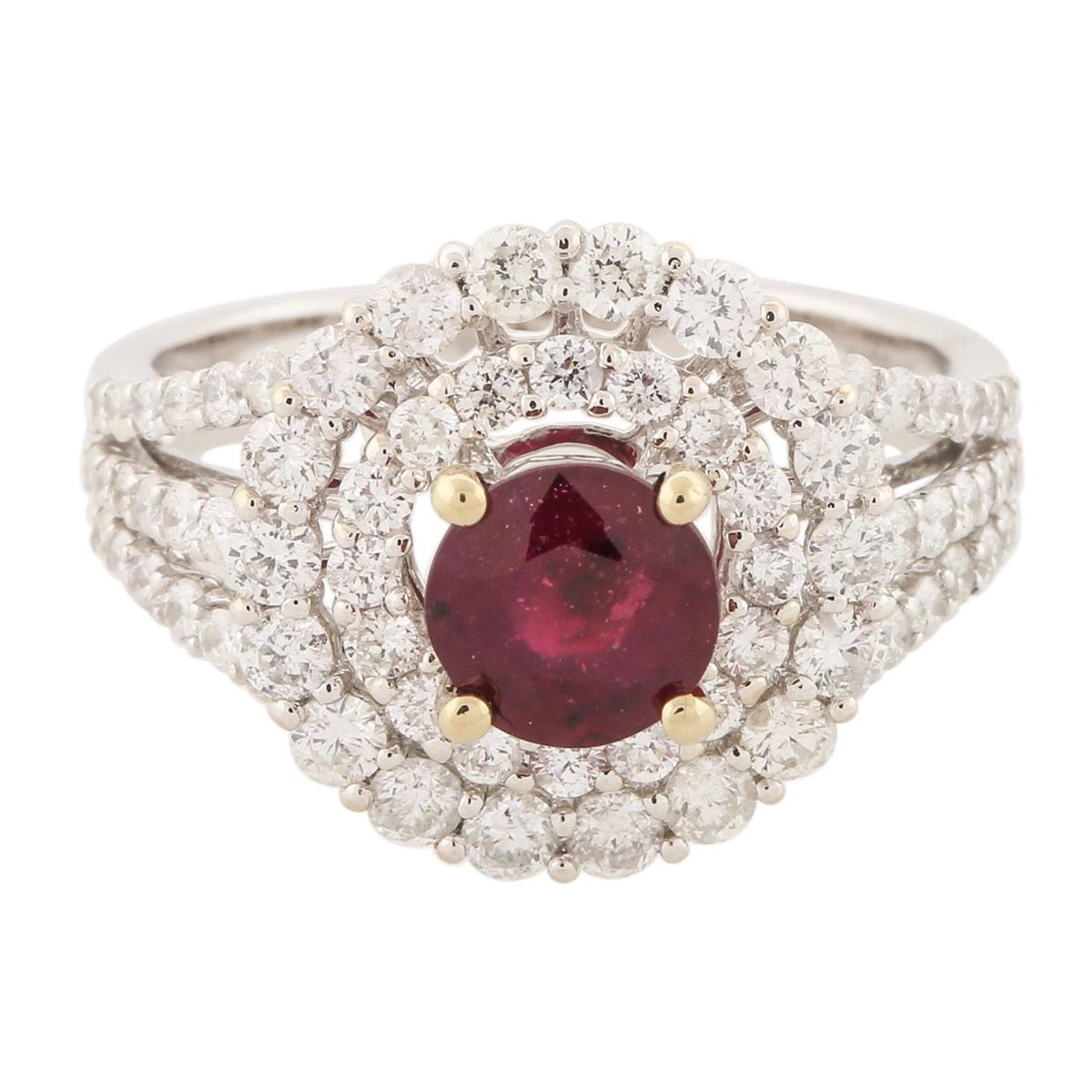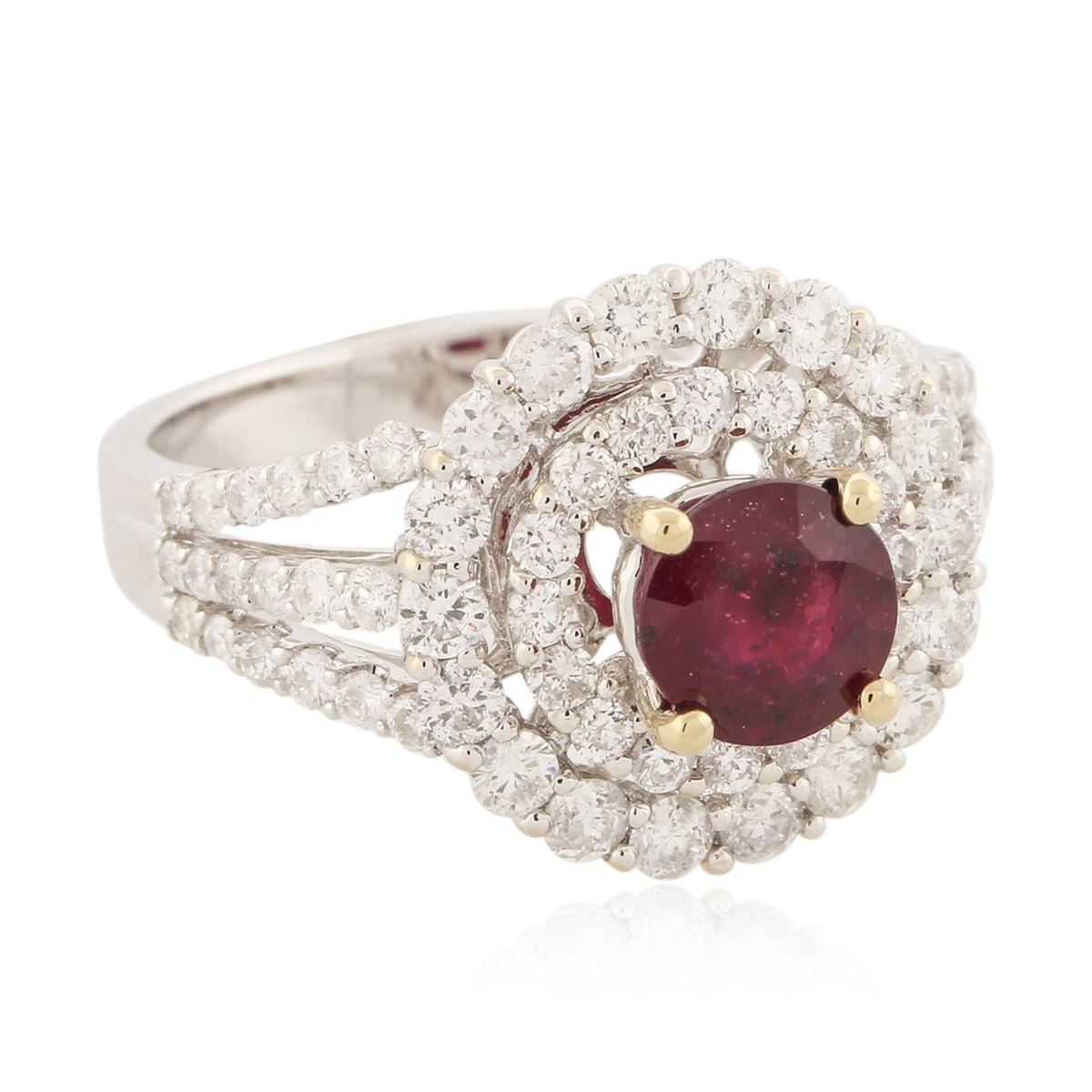 One electronically tested 18KT white gold Ladies combination cast & assembled fashion ring with a bright polish finish. Condition is new. Identified with markings of "750". Containing: Thirty-Six prong set round brilliant cut diamonds, measuring 1.30 - 1.30 x 0.78mm (depth est.) approximate. Total Weight of 36 Stones = 0.36ct. Clarity: I-1. Color: G, Cut is Good. Sixteen prong set round brilliant cut diamonds, measuring 1.50 - 1.50 x 0.90mm (depth est.) approximate. Total Weight of 16 Stones = 0.20ct. Clarity: I-1. Color: G - H, Cut is Good. Eighteen prong set round brilliant cut diamonds, measuring 2.10 - 2.10 x 1.26mm (depth est.) approximate. Total Weight of 18 Stones = 0.91ct. Clarity: SI-2 to I-1. Color: G, Cut is Good. One prong set round modified brilliant cut natural ruby, measuring 6.20 - 6.20 x 4.14 mm, approximate weight of 1.43ct., clarity is heavily included, medium dark, moderately strong, strongly purplish red color, (GIA stpR 6/4), cut is good. Colored gemstones are presumed to have been subjected to commonly used color/clarity enhancement processes. Total Weight of Colored Stones 1.43ct. Total Weight of Diamonds 1.47ct. Total Weight of Ring 5.50 grams. GGL Appraised at $4,470.00.