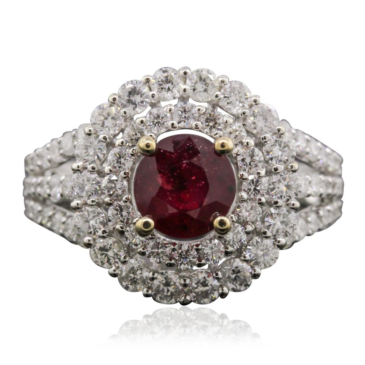 One electronically tested 18KT white gold Ladies combination cast & assembled fashion ring with a bright polish finish. Condition is new. Identified with markings of "750". Containing: Thirty-Six prong set round brilliant cut diamonds, measuring 1.30 - 1.30 x 0.78mm (depth est.) approximate. Total Weight of 36 Stones = 0.36ct. Clarity: I-1. Color: G, Cut is Good. Sixteen prong set round brilliant cut diamonds, measuring 1.50 - 1.50 x 0.90mm (depth est.) approximate. Total Weight of 16 Stones = 0.20ct. Clarity: I-1. Color: G - H, Cut is Good. Eighteen prong set round brilliant cut diamonds, measuring 2.10 - 2.10 x 1.26mm (depth est.) approximate. Total Weight of 18 Stones = 0.91ct. Clarity: SI-2 to I-1. Color: G, Cut is Good. One prong set round modified brilliant cut natural ruby, measuring 6.20 - 6.20 x 4.14 mm, approximate weight of 1.43ct., clarity is heavily included, medium dark, moderately strong, strongly purplish red color, (GIA stpR 6/4), cut is good. Colored gemstones are presumed to have been subjected to commonly used color/clarity enhancement processes. Total Weight of Colored Stones 1.43ct. Total Weight of Diamonds 1.47ct. Total Weight of Ring 5.50 grams. GGL Appraised at $4,470.00.