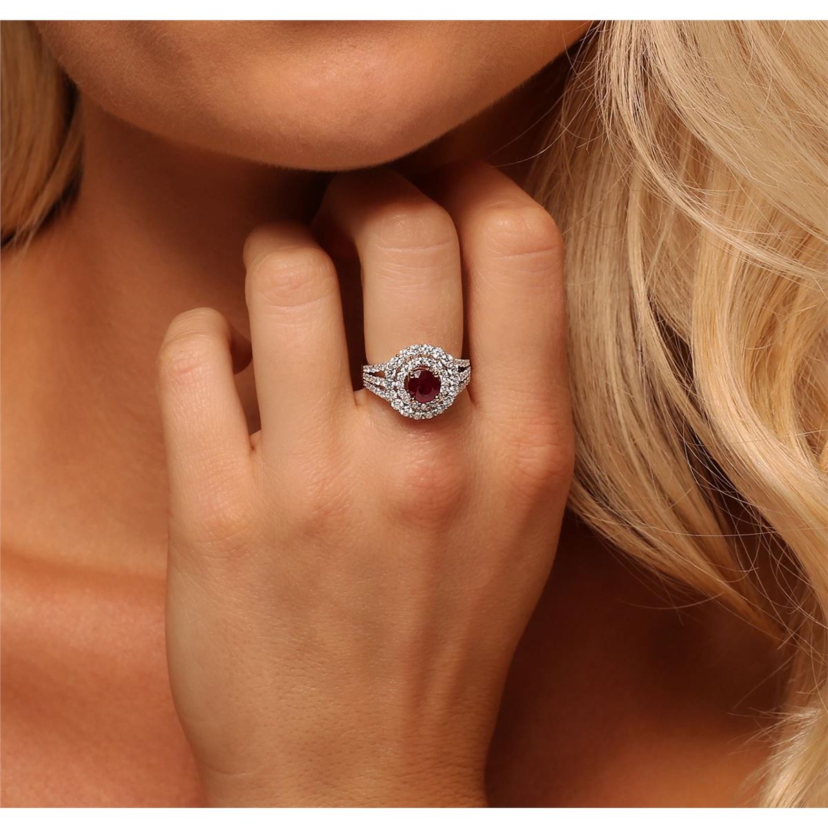 One electronically tested 18KT white gold Ladies combination cast & assembled fashion ring with a bright polish finish. Condition is new. Identified with markings of "750". Containing: Thirty-Six prong set round brilliant cut diamonds, measuring 1.30 - 1.30 x 0.78mm (depth est.) approximate. Total Weight of 36 Stones = 0.36ct. Clarity: I-1. Color: G, Cut is Good. Sixteen prong set round brilliant cut diamonds, measuring 1.50 - 1.50 x 0.90mm (depth est.) approximate. Total Weight of 16 Stones = 0.20ct. Clarity: I-1. Color: G - H, Cut is Good. Eighteen prong set round brilliant cut diamonds, measuring 2.10 - 2.10 x 1.26mm (depth est.) approximate. Total Weight of 18 Stones = 0.91ct. Clarity: SI-2 to I-1. Color: G, Cut is Good. One prong set round modified brilliant cut natural ruby, measuring 6.20 - 6.20 x 4.14 mm, approximate weight of 1.43ct., clarity is heavily included, medium dark, moderately strong, strongly purplish red color, (GIA stpR 6/4), cut is good. Colored gemstones are presumed to have been subjected to commonly used color/clarity enhancement processes. Total Weight of Colored Stones 1.43ct. Total Weight of Diamonds 1.47ct. Total Weight of Ring 5.50 grams. GGL Appraised at $4,470.00.